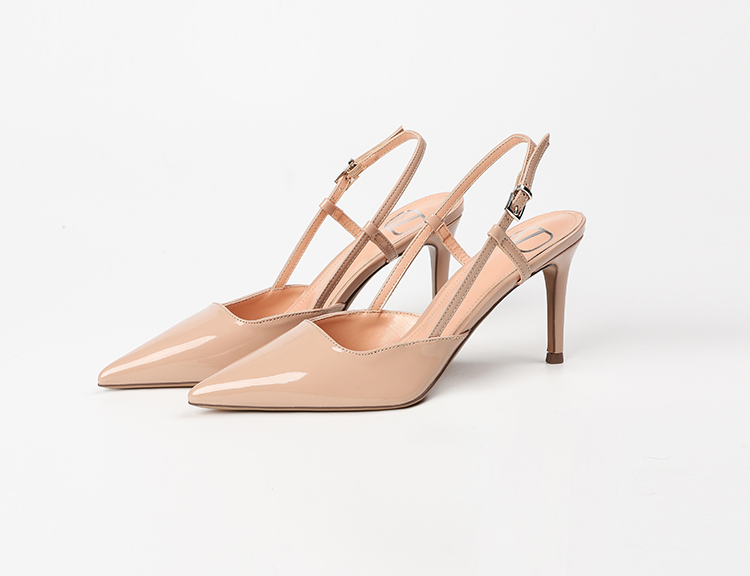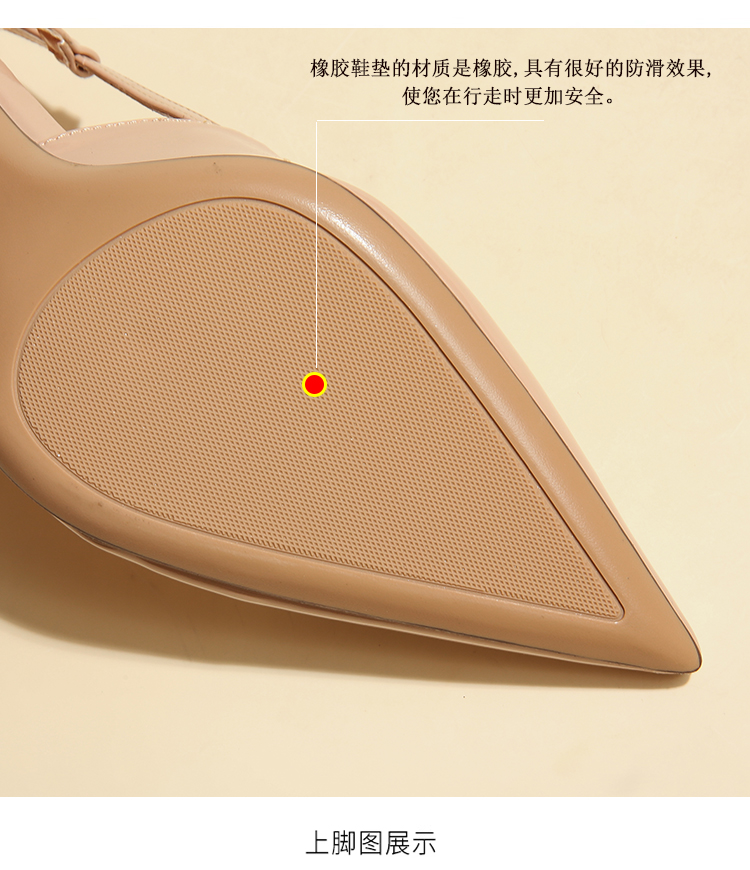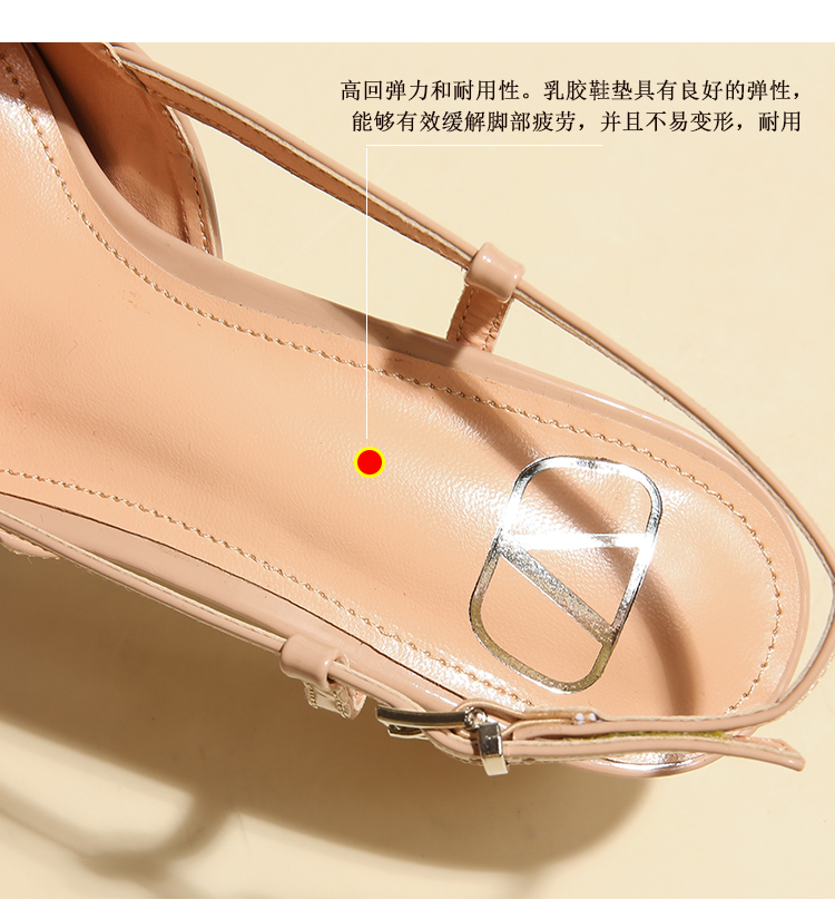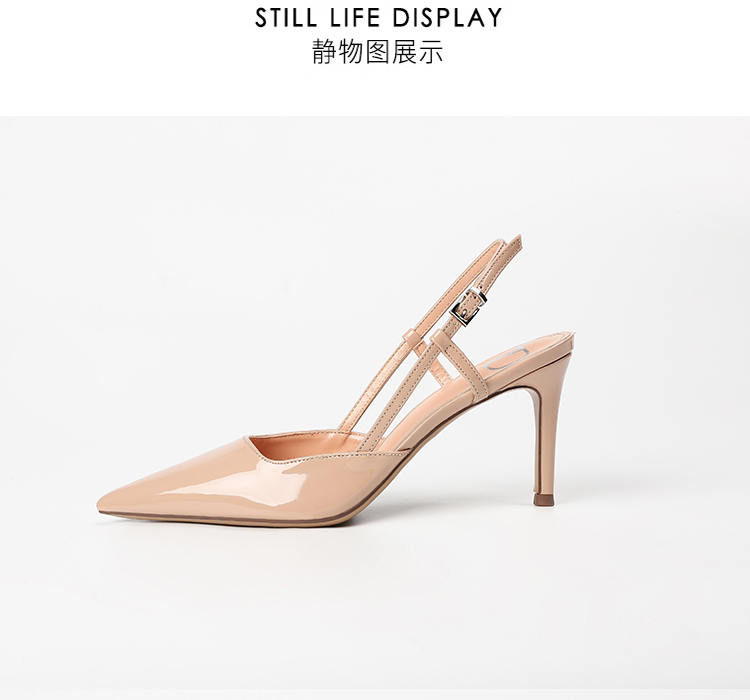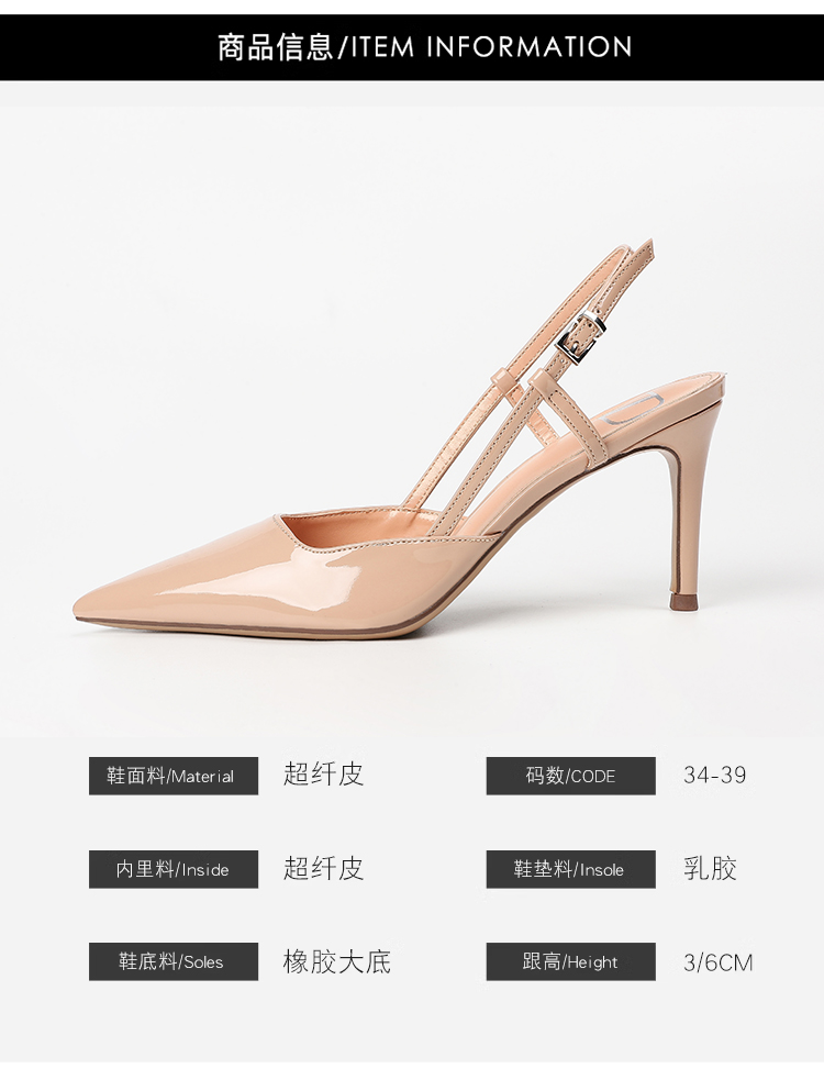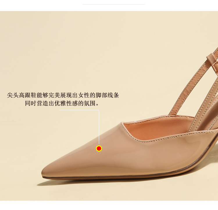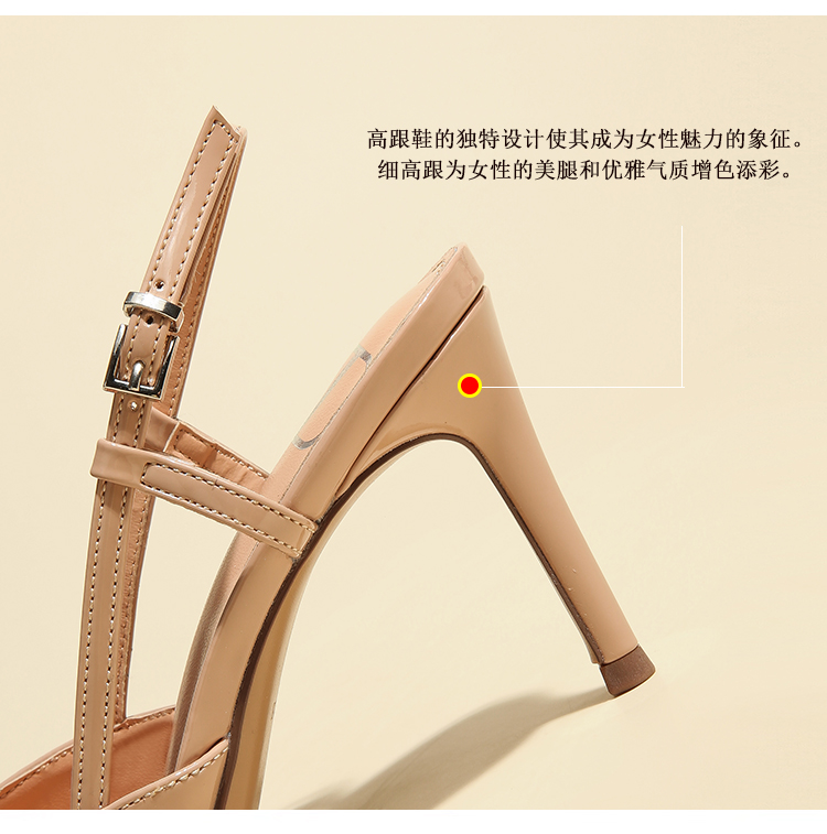 裸粉色漆皮v家高跟鞋女2024新款尖头细跟后空斩男一字带包头凉鞋