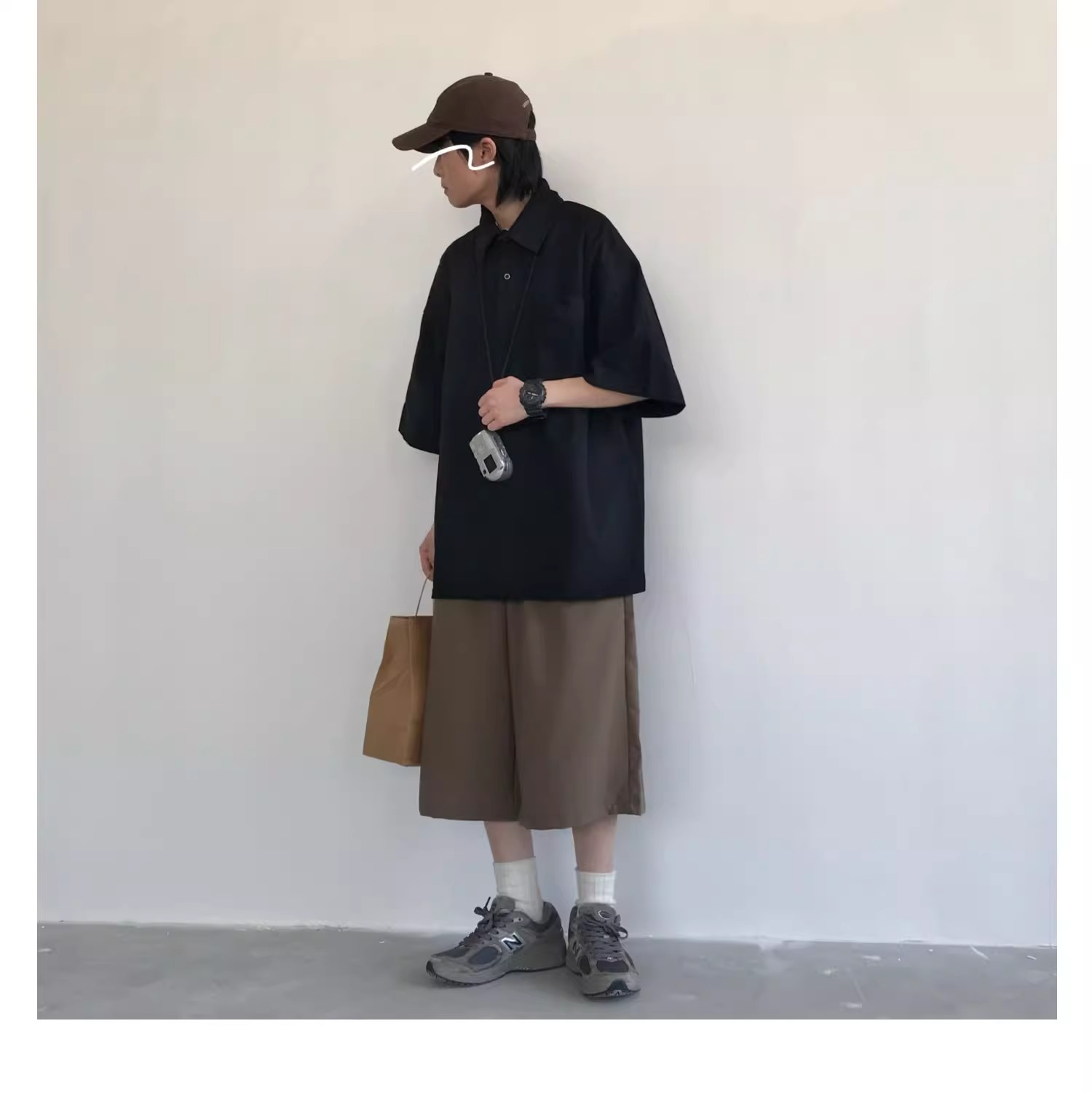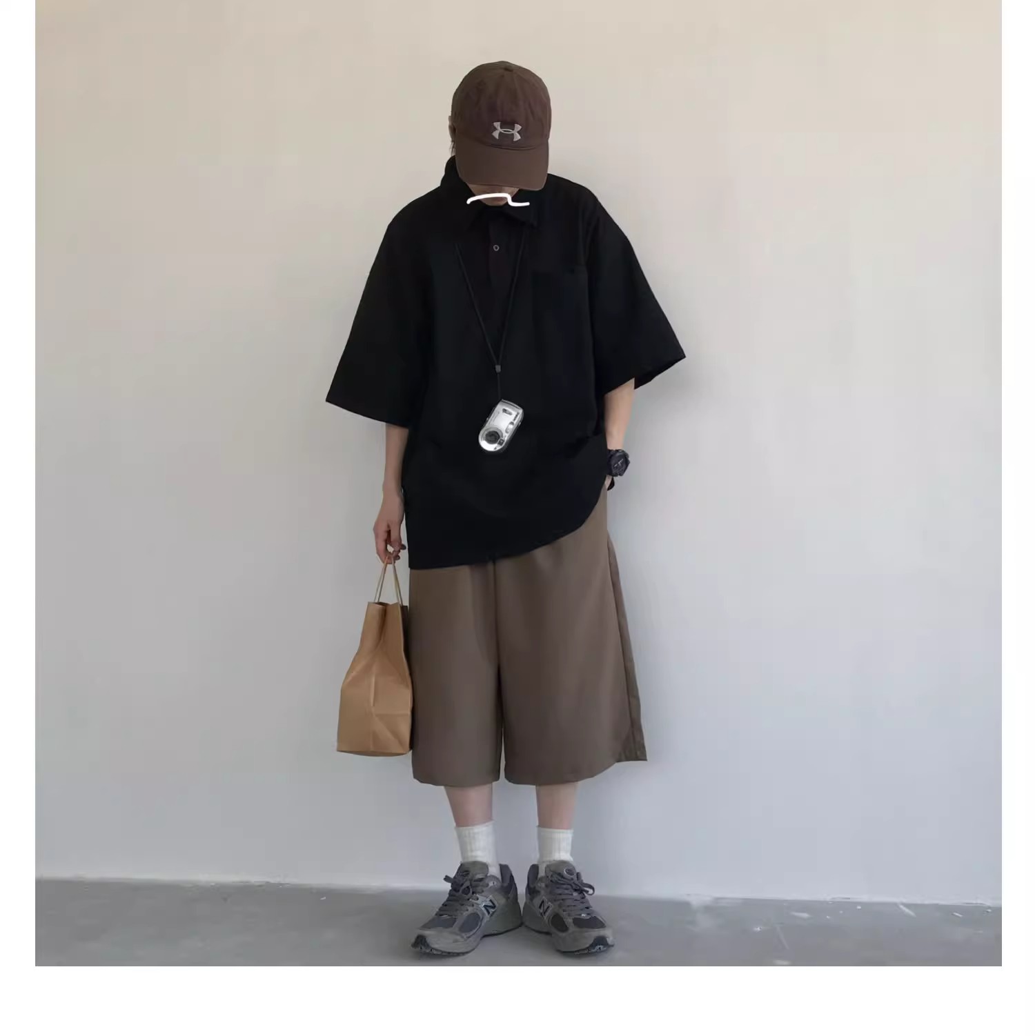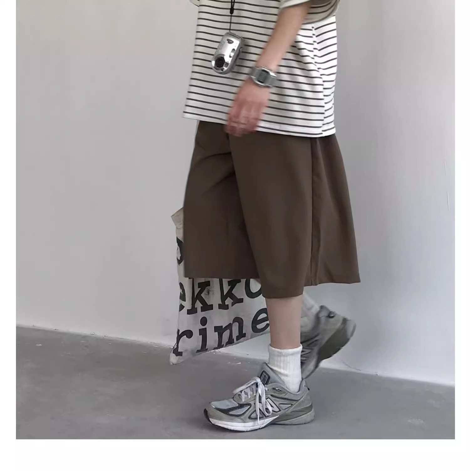 夏季日系港风咖色工装中裤男女宽松阔腿裤原宿风短裤休闲百搭西裤