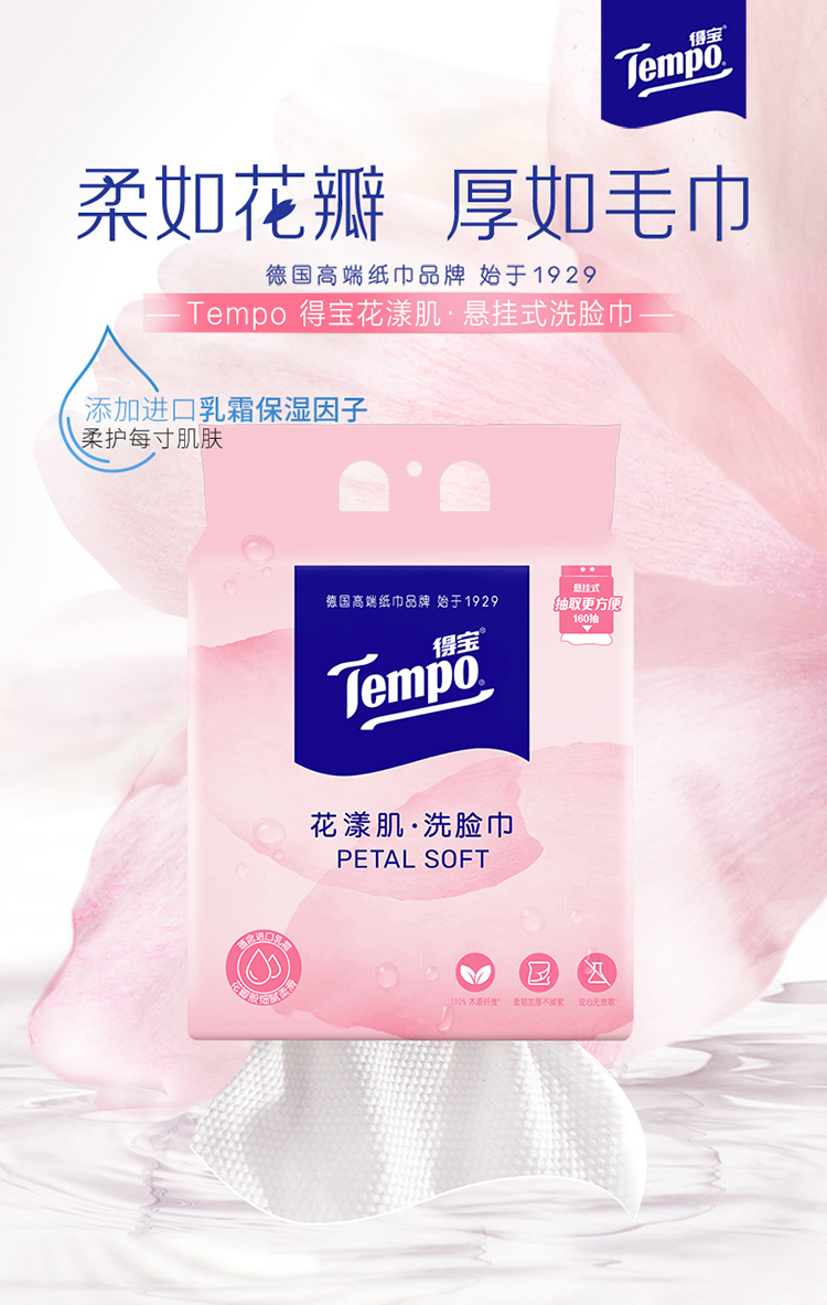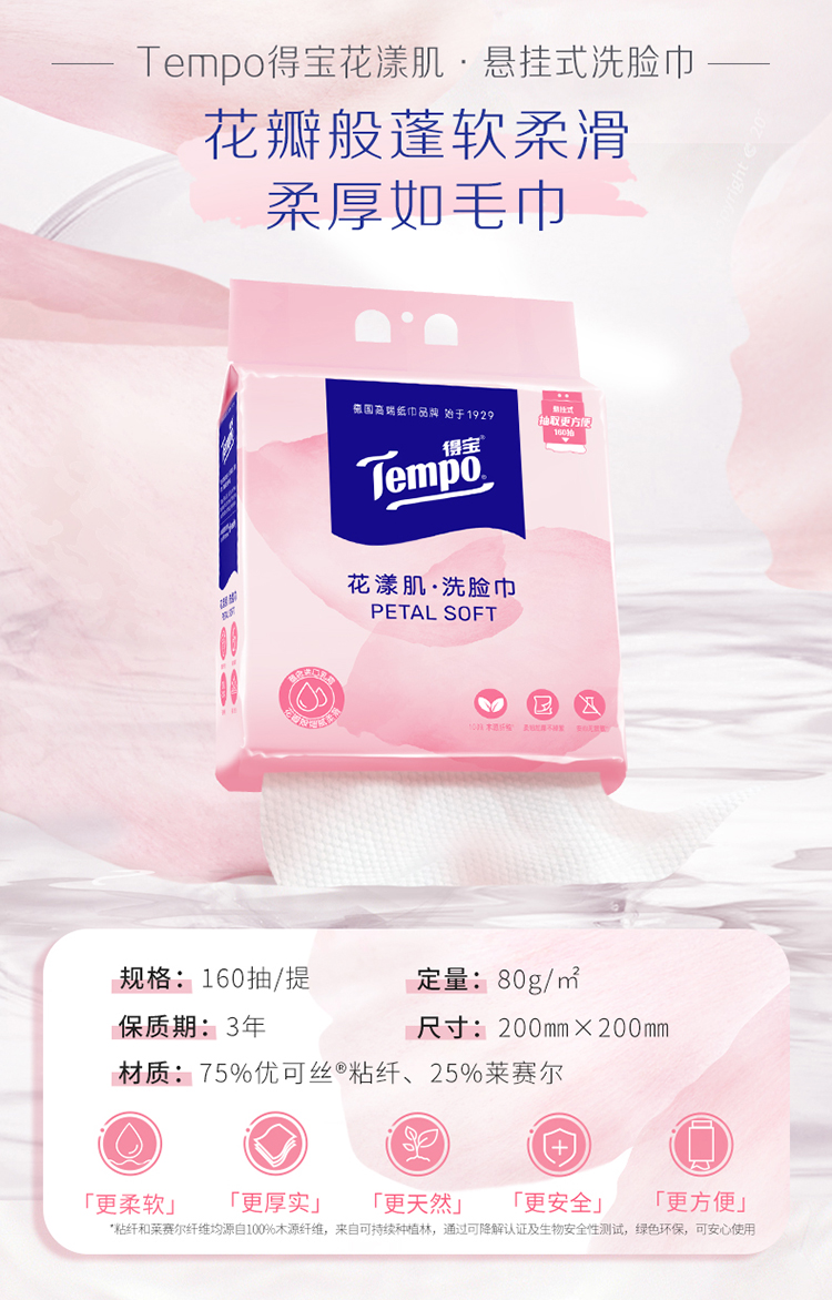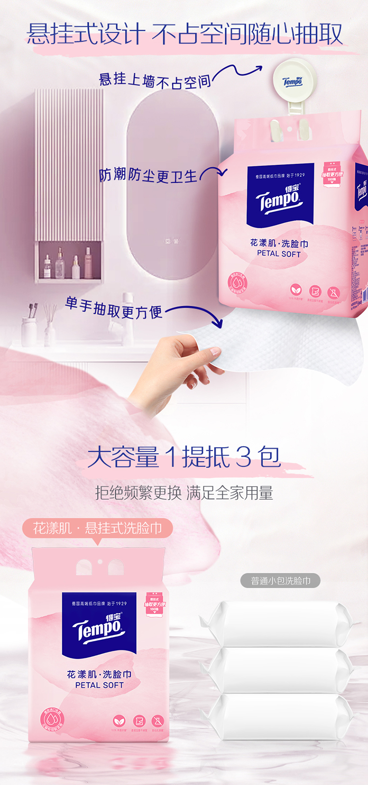 Tempo/得宝洗脸巾蓬松加厚花漾肌悬挂式160抽*1包