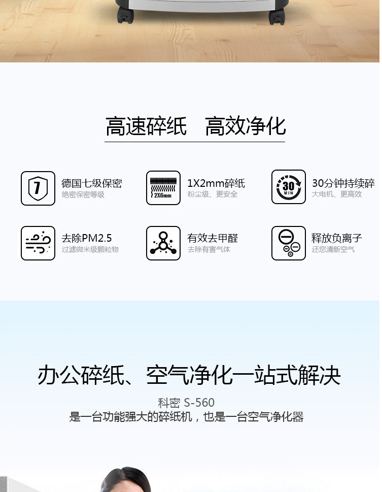 科密S-560碎纸机办公商用家用除菌净化7级保密多功能文件粉碎机