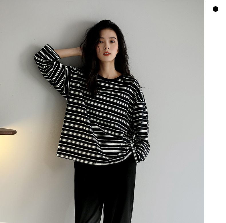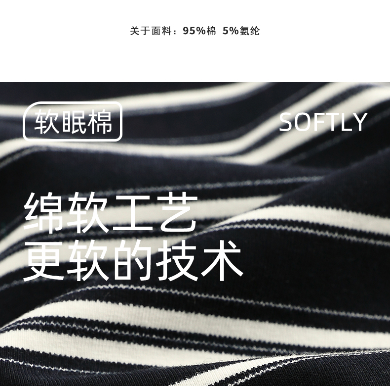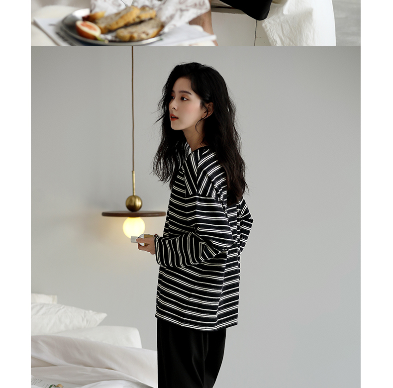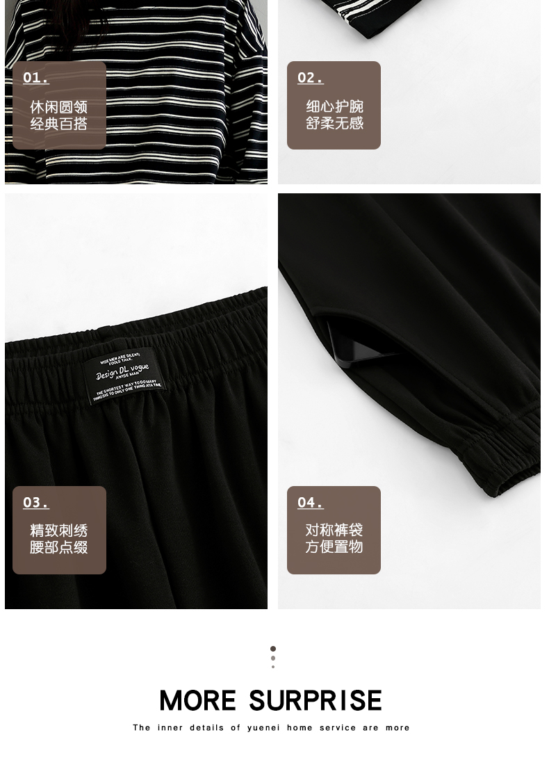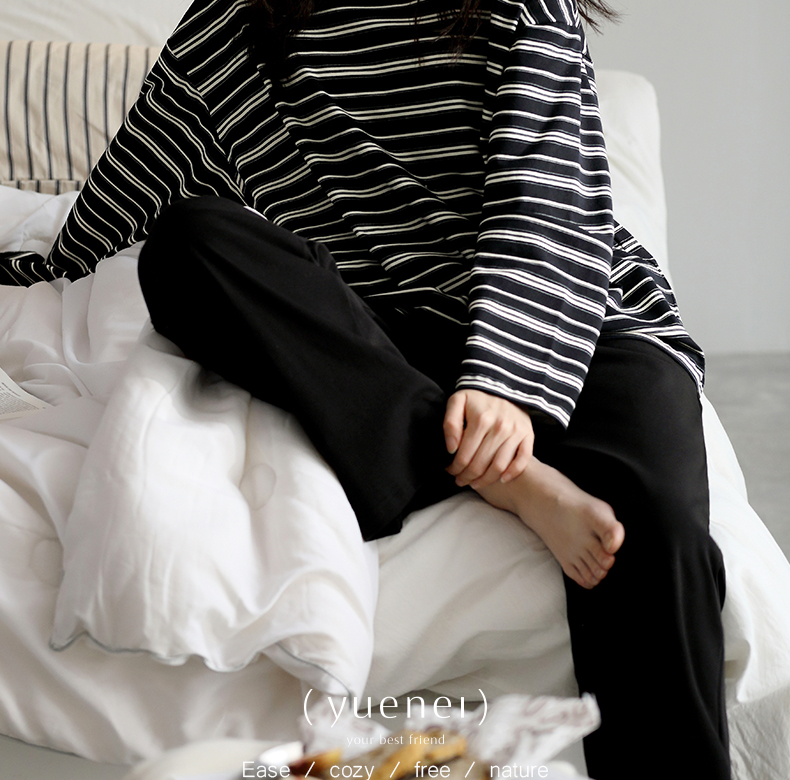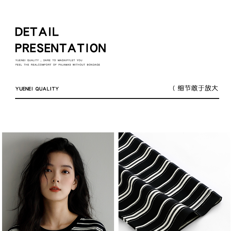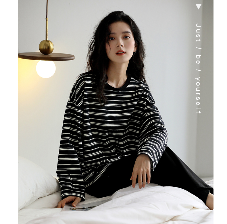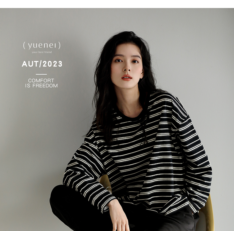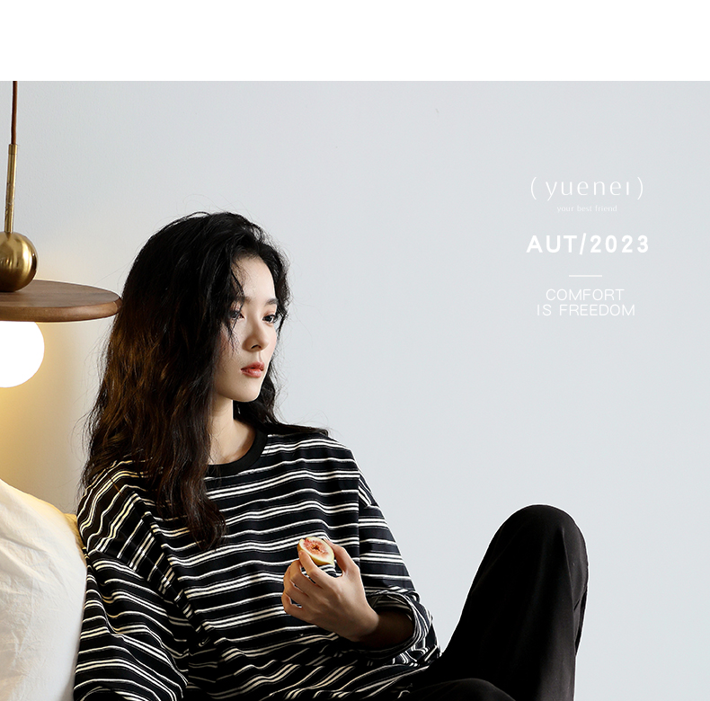 悦内睡衣女士春秋款秋季纯棉长袖家居服休闲可外穿条纹圆领套头
