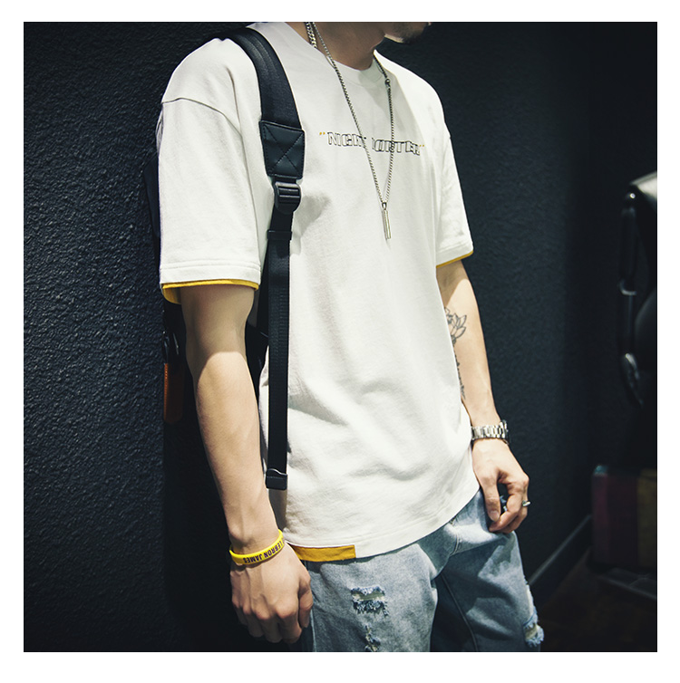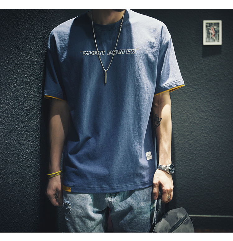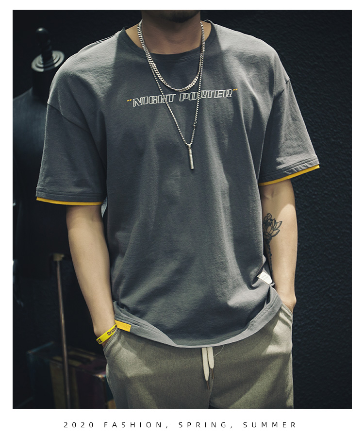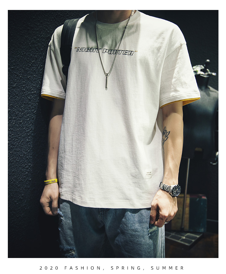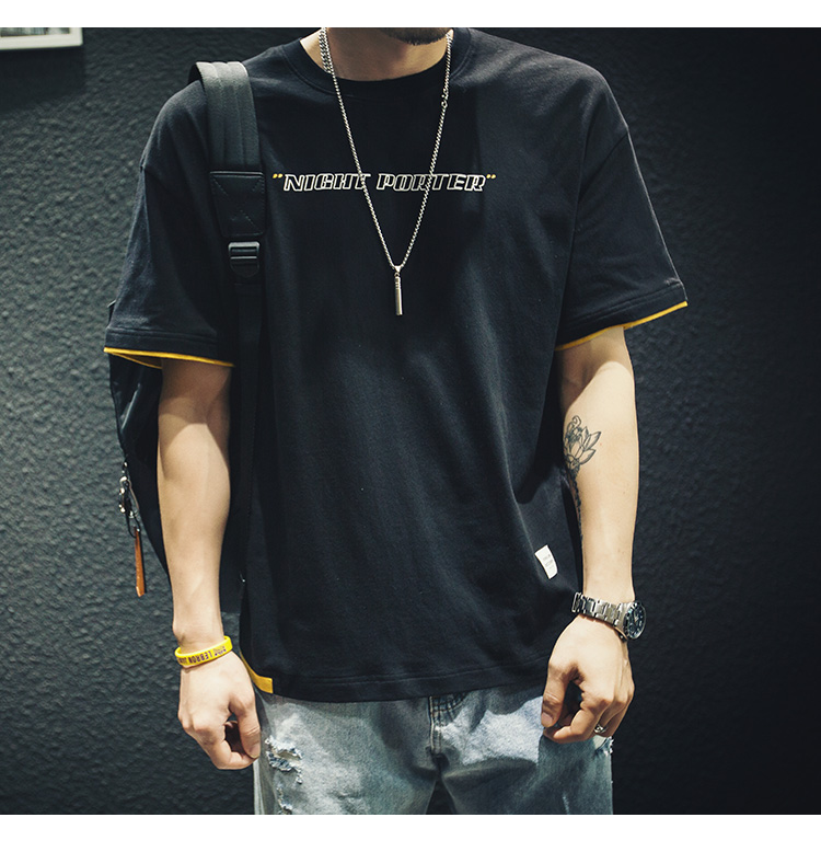 夏季纯棉短袖t恤男宽松潮牌假两件ins半袖大码胖子加肥加大体恤潮