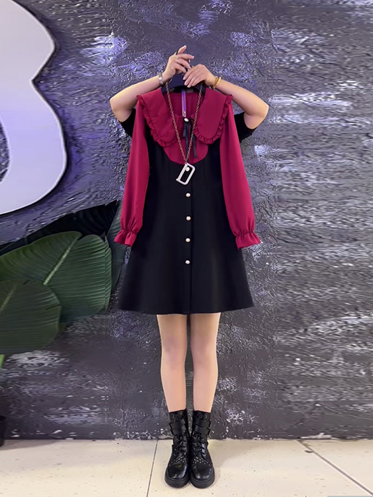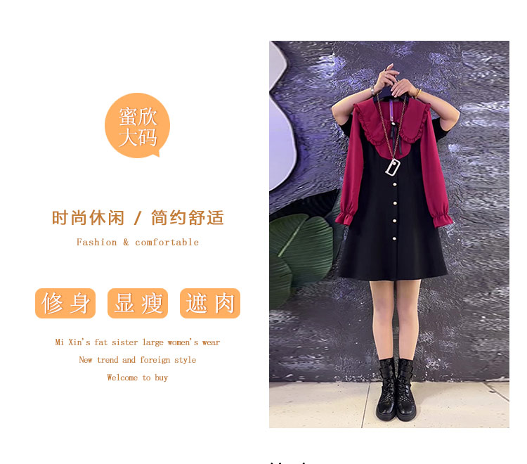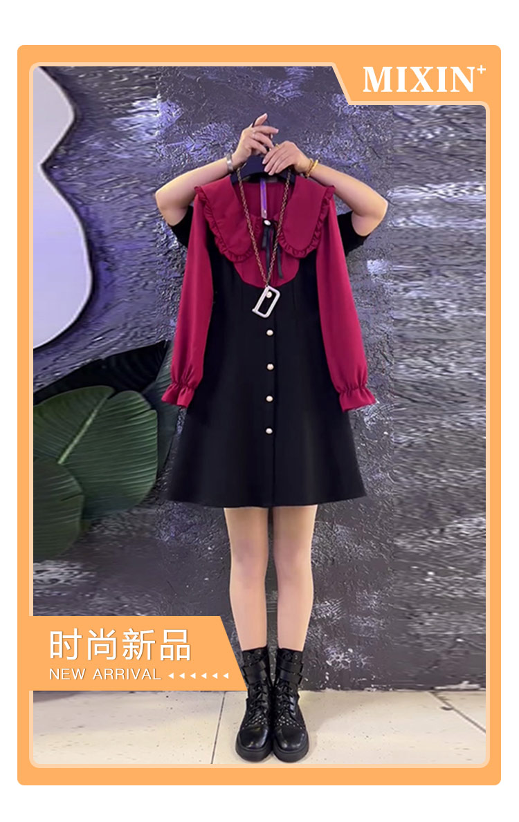 加肥大码女装翻领荷叶边长袖拼色吊带连衣裙胖妹妹通勤风显瘦裙子