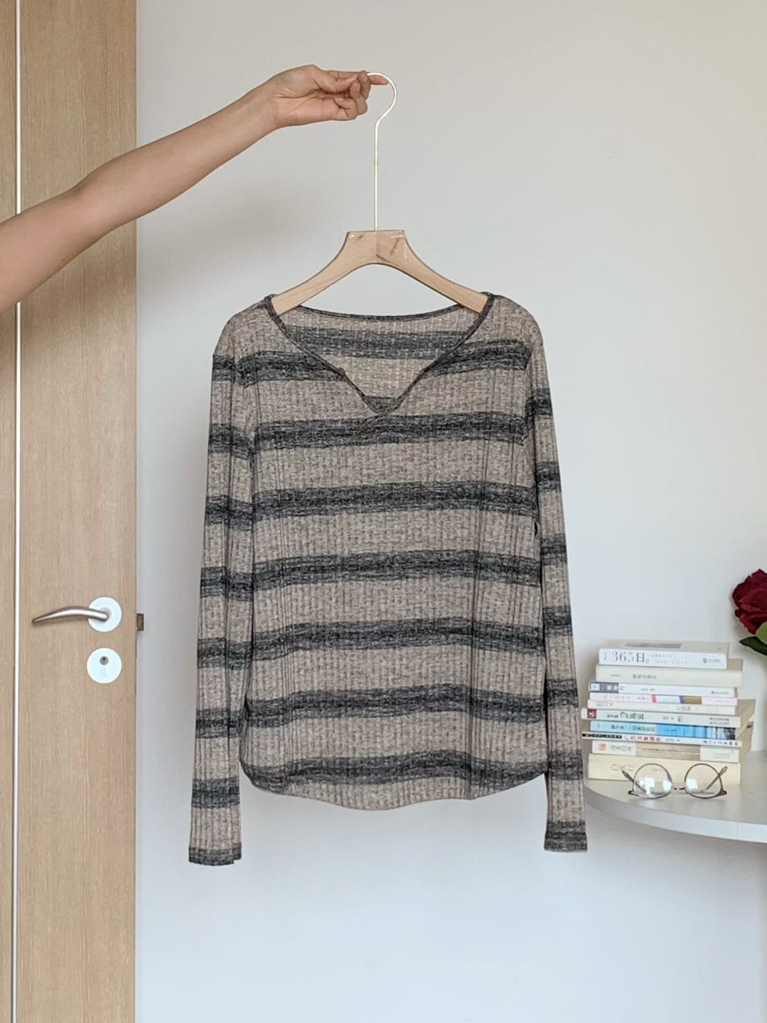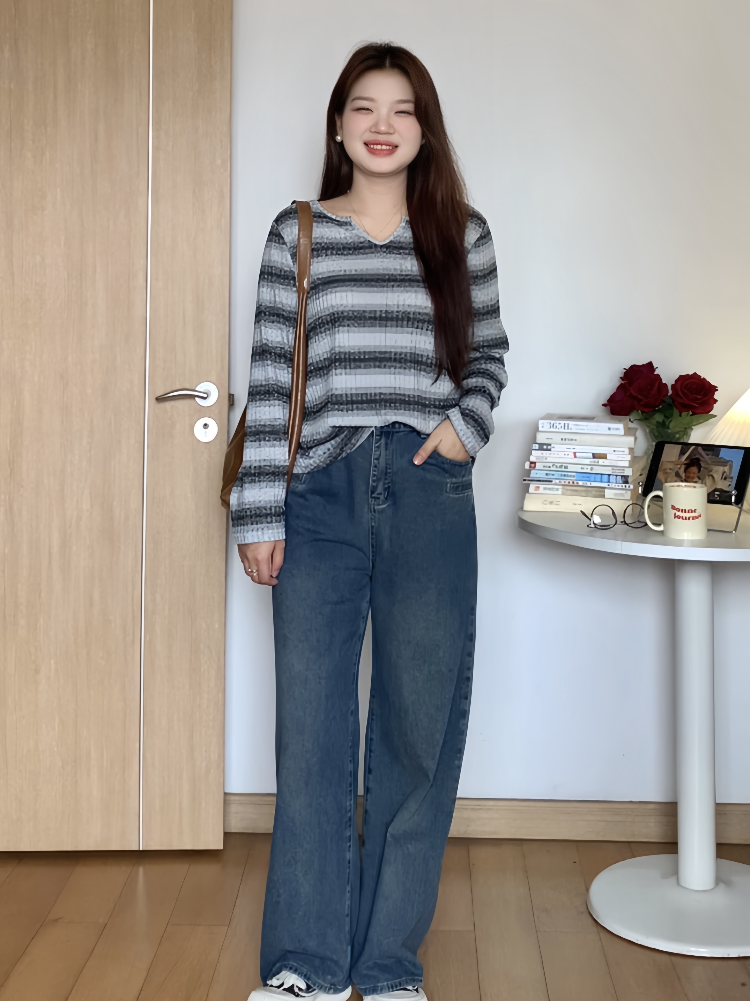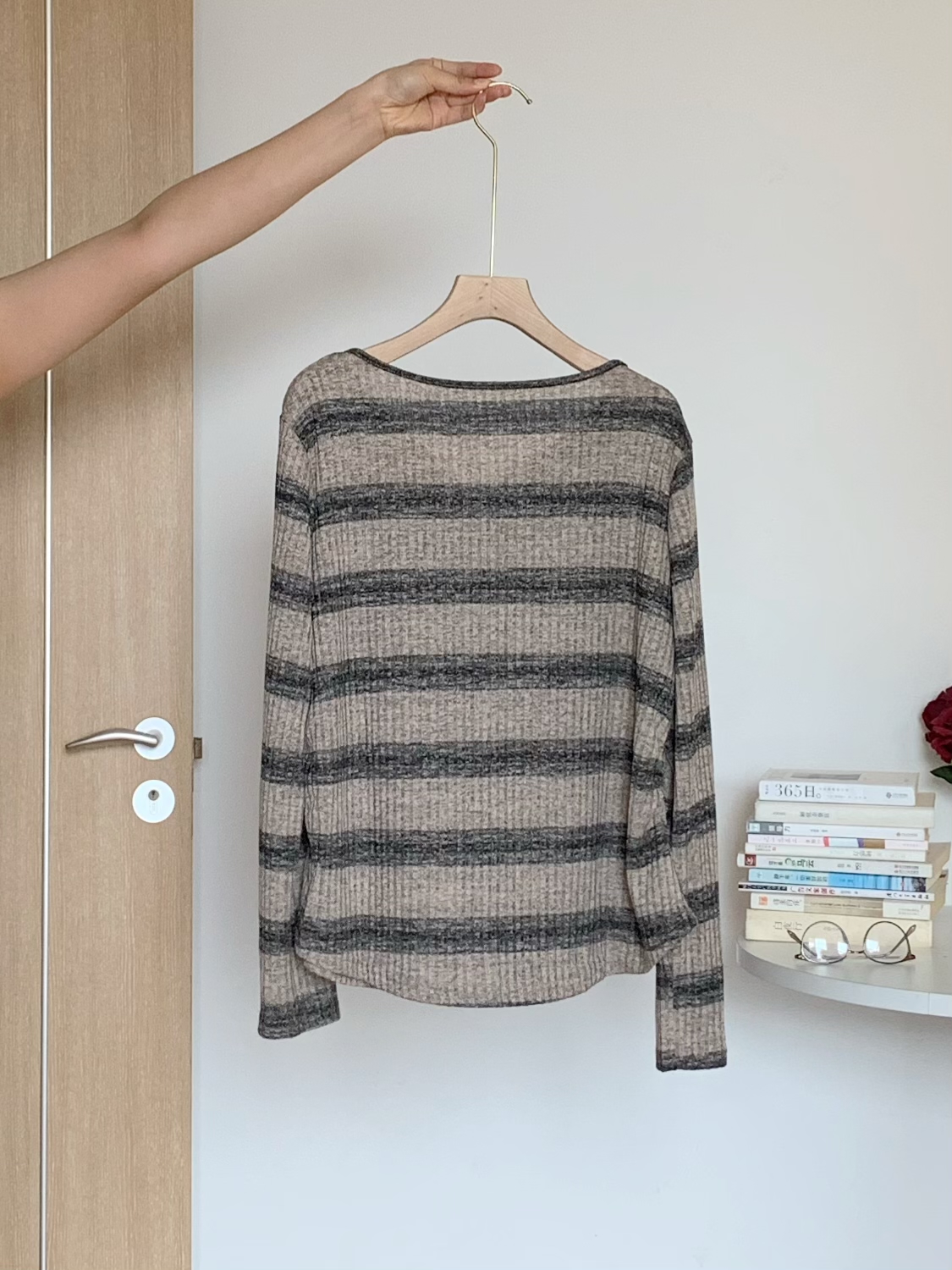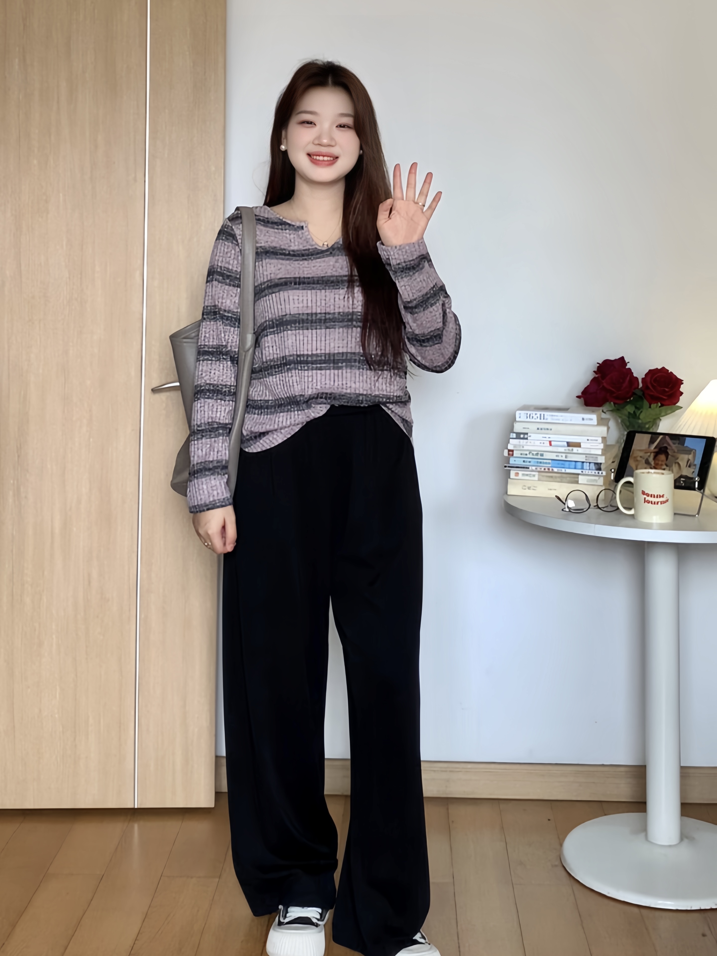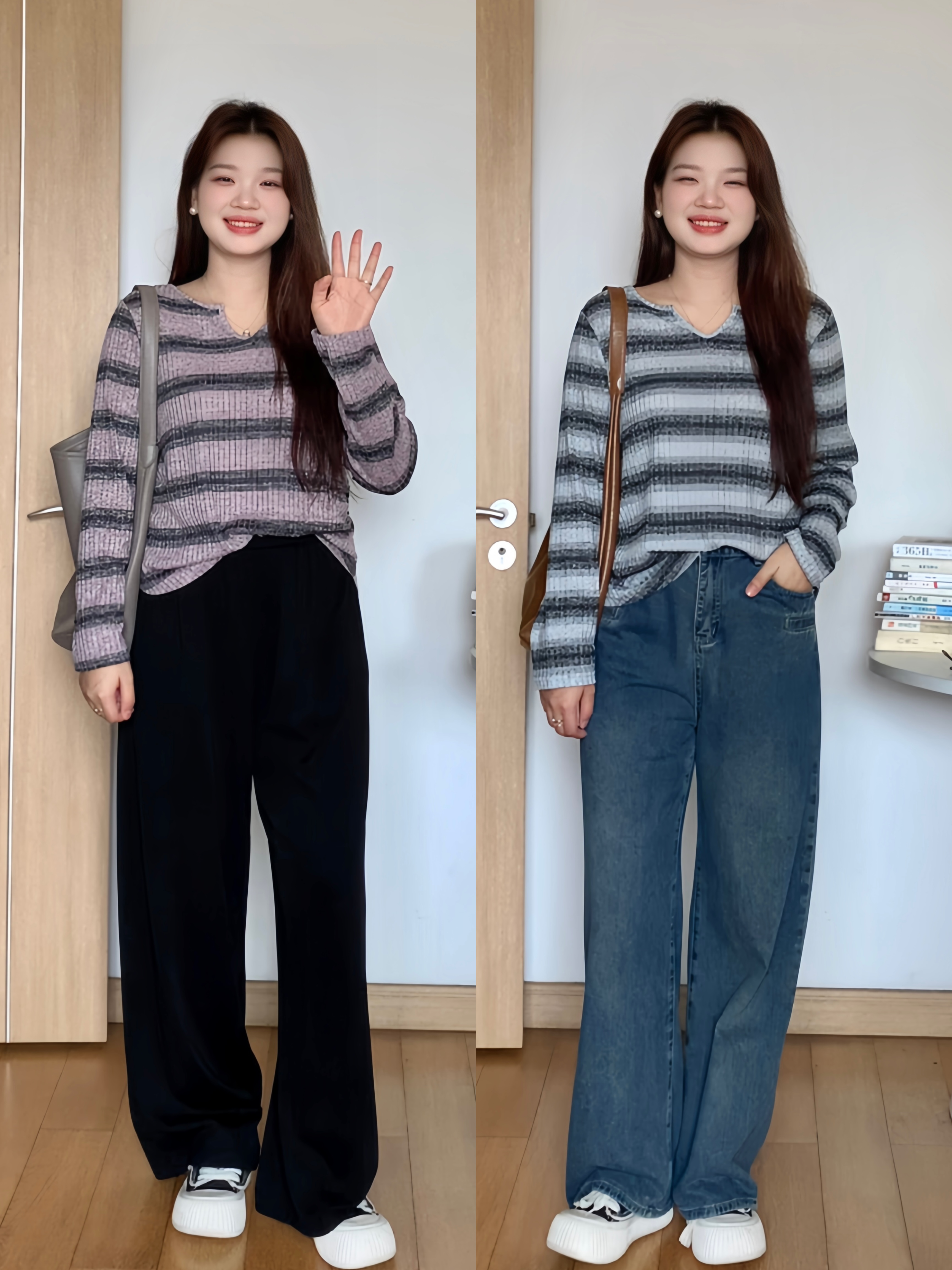 微胖的喵喵 大码女装mm春季宽松显瘦休闲百搭条纹长袖t恤上衣3517