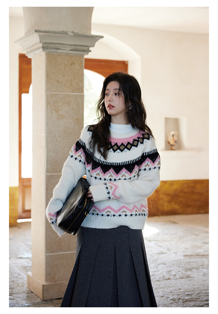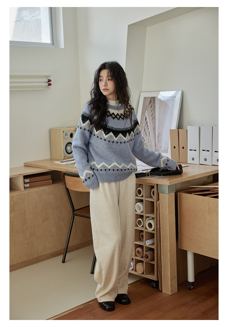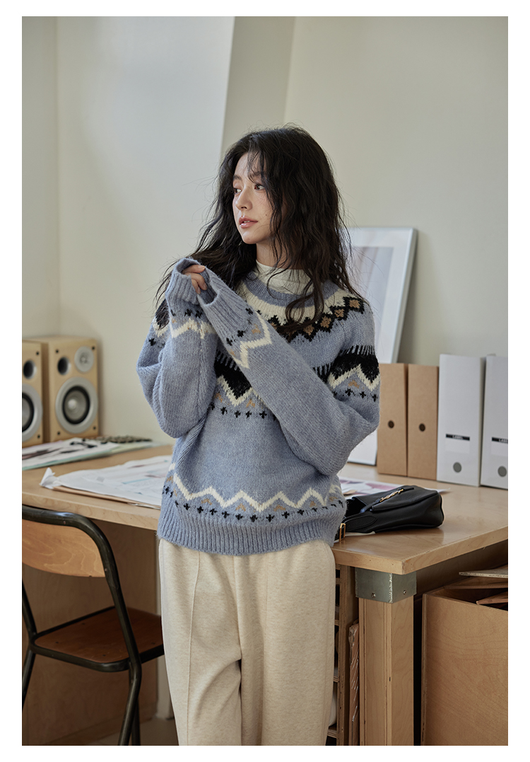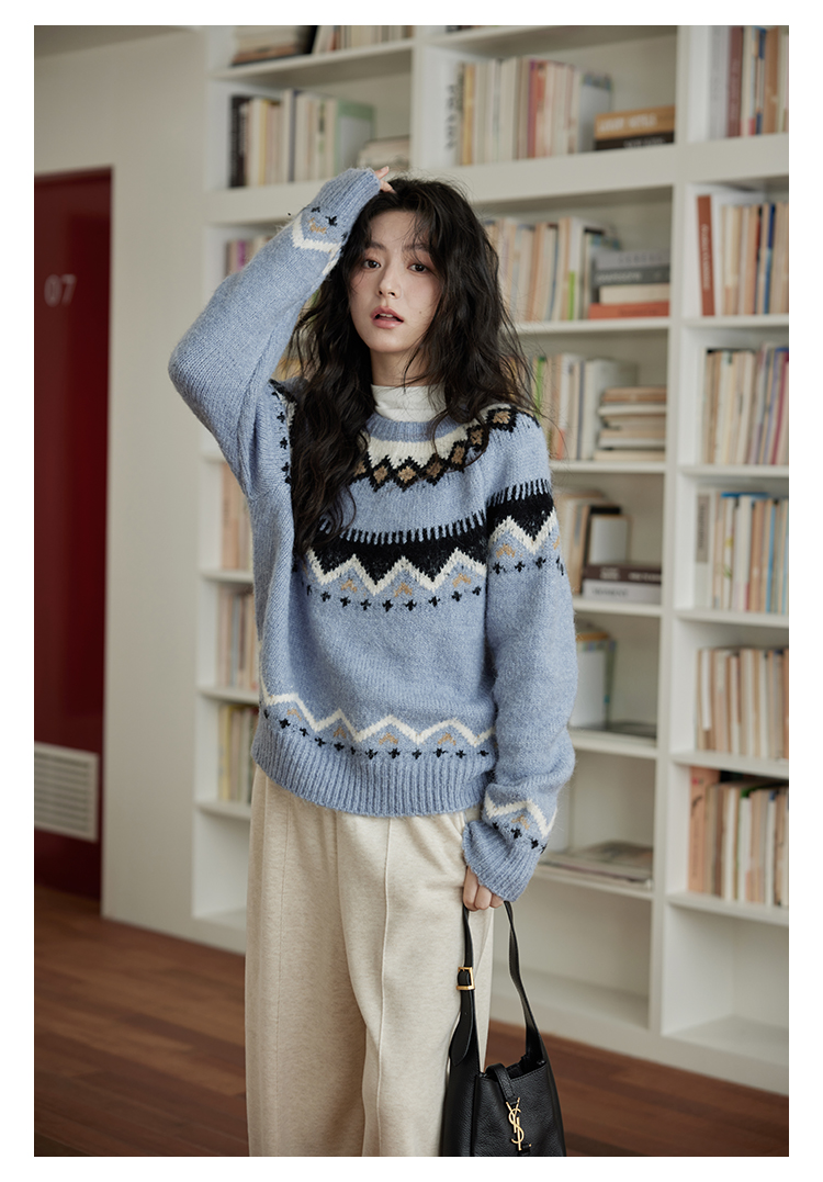 秋冬圆领时尚针织衫复古洋气小众慵懒风宽松软糯毛衣