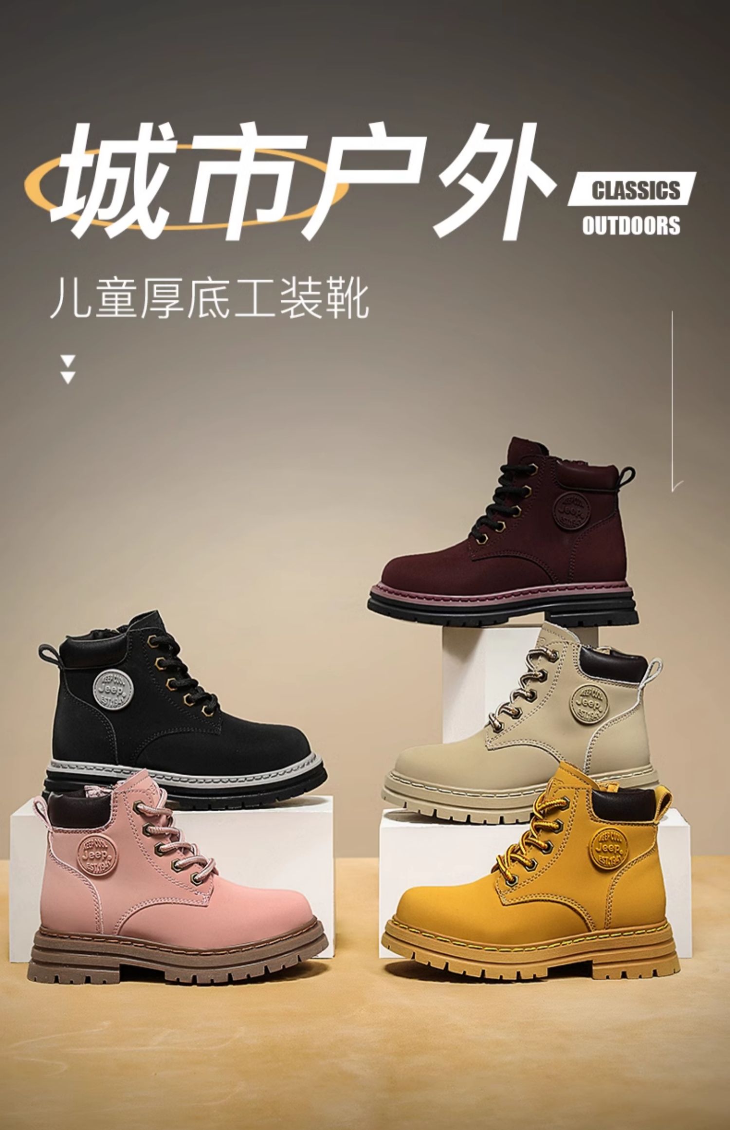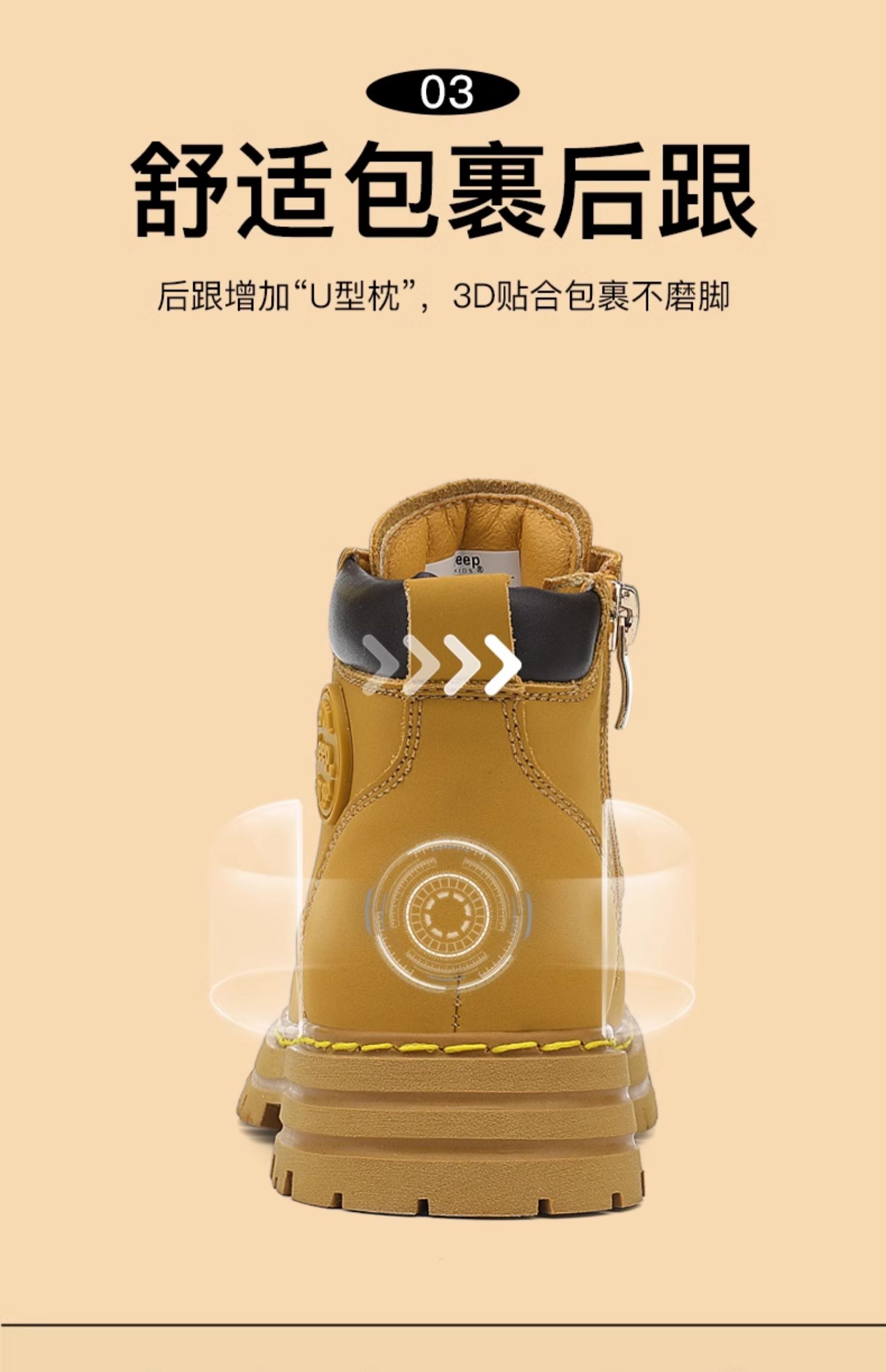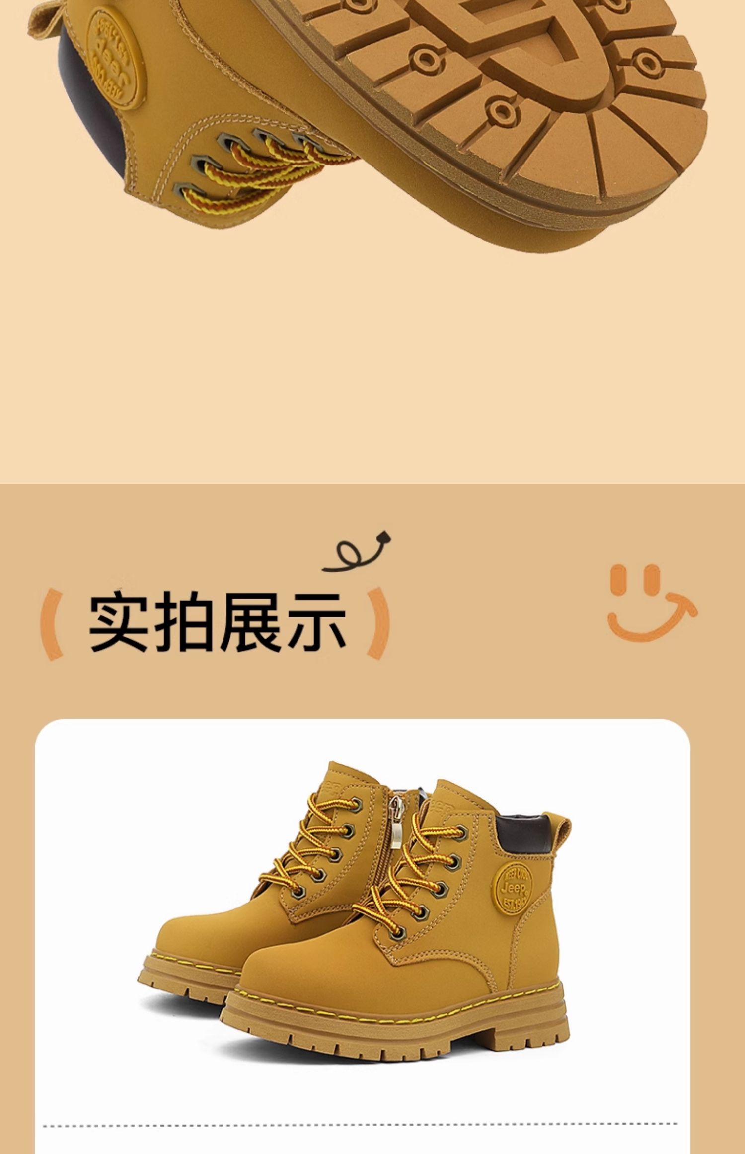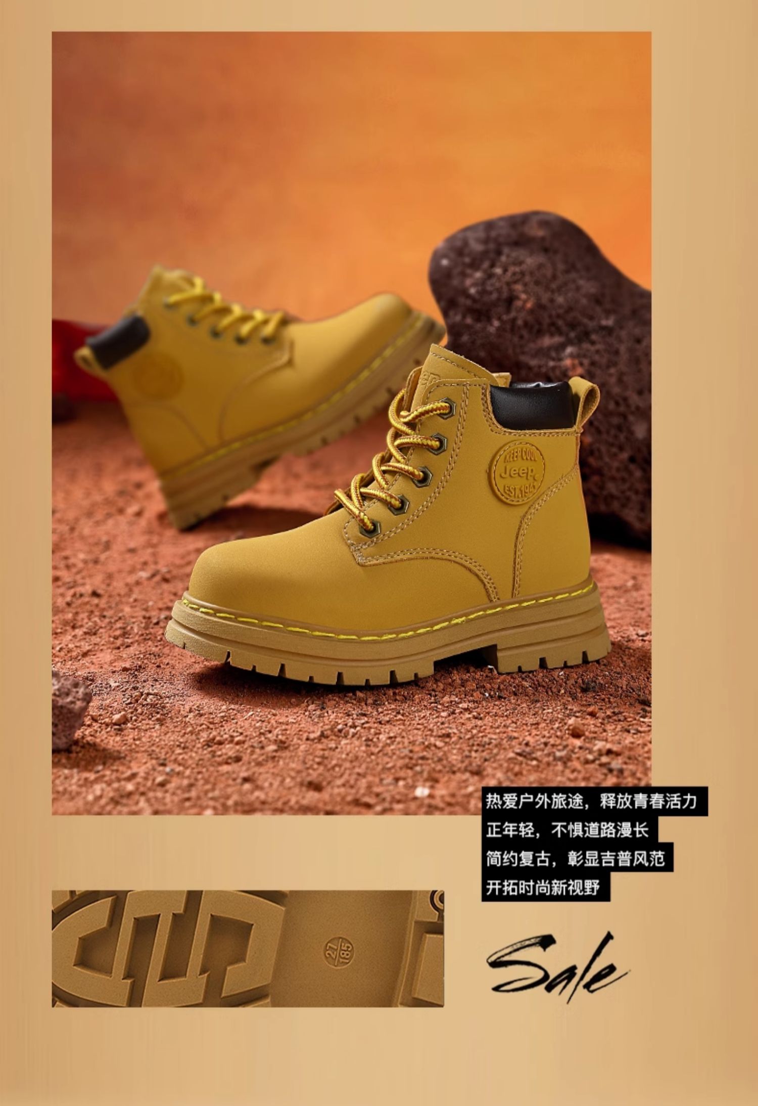 JEEP儿童马丁靴大黄靴皮靴男童女童鞋子2025春秋男孩防滑户外靴子