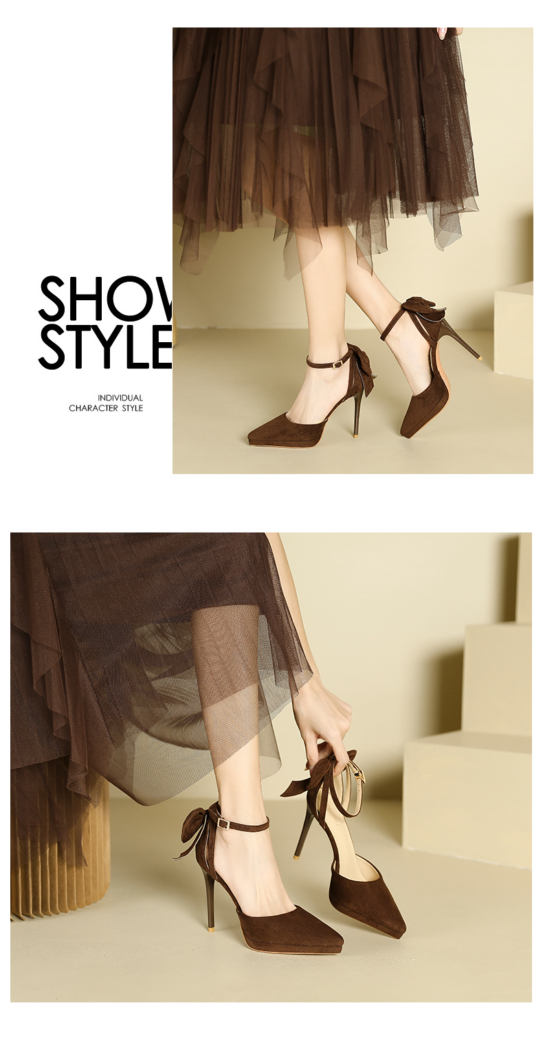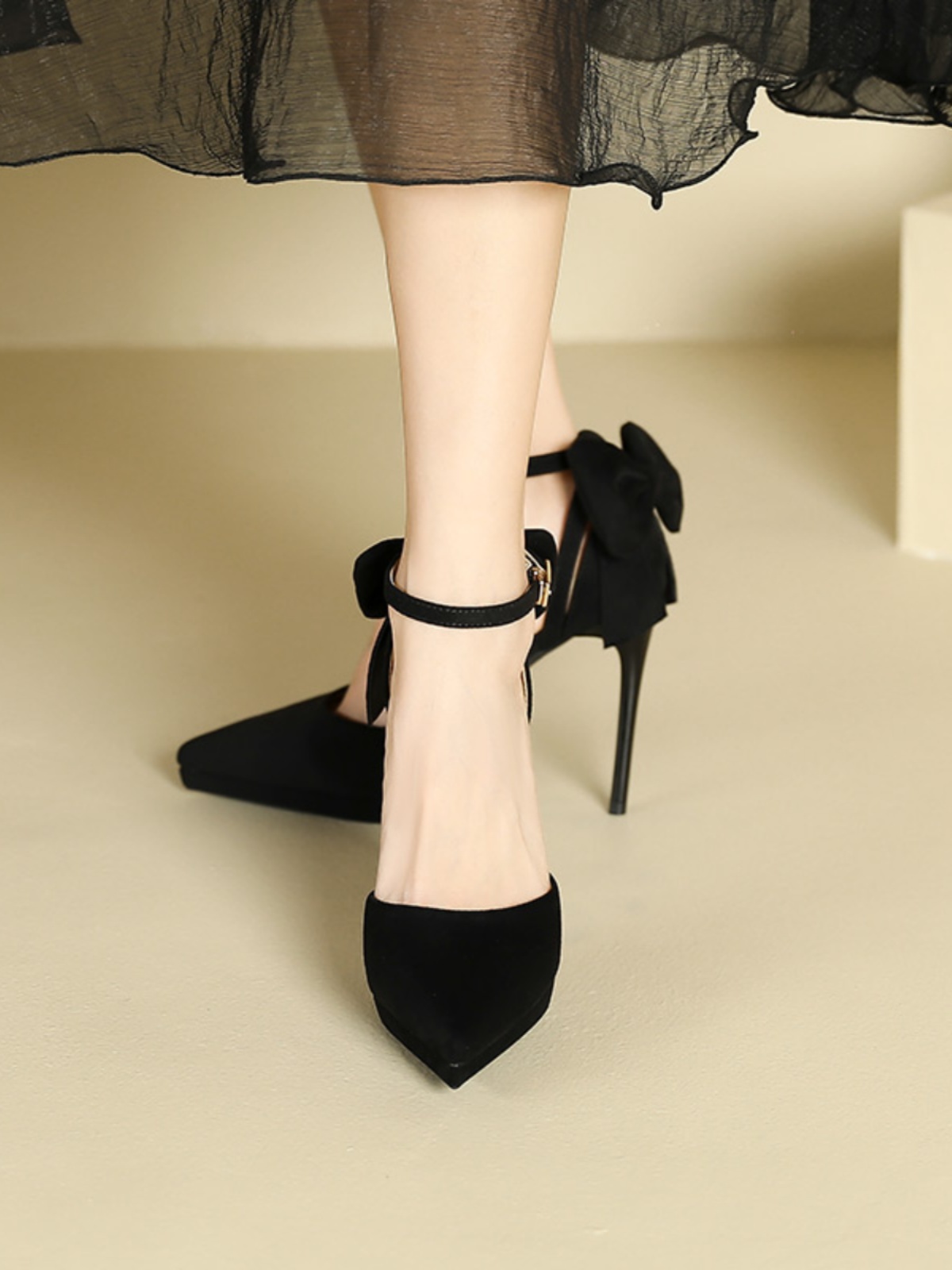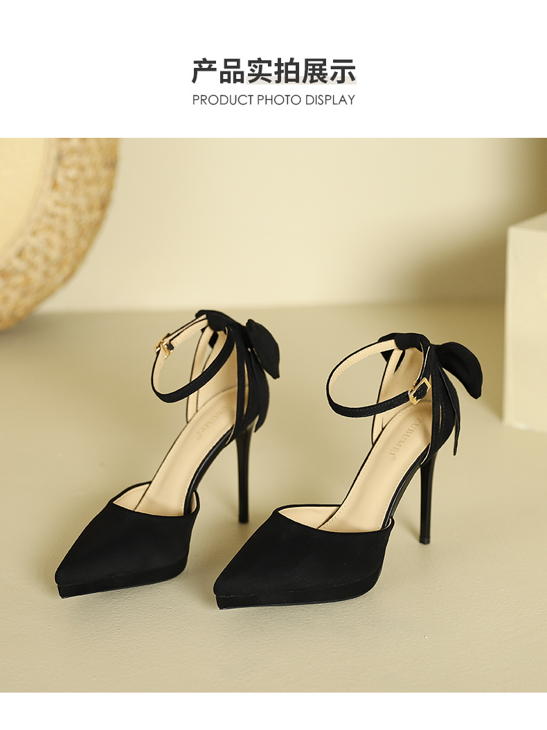 蝴蝶结黑色高跟鞋女气质尖头防水台一字扣带中空单鞋细跟包头凉鞋