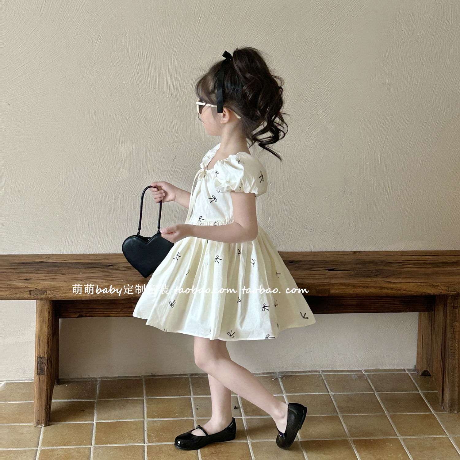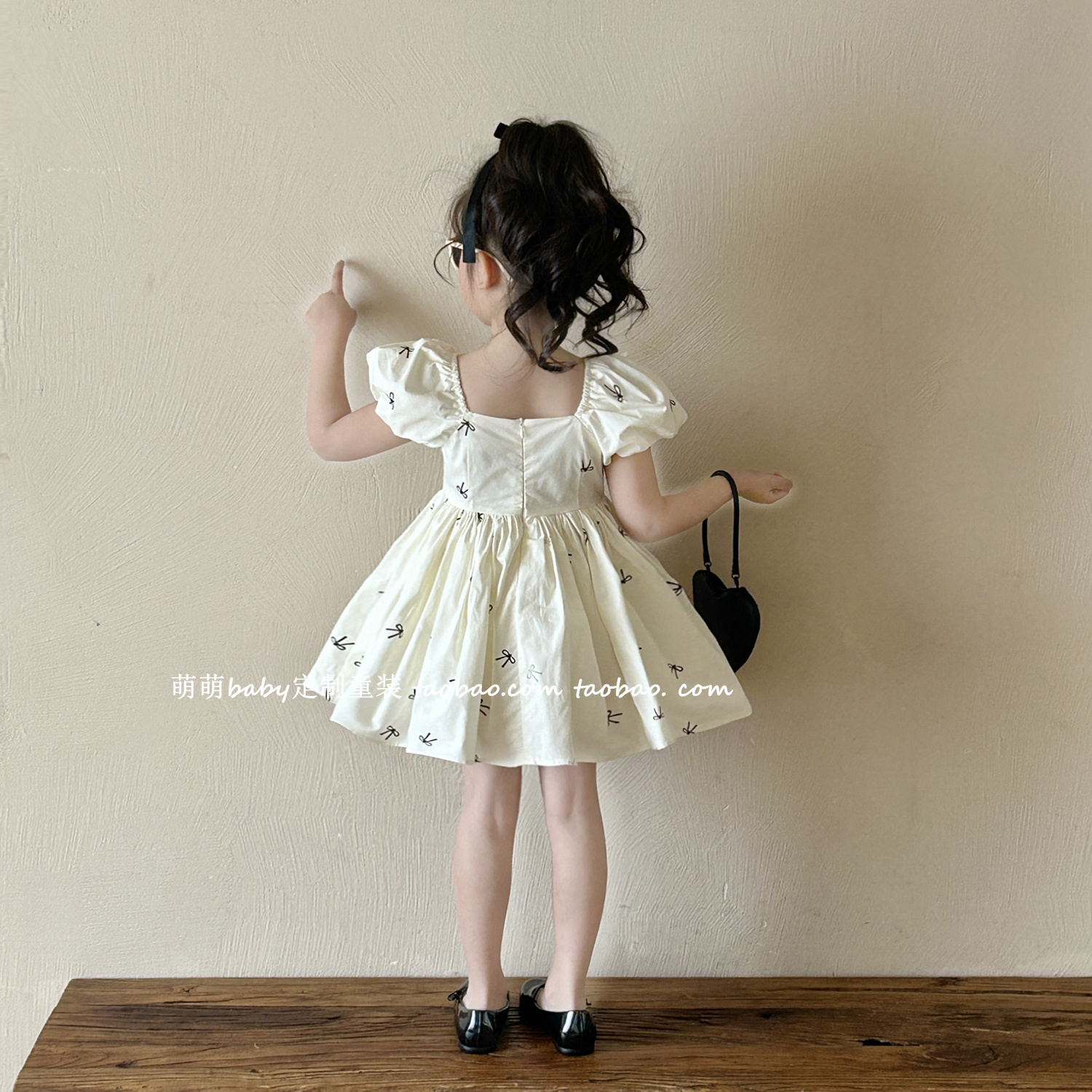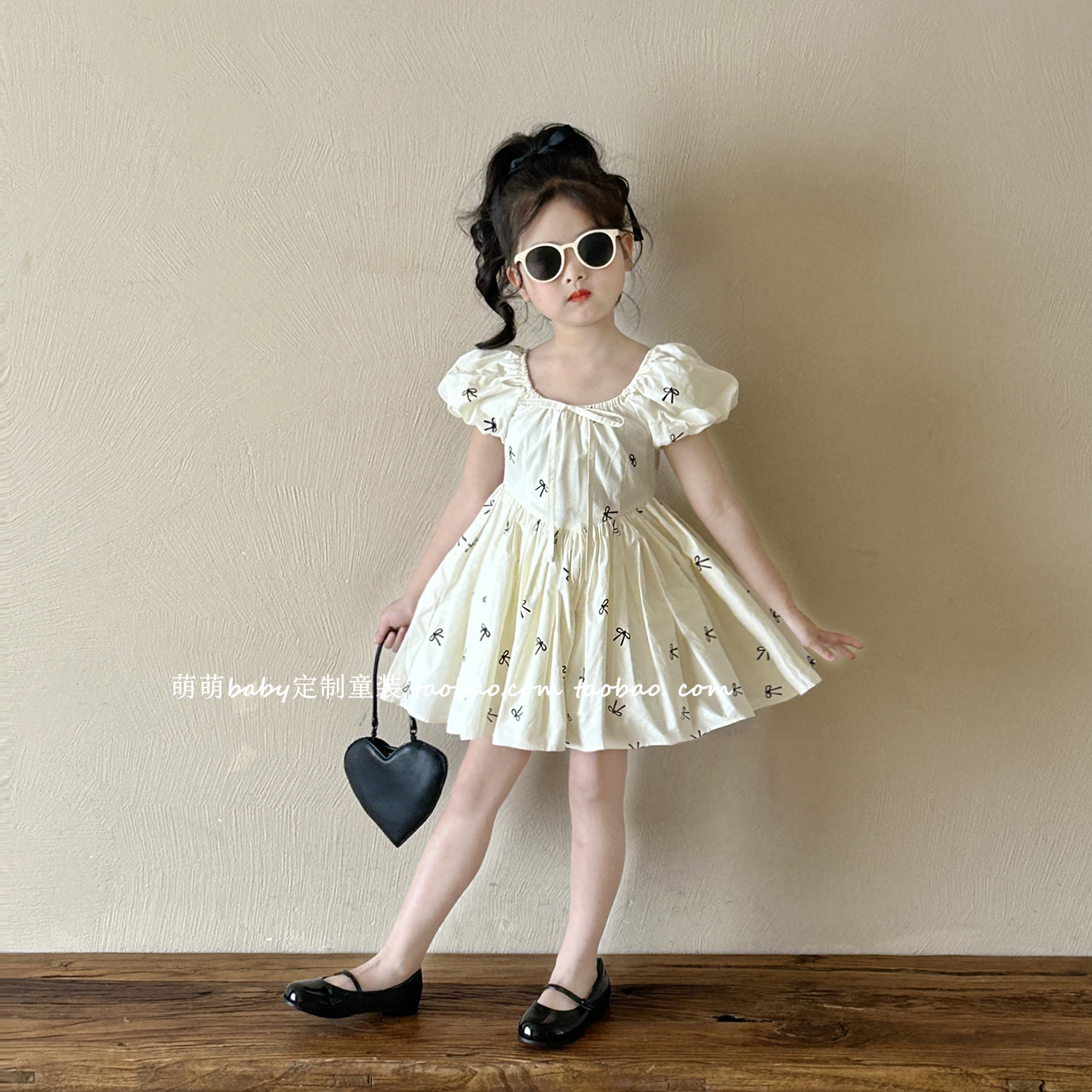 女童法式泡泡袖连衣裙2025夏季新款韩版小女孩蝴蝶结印花甜美裙子