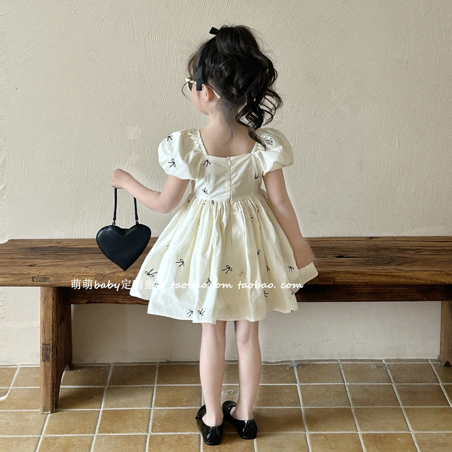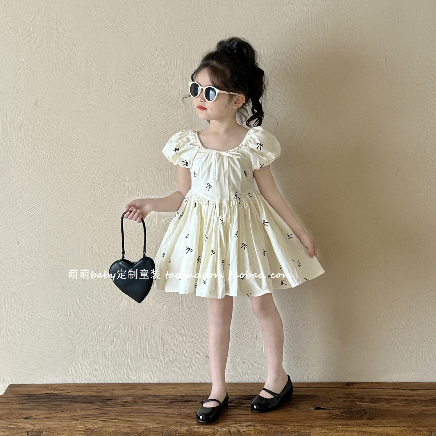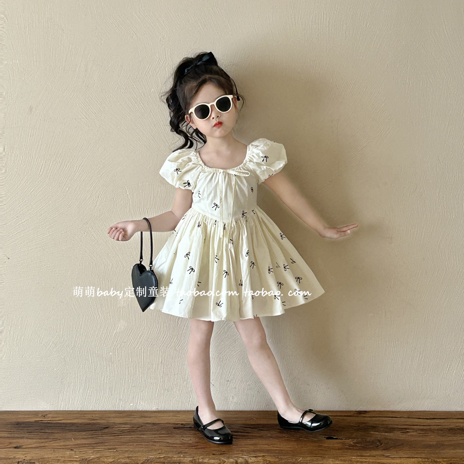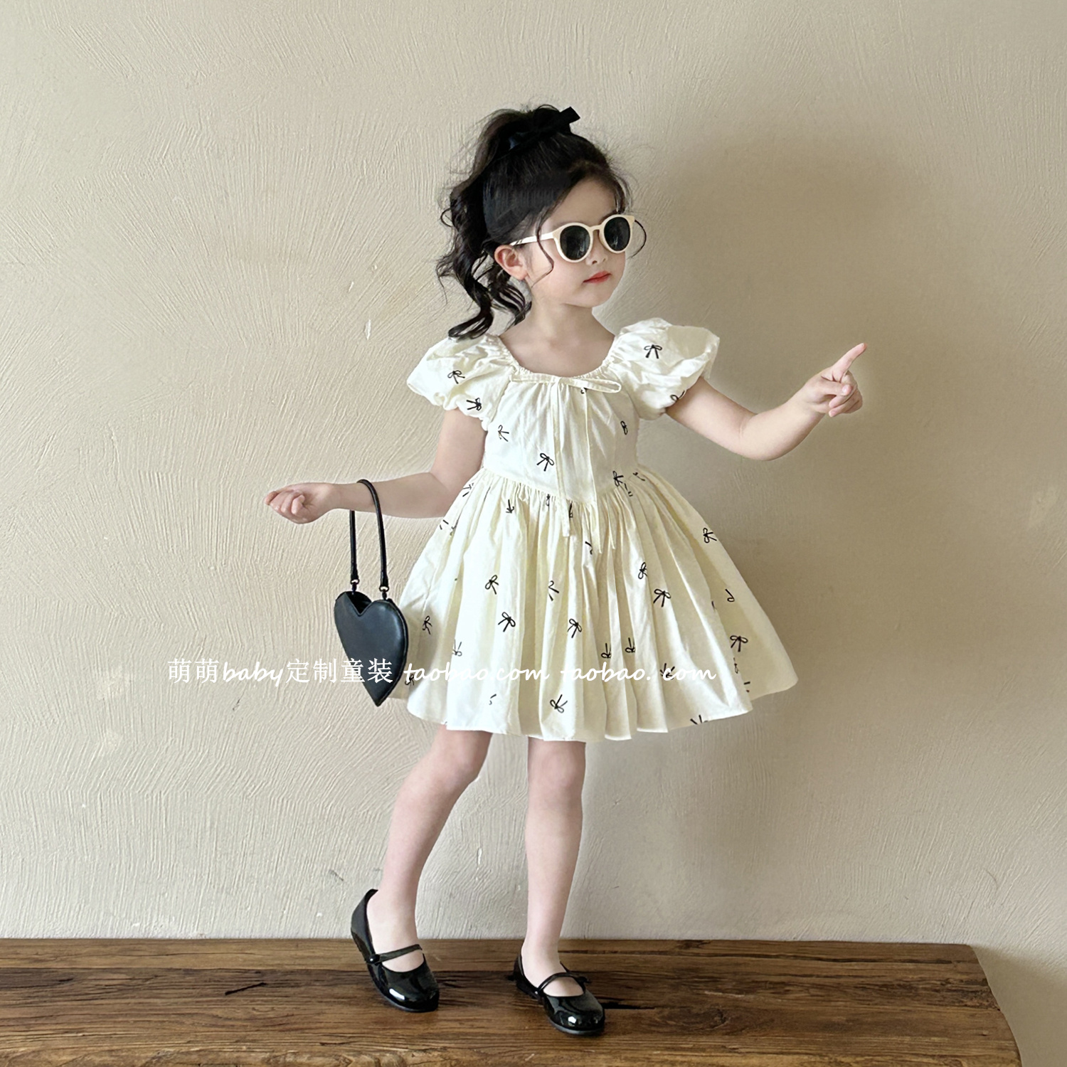 女童法式泡泡袖连衣裙2025夏季新款韩版小女孩蝴蝶结印花甜美裙子