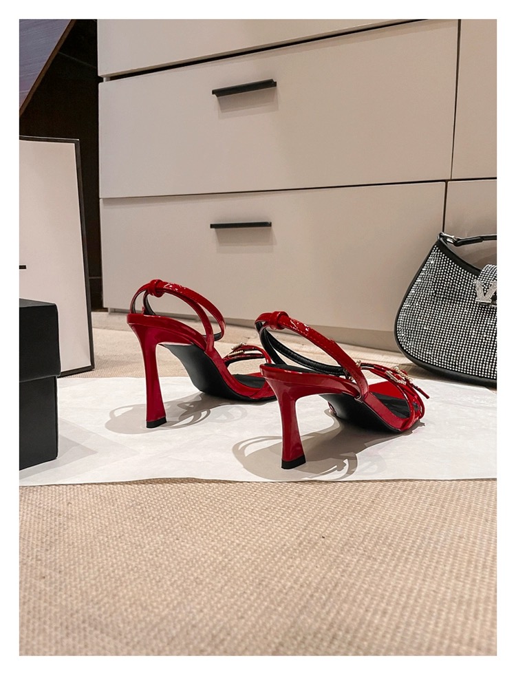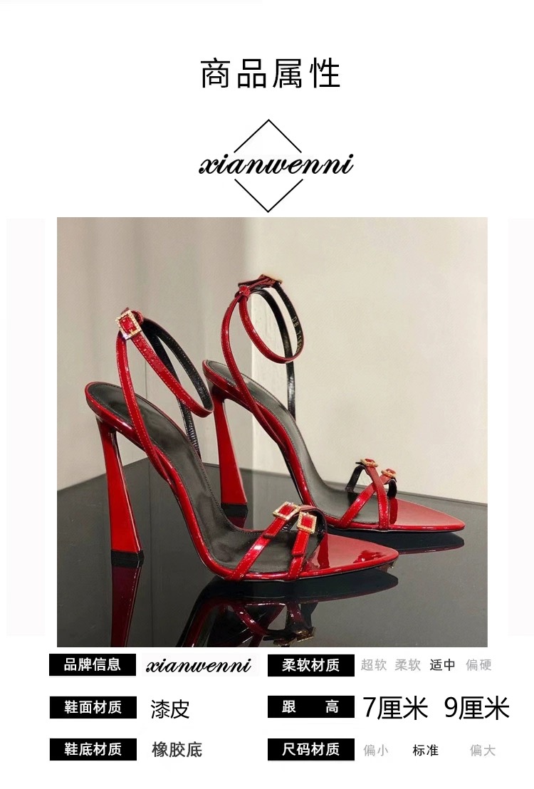 欧美2024年夏新款细带露趾一字带扣凉鞋女尖头细跟宴会红色高跟鞋