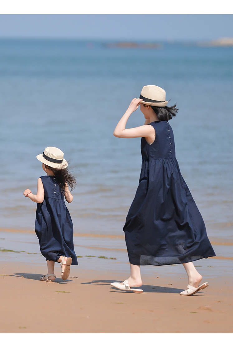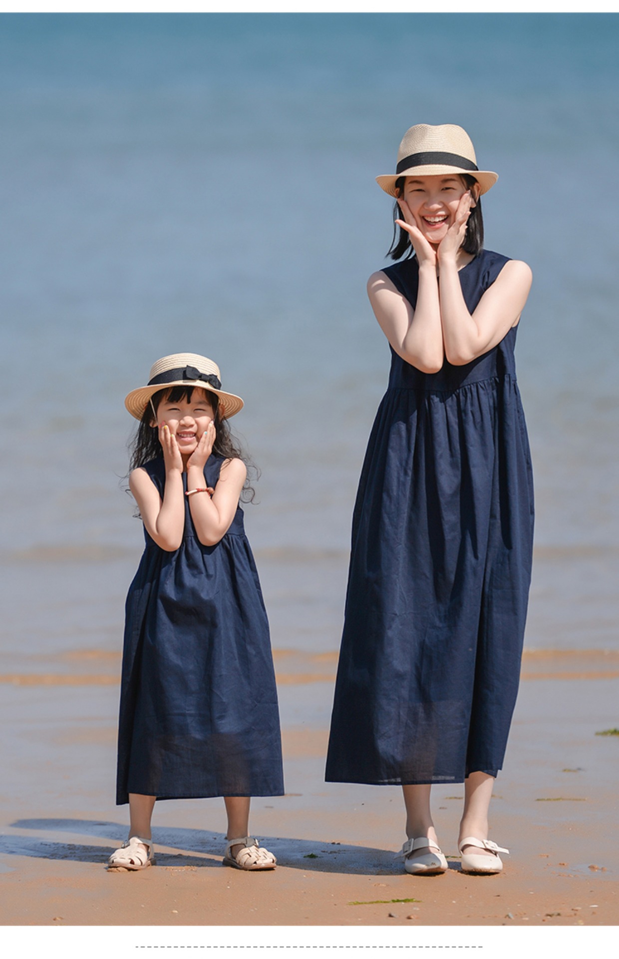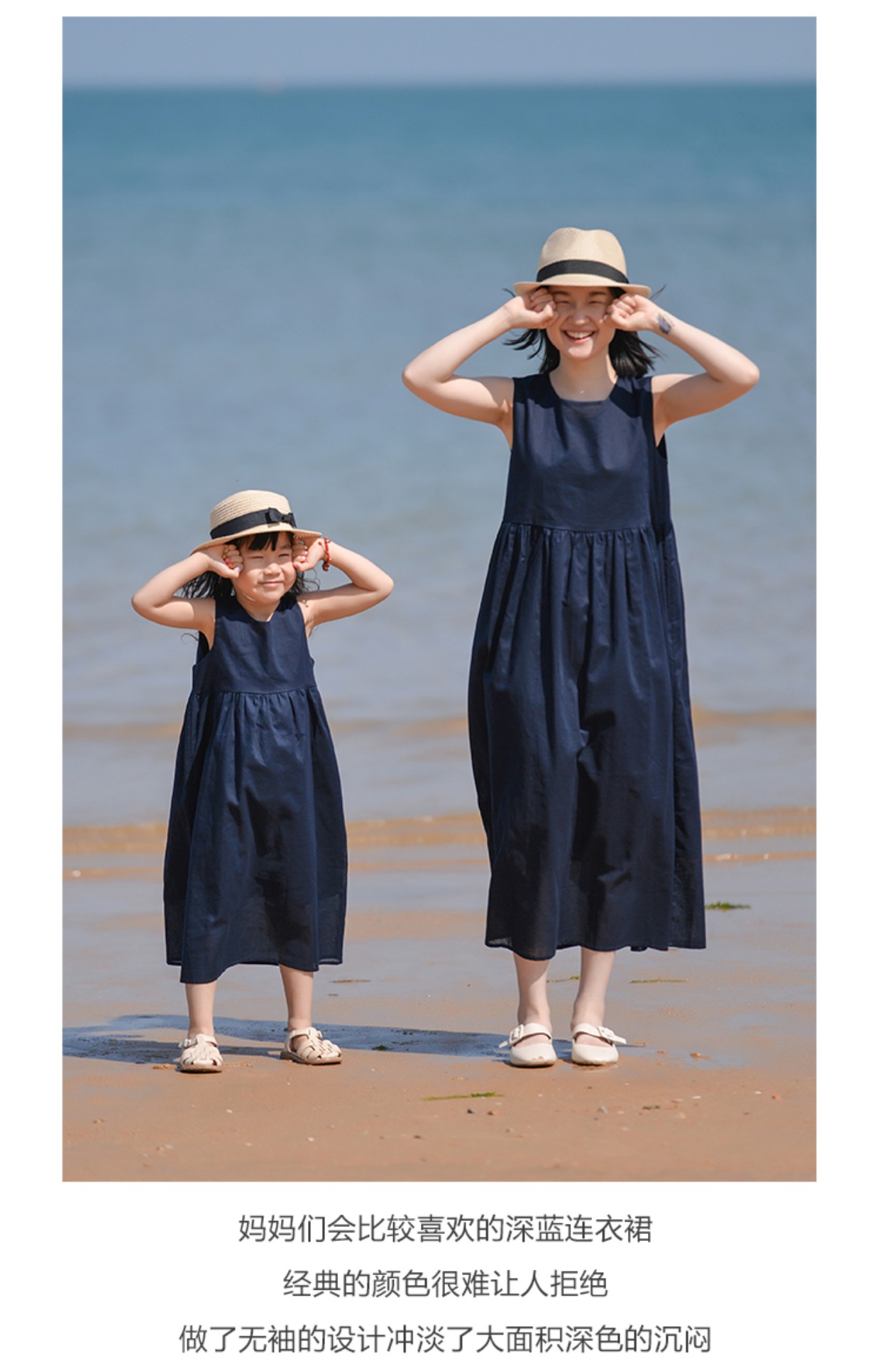 小乐往亲子装103 夏度假深蓝棉清新文艺女童姐妹显瘦连衣裙母女装