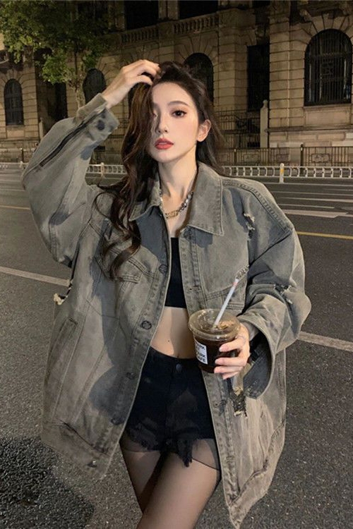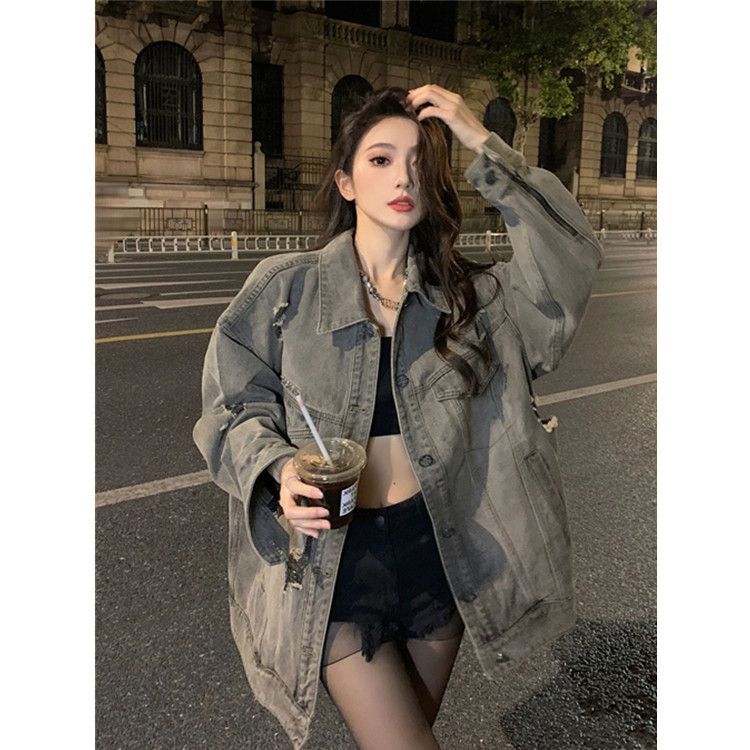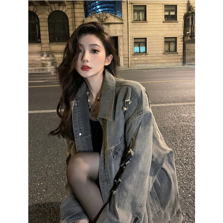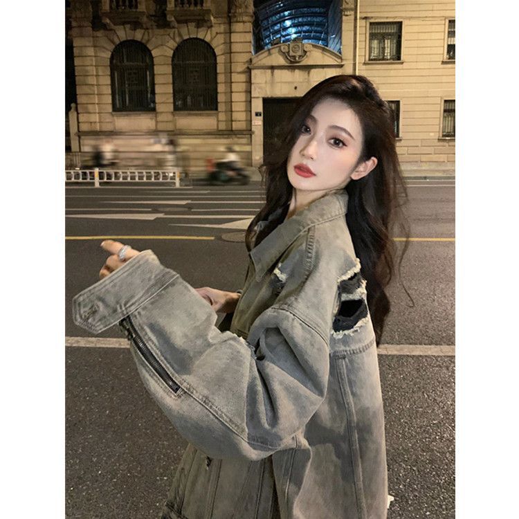 大码胖妹妹美式复古牛外套女春秋冬新款破洞宽松显瘦百搭上衣夹克