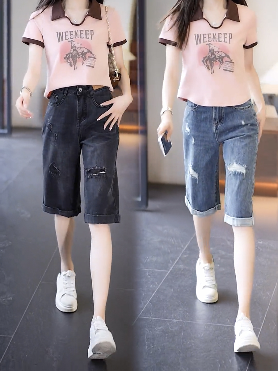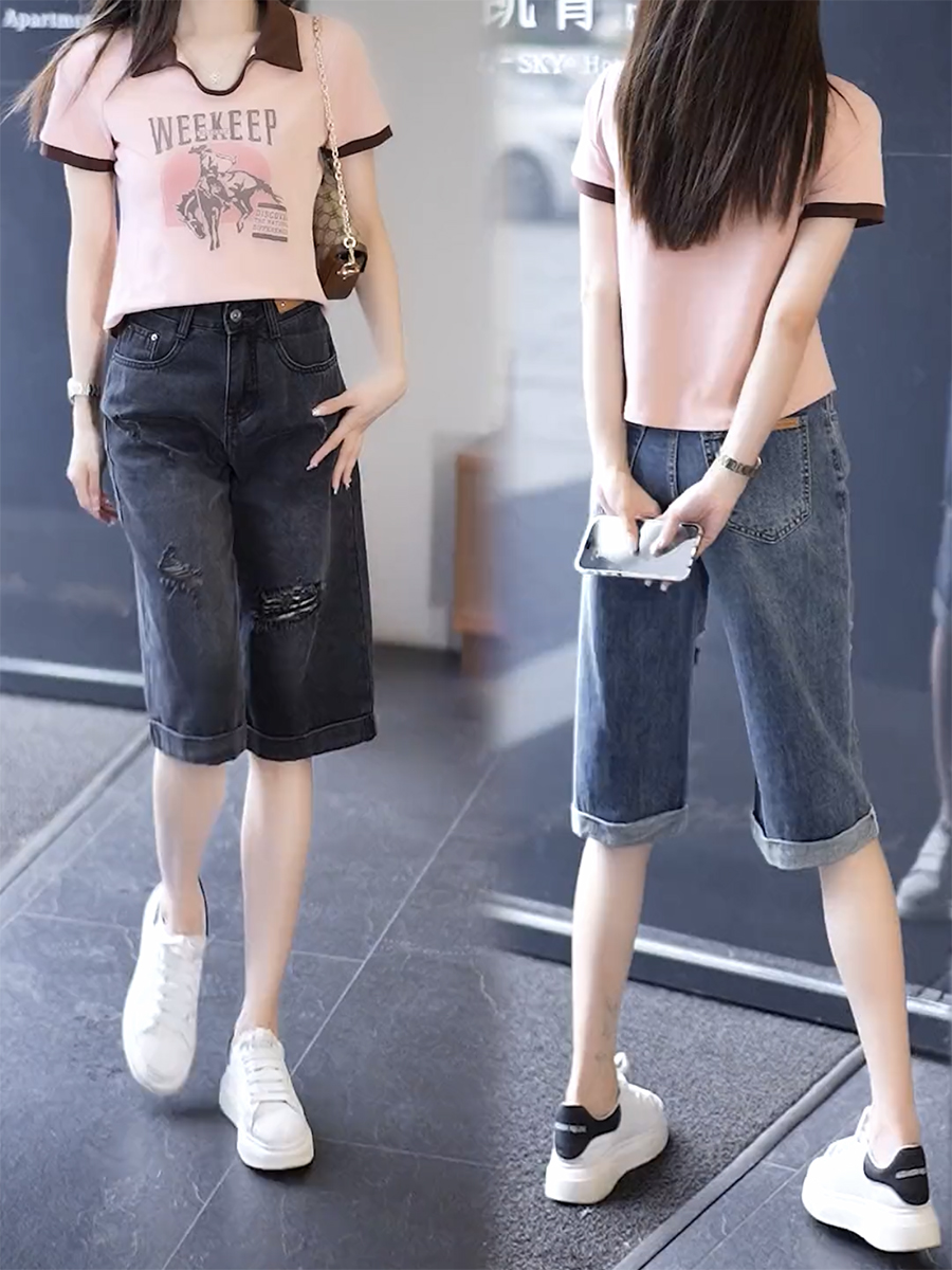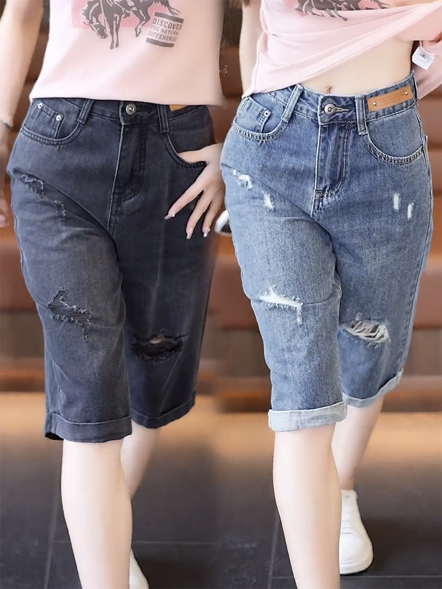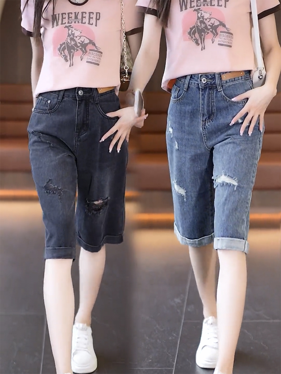 梨型身材薄款直筒牛仔短裤子2025大码夏季女新款显瘦破洞五六分裤