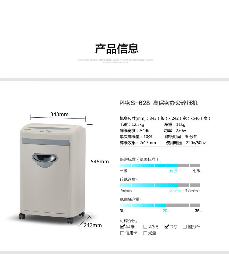 科密(comet)5级保密办公商用碎纸机(单次7张持续30分钟17L)S