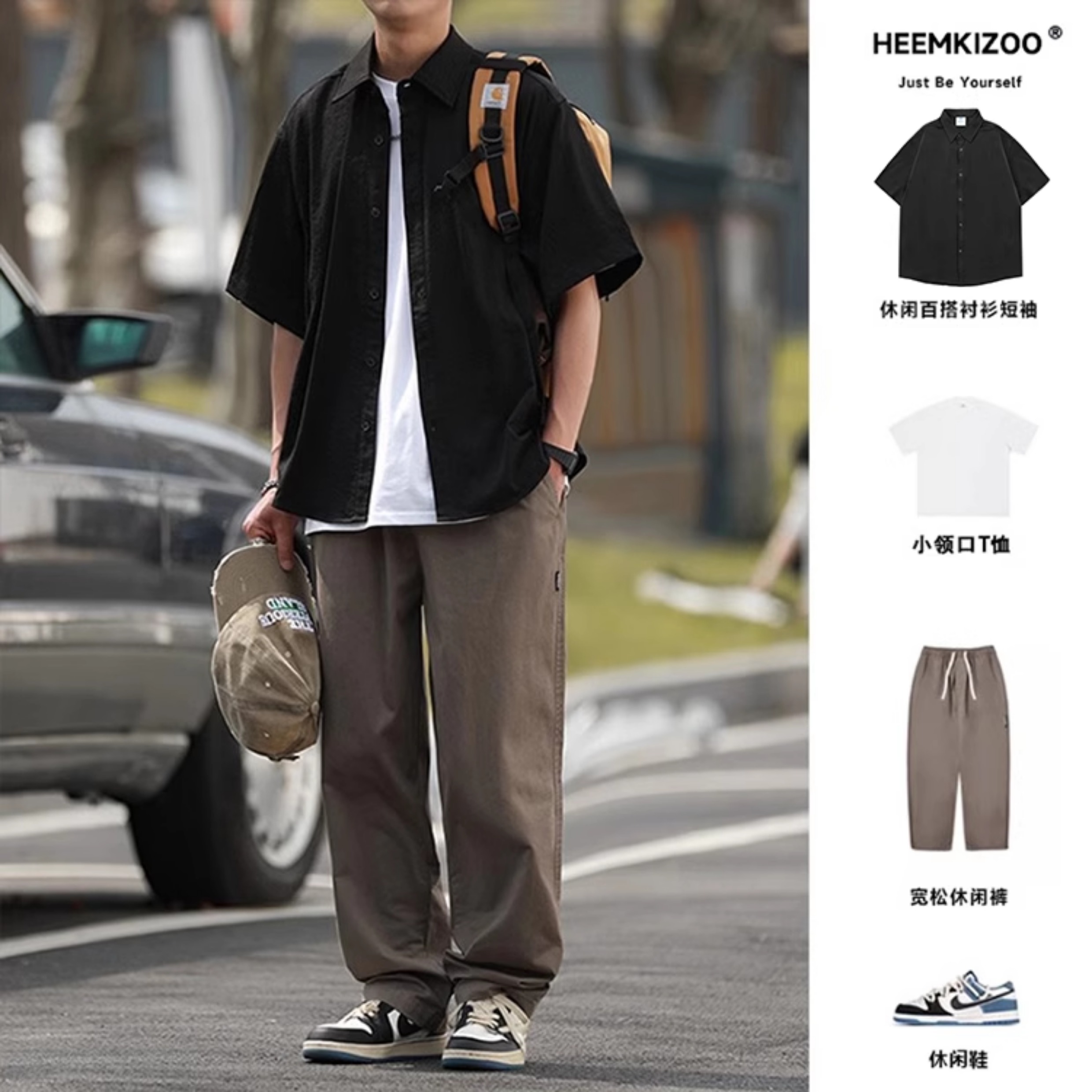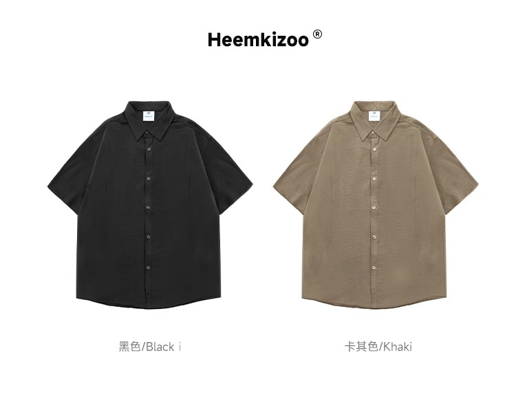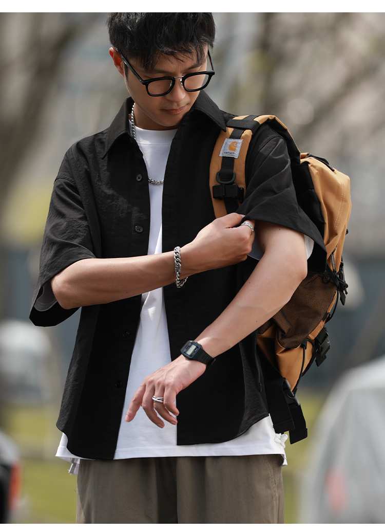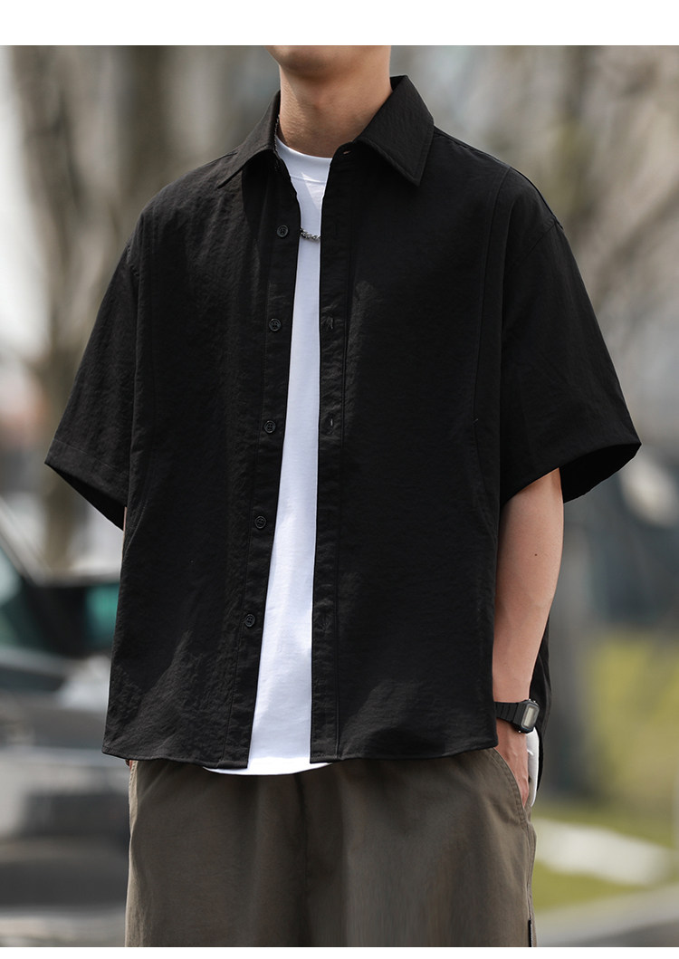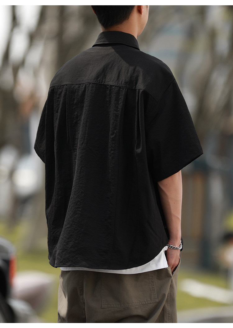 抗皱嘿马七作日系复古春夏款男士弧线拼接短袖衬衫宽松休闲衬衣潮