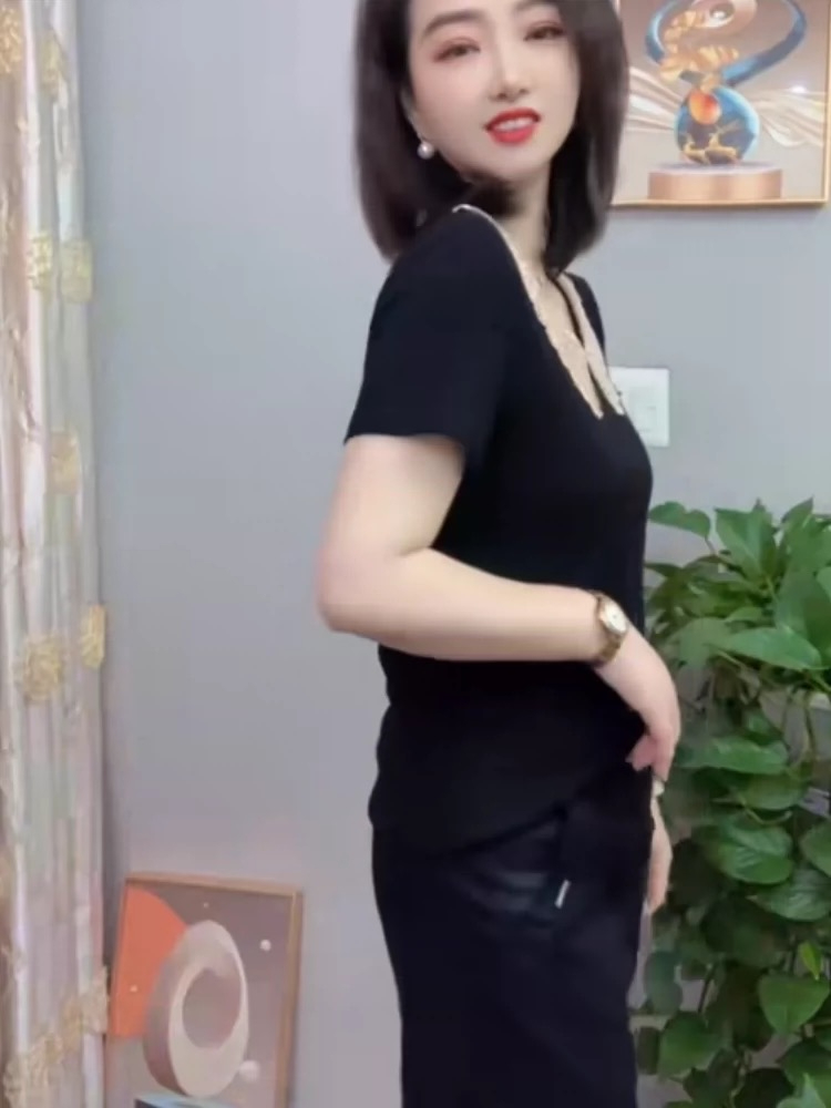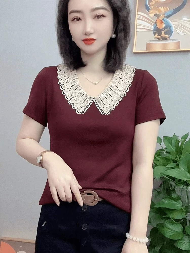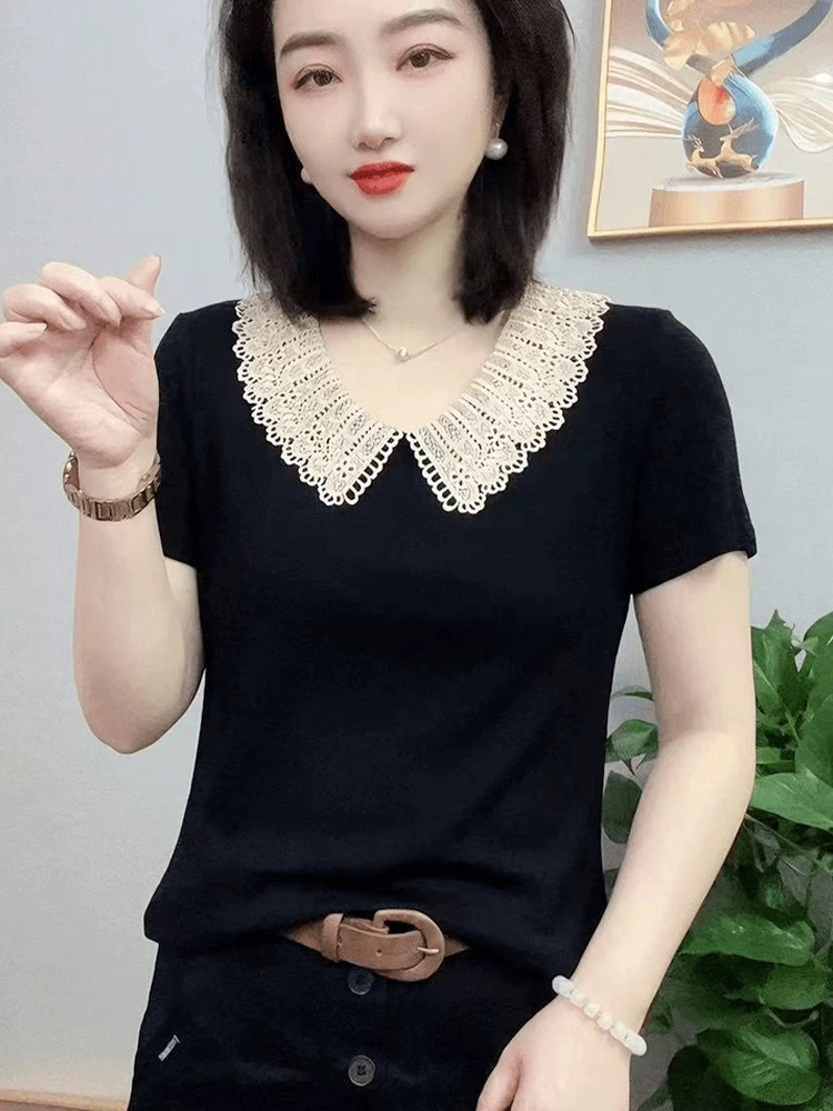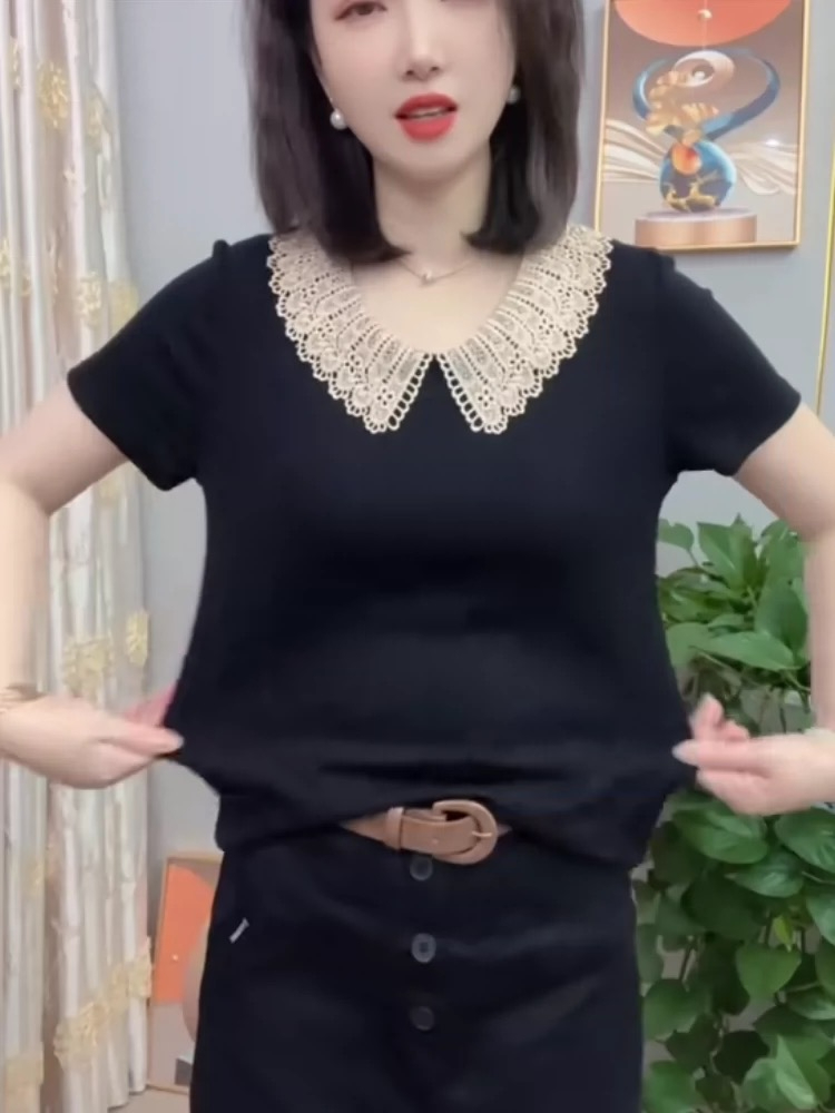 夏季新款洋气减龄花边娃娃领短袖t恤女显瘦宽松大码女装妈妈小衫