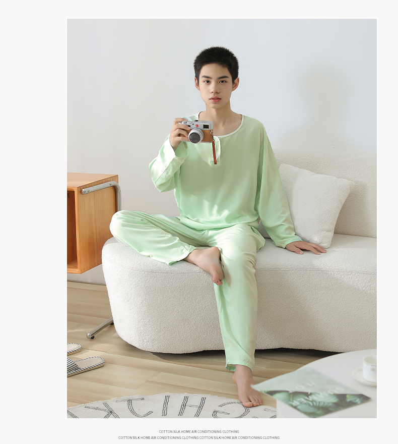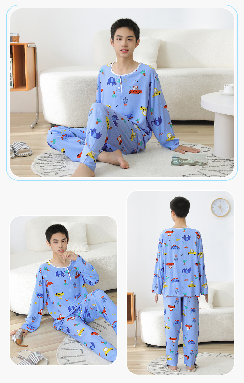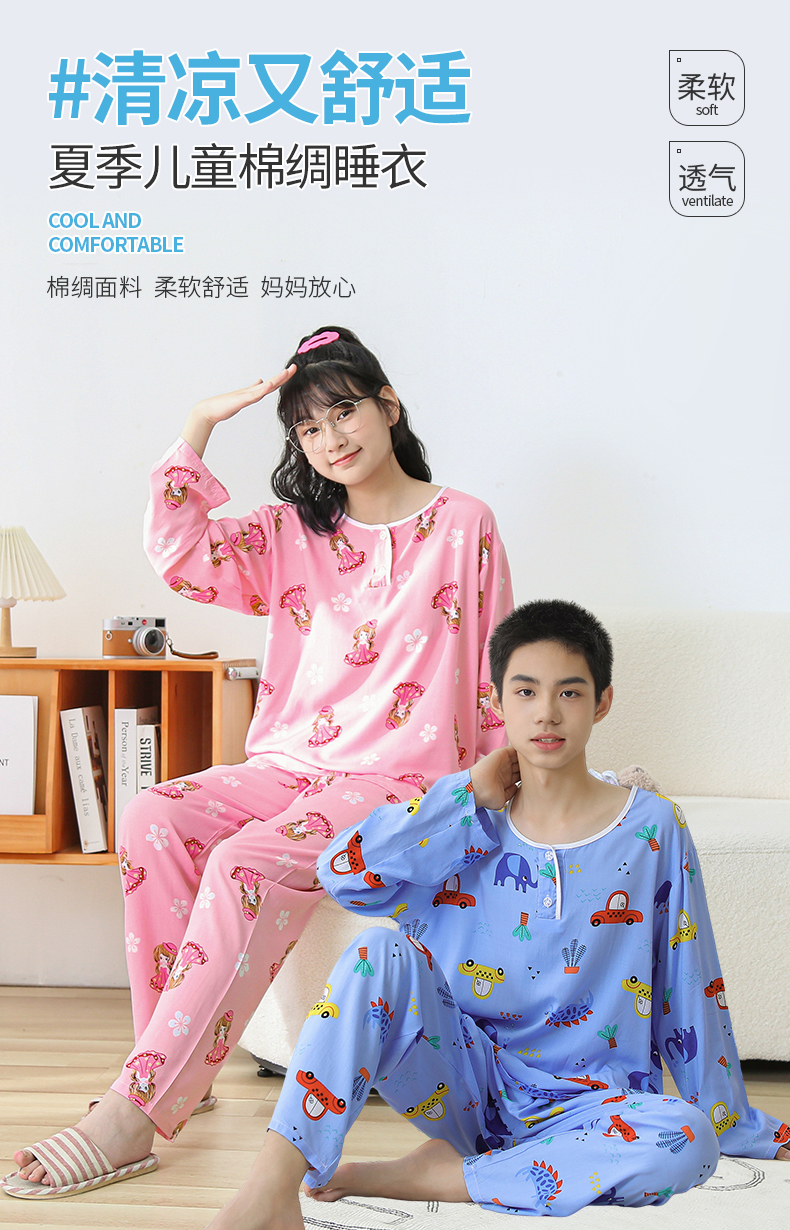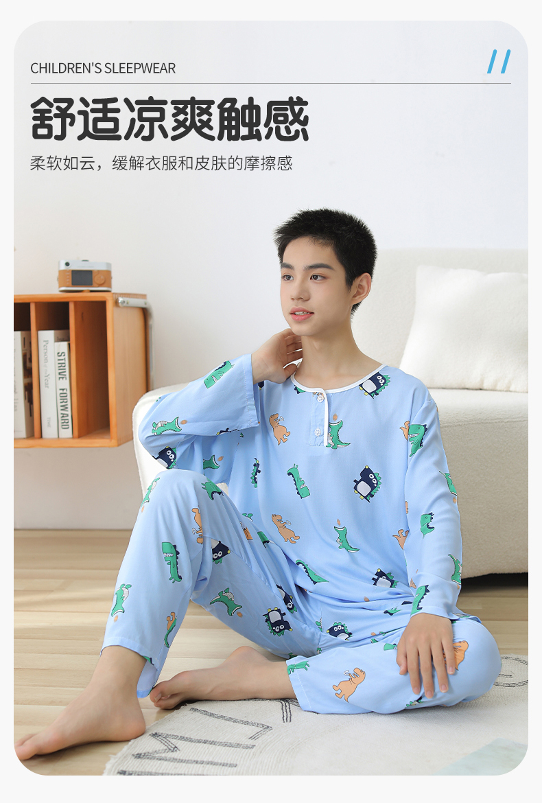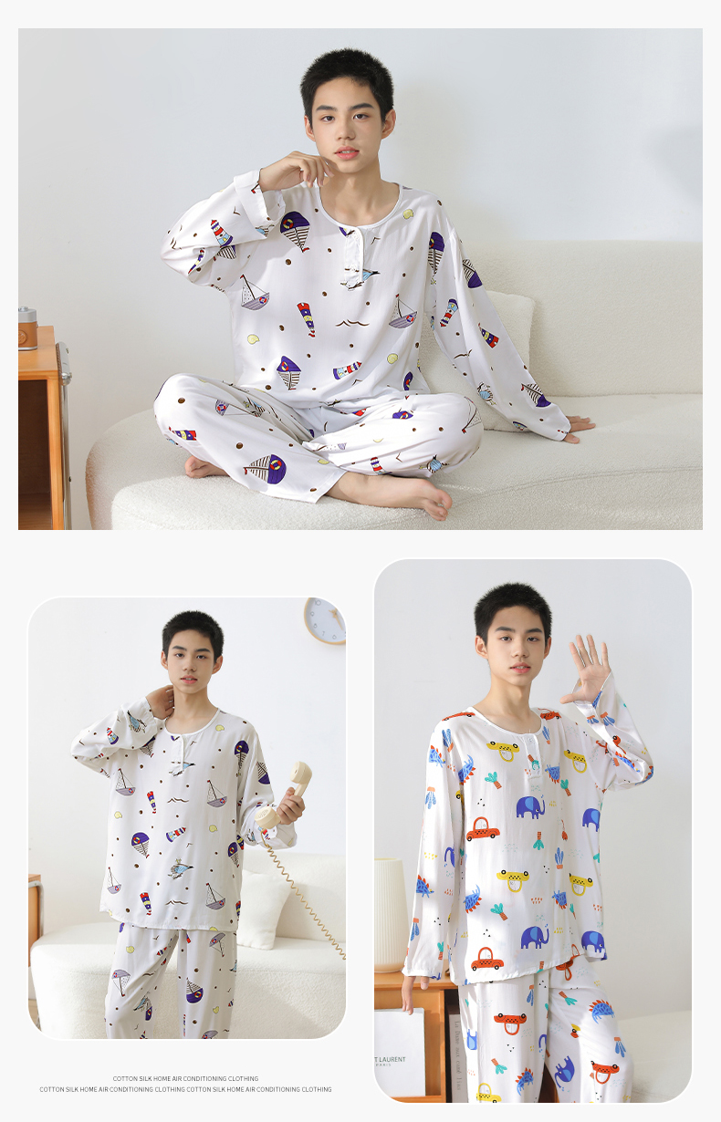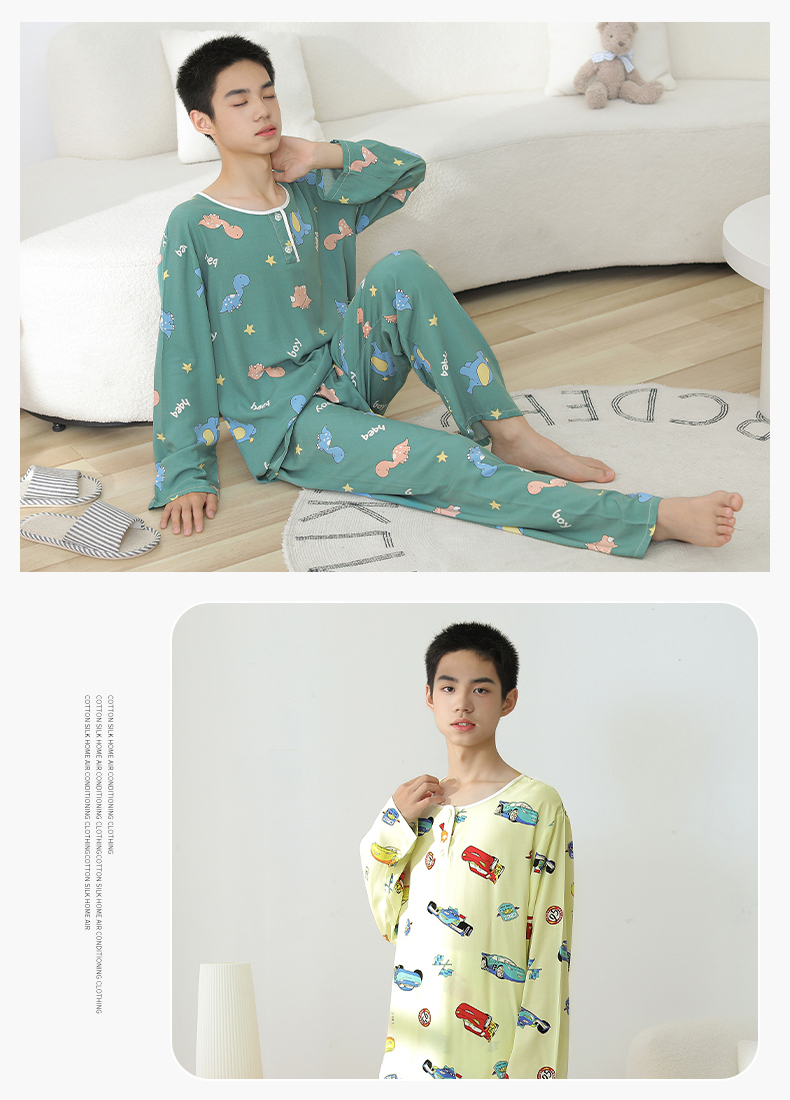 大童棉绸睡衣夏季青少年男童儿童薄款绵绸男孩长袖空调家居服套装