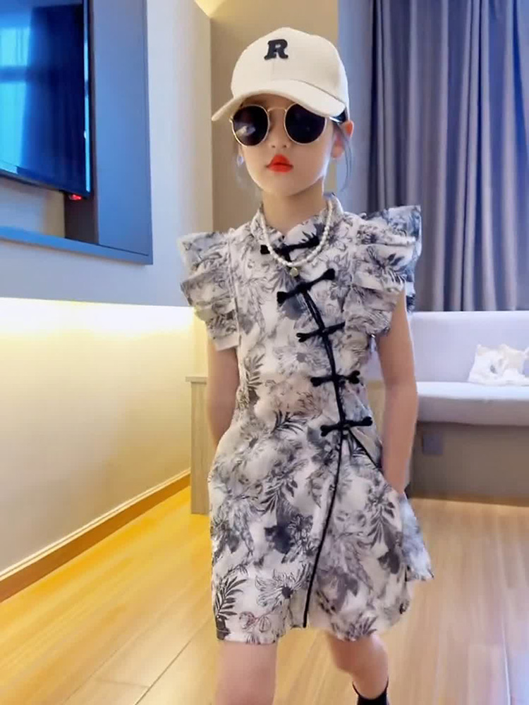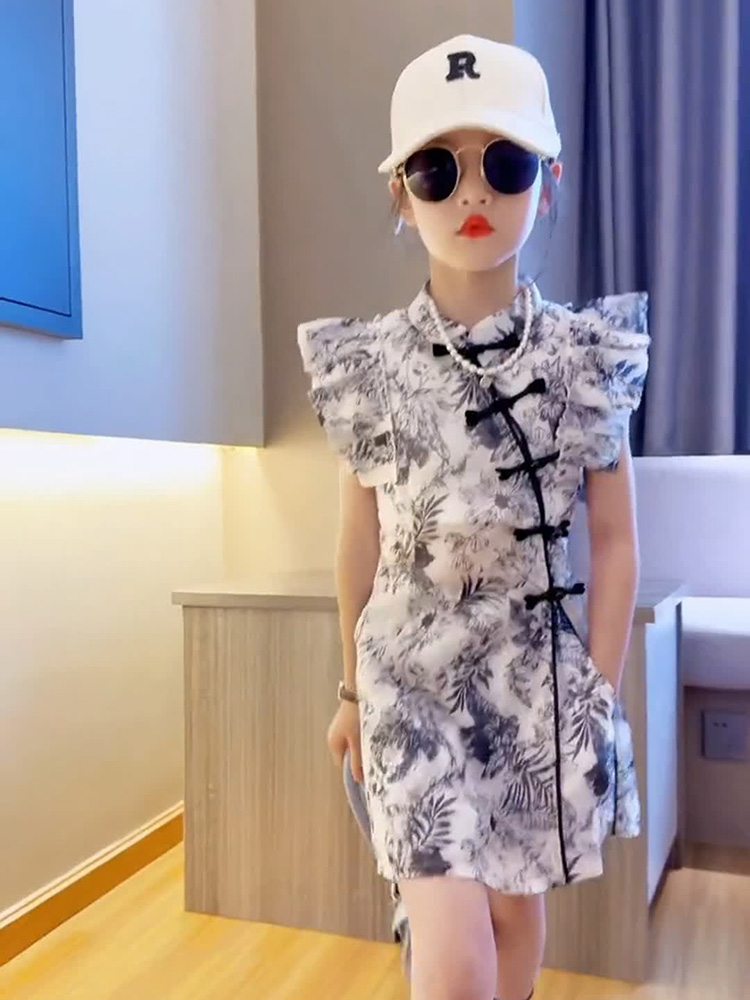 女童夏季新中式旗袍连衣裙山水画小飞袖短裤套装复古亲子装两件套