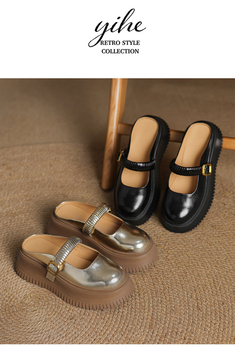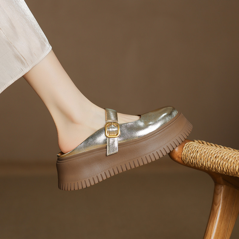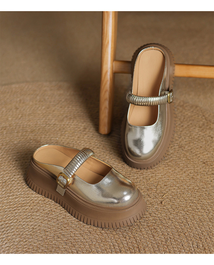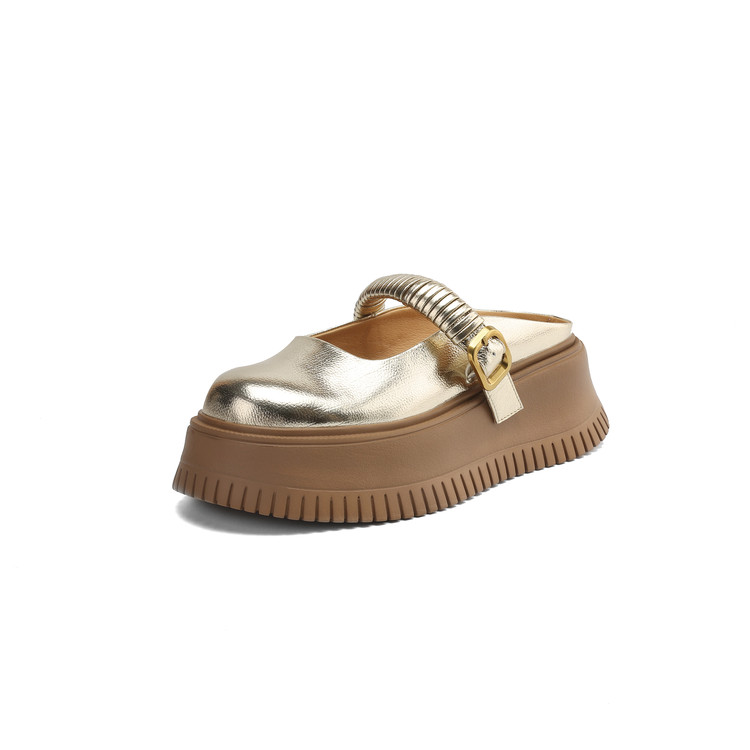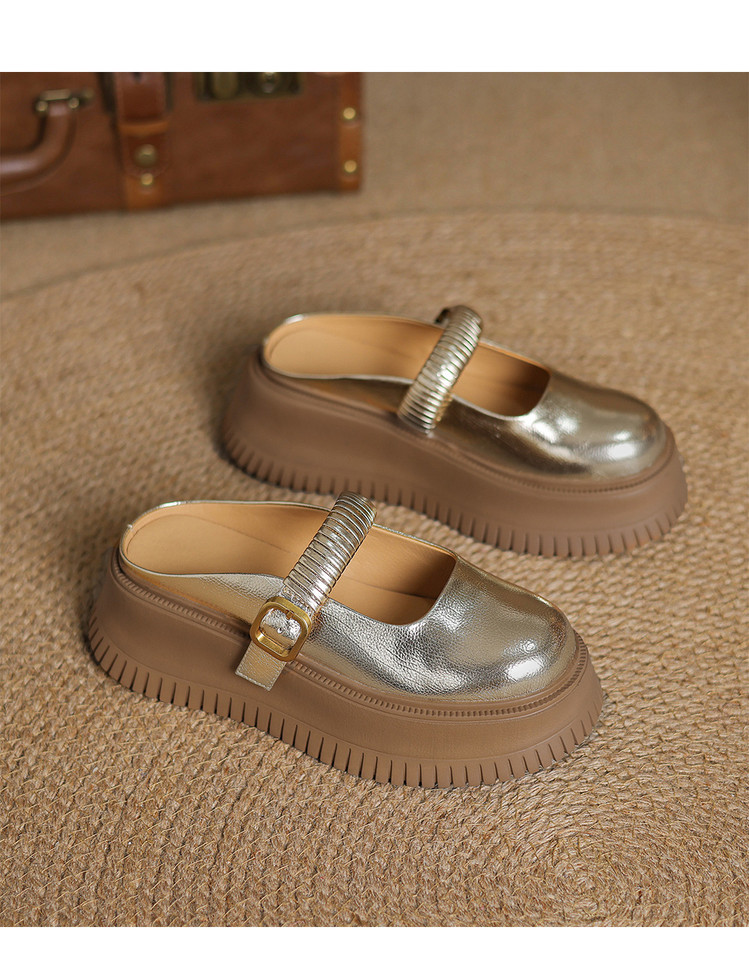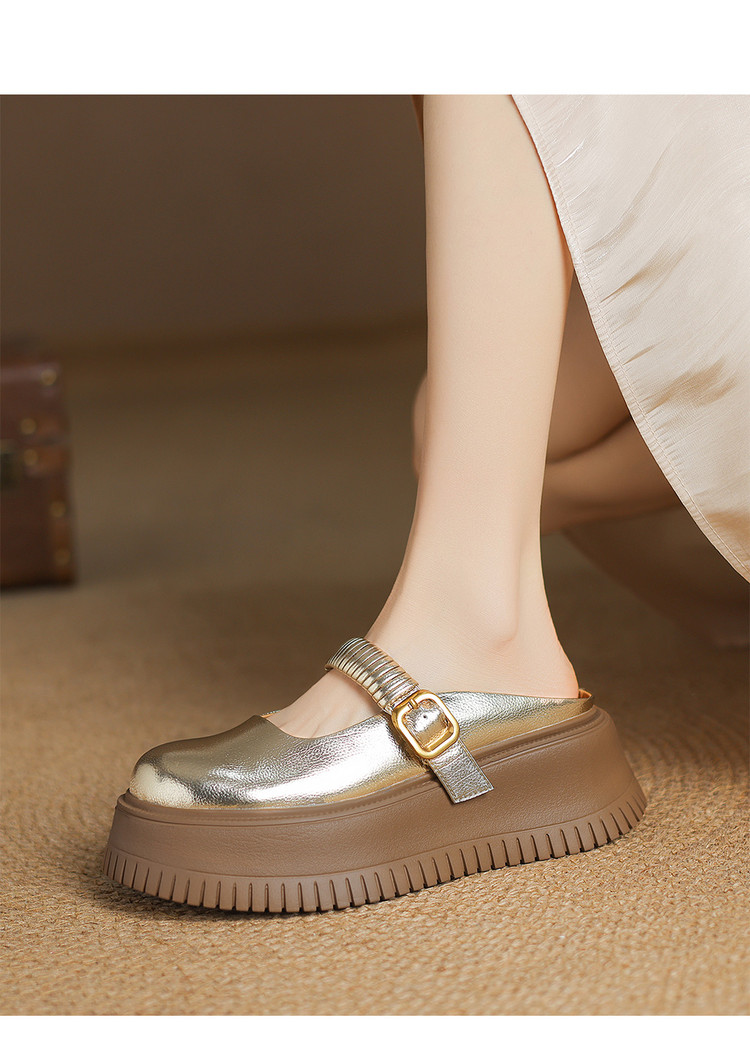 时尚外穿厚底包头半拖鞋女真皮懒人皮带扣凉拖坡跟松糕底金色单鞋