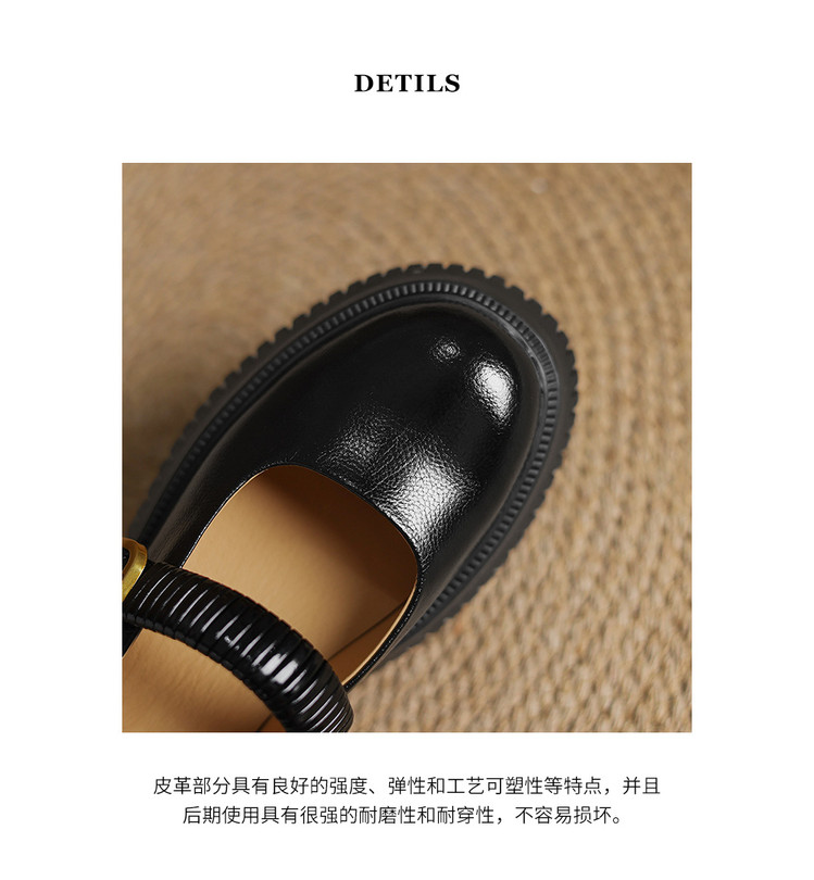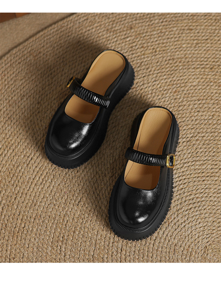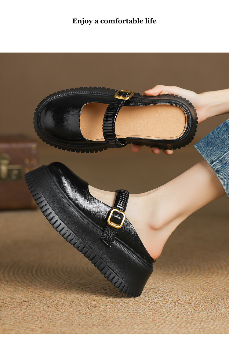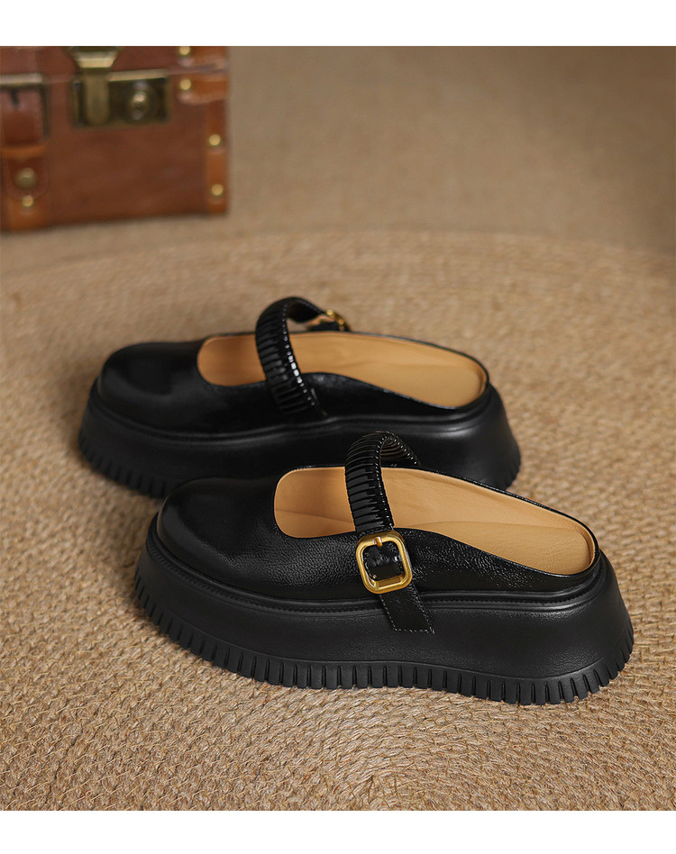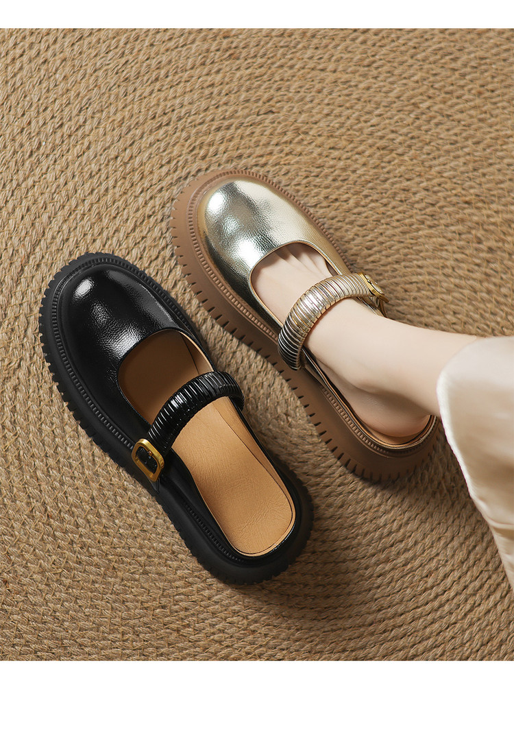 时尚外穿厚底包头半拖鞋女真皮懒人皮带扣凉拖坡跟松糕底金色单鞋