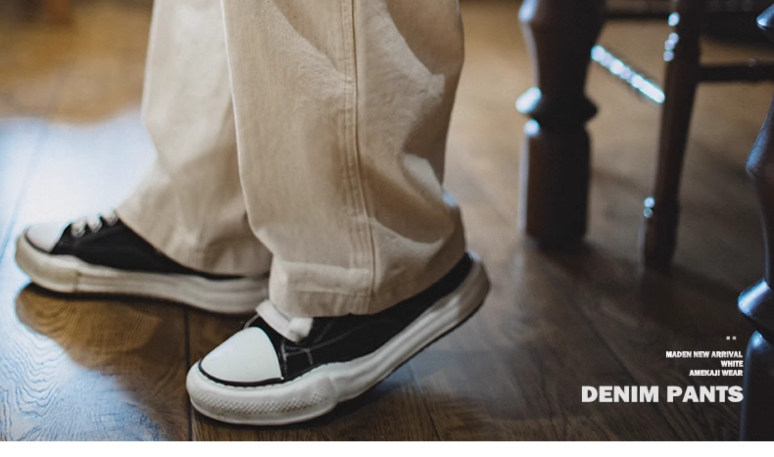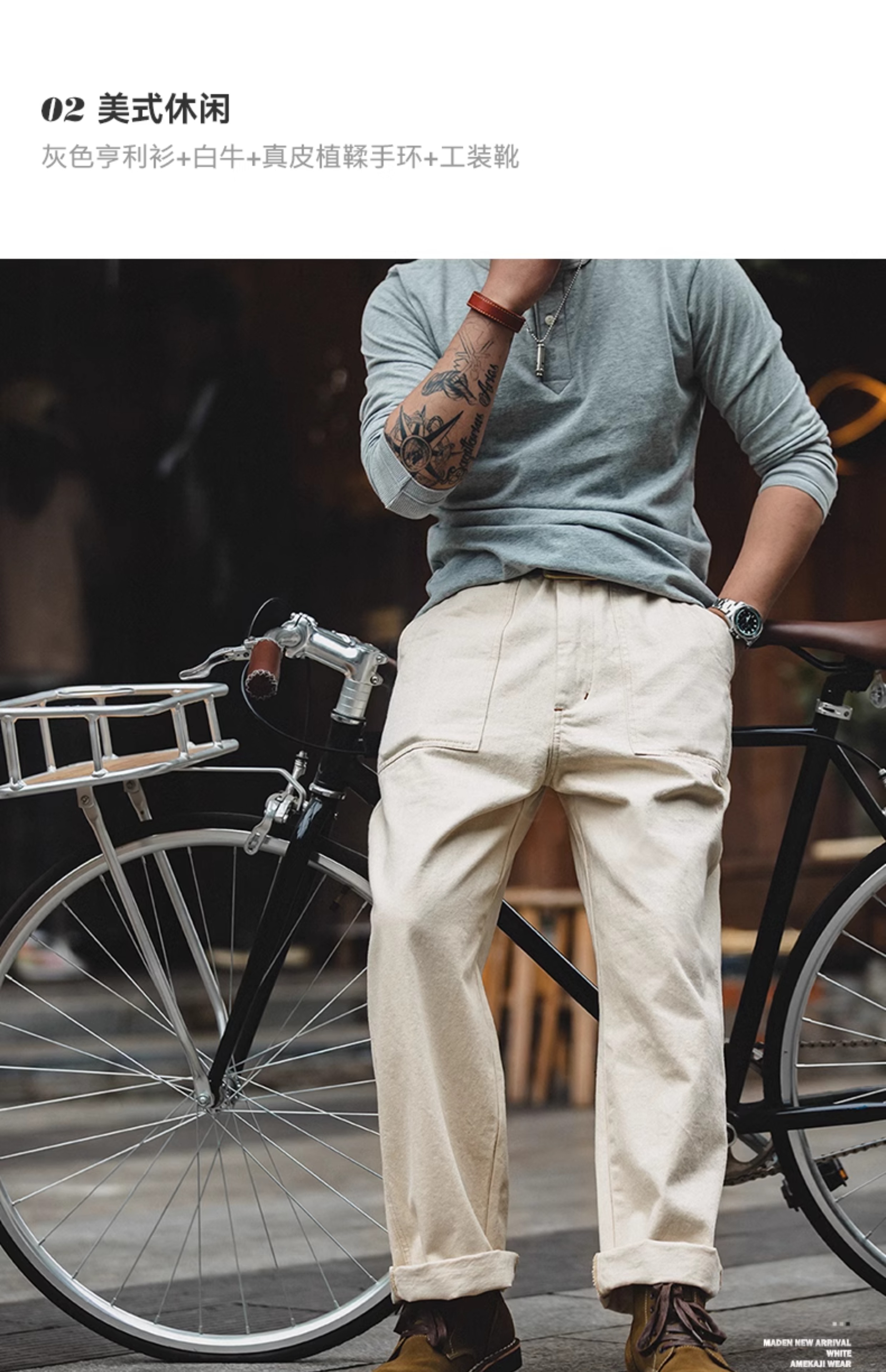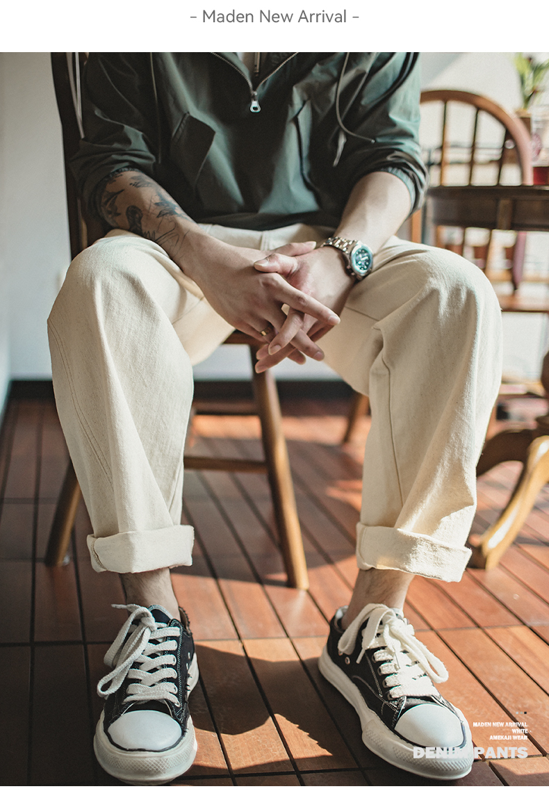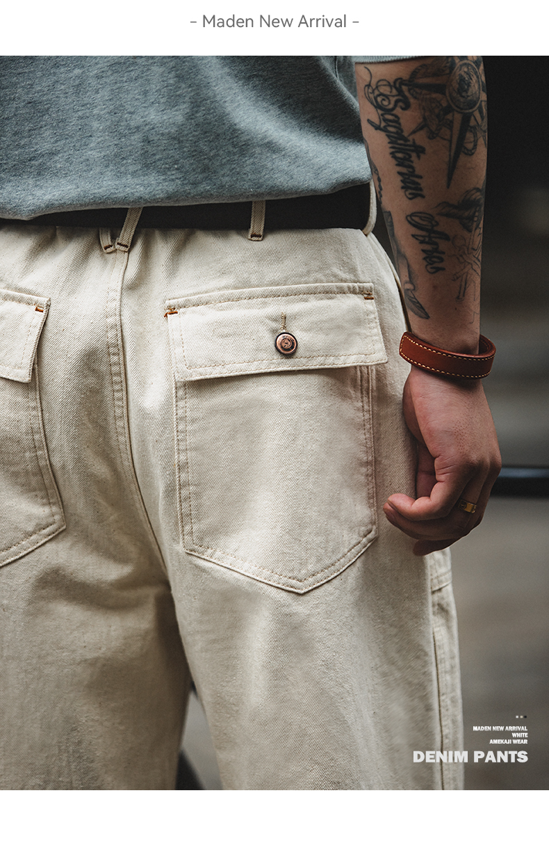 马登工装 美式复古棉籽壳白色牛仔裤宽松直筒阔腿休闲长裤子男春