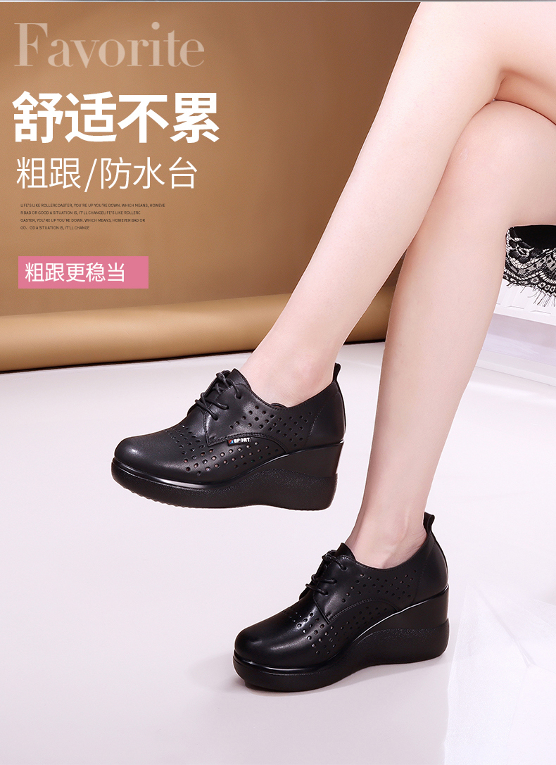 春秋新品坡跟洞洞凉鞋休闲防滑松糕摇摇单鞋真皮深口圆头系带女鞋