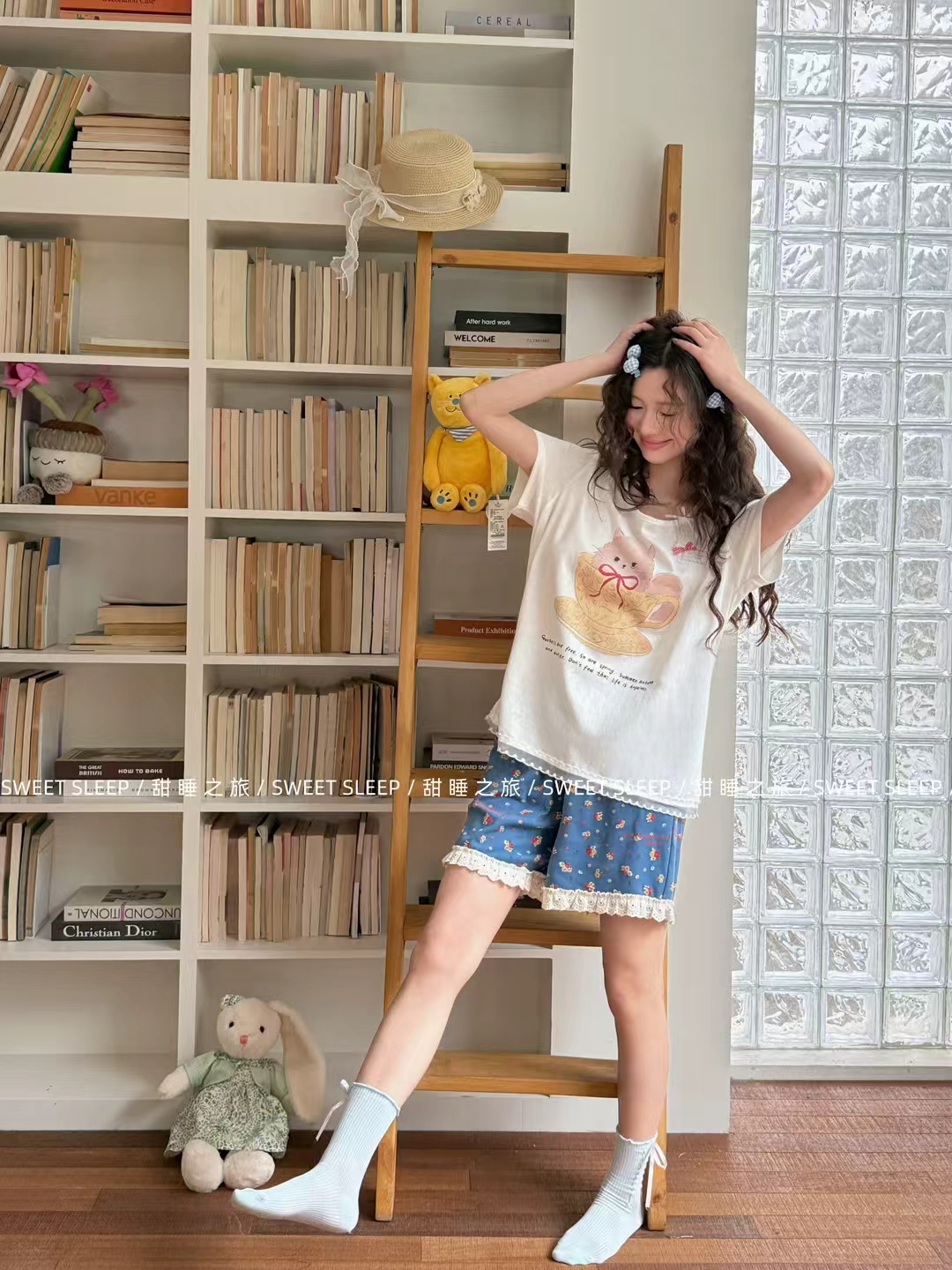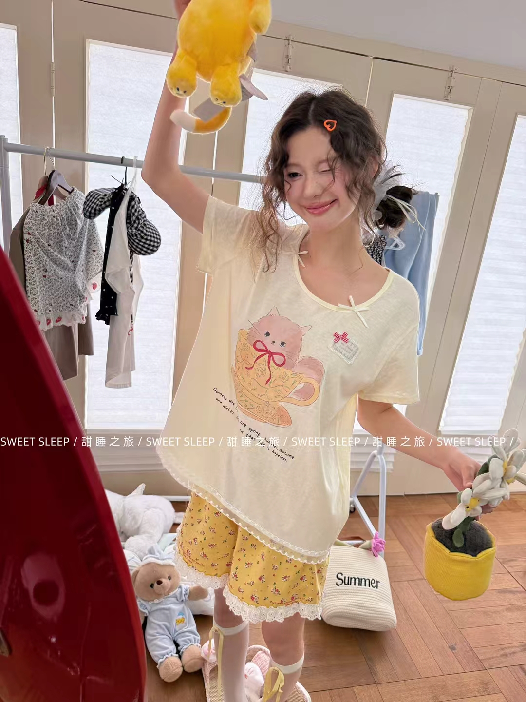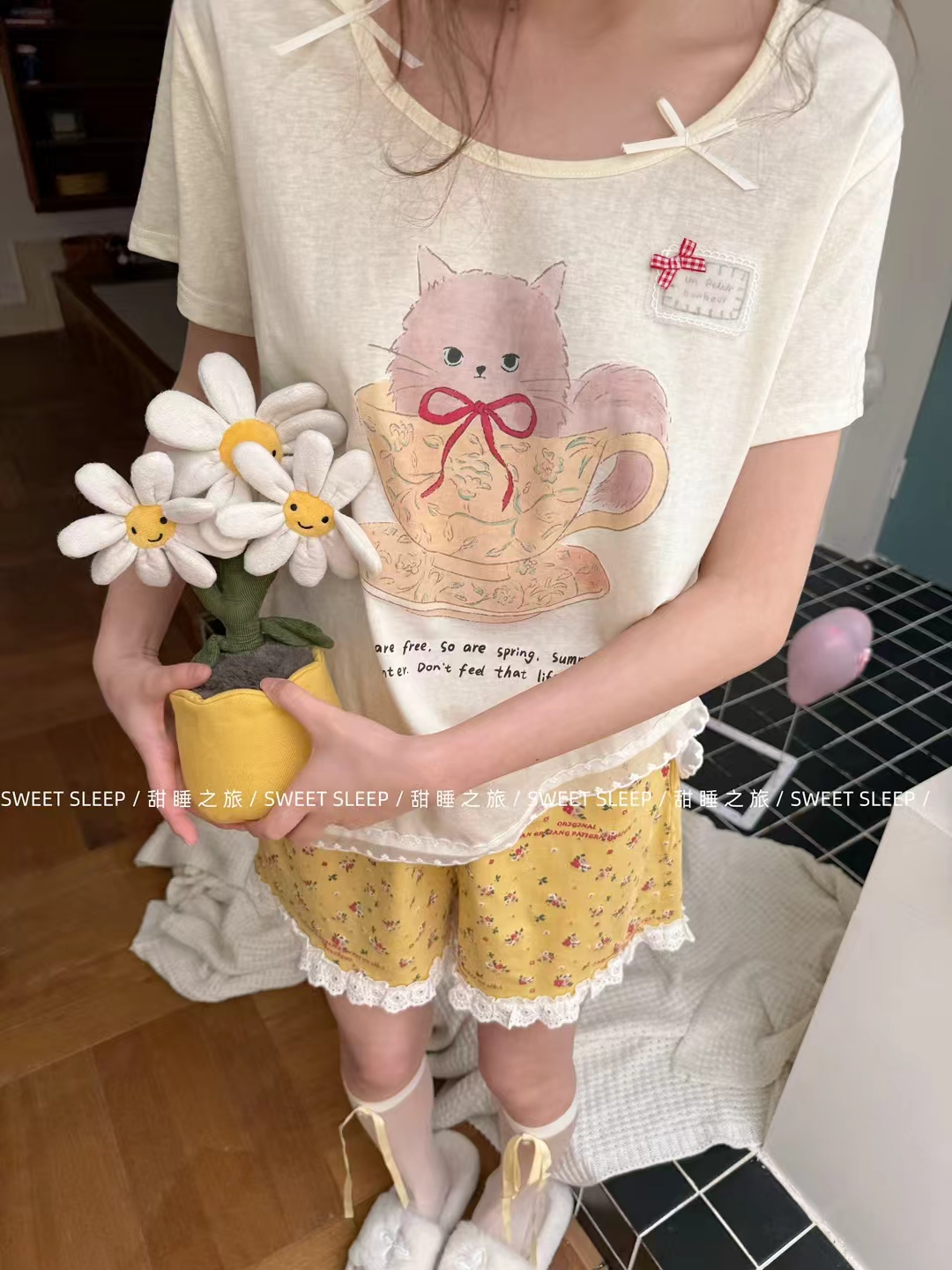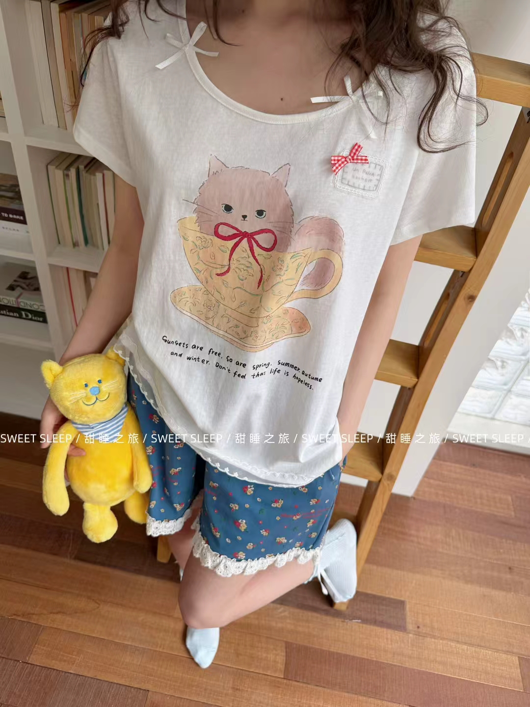Gill Aimar小熊家睡衣女夏季可爱猫咪短袖短裤田园碎花甜睡之旅