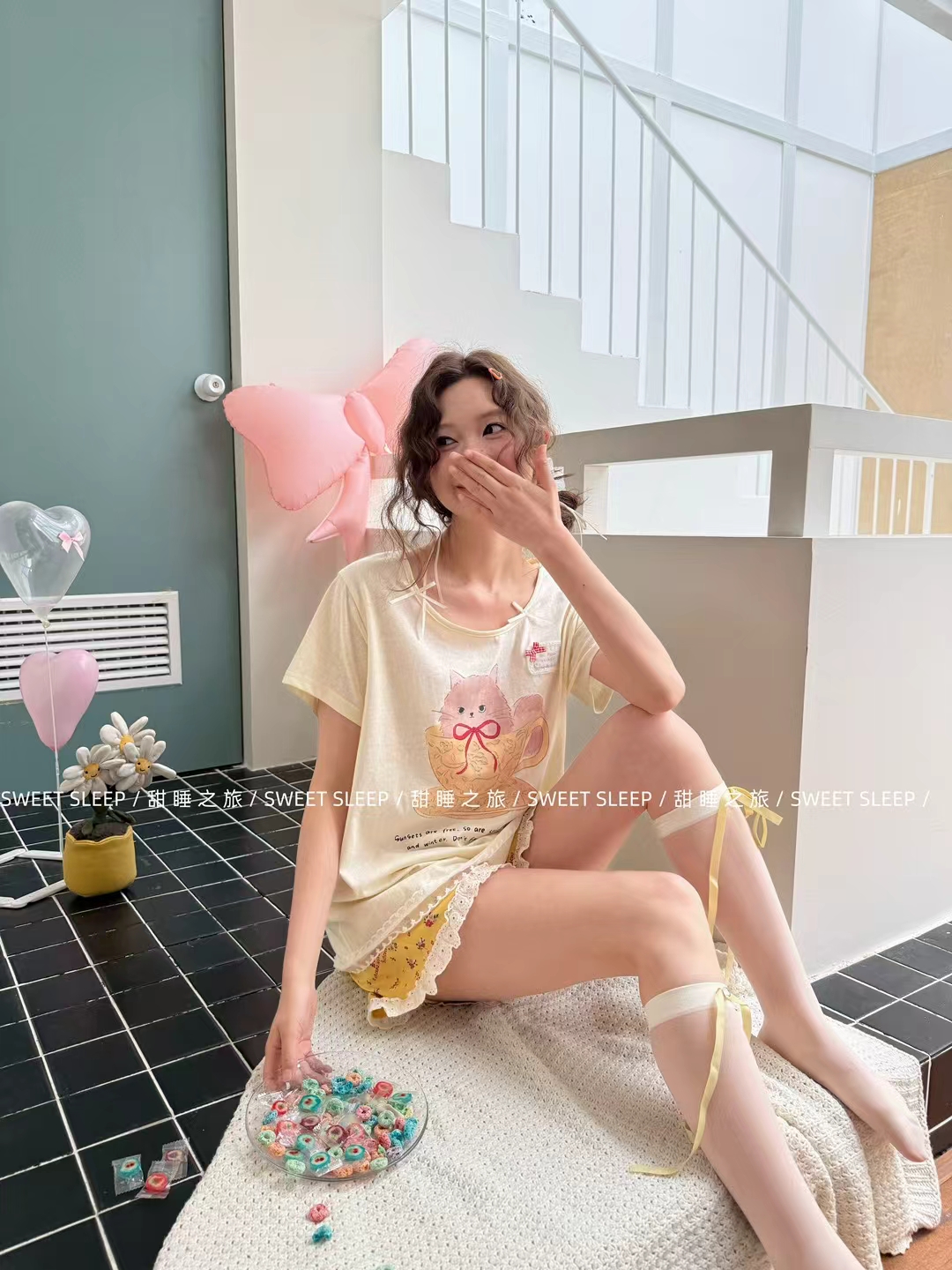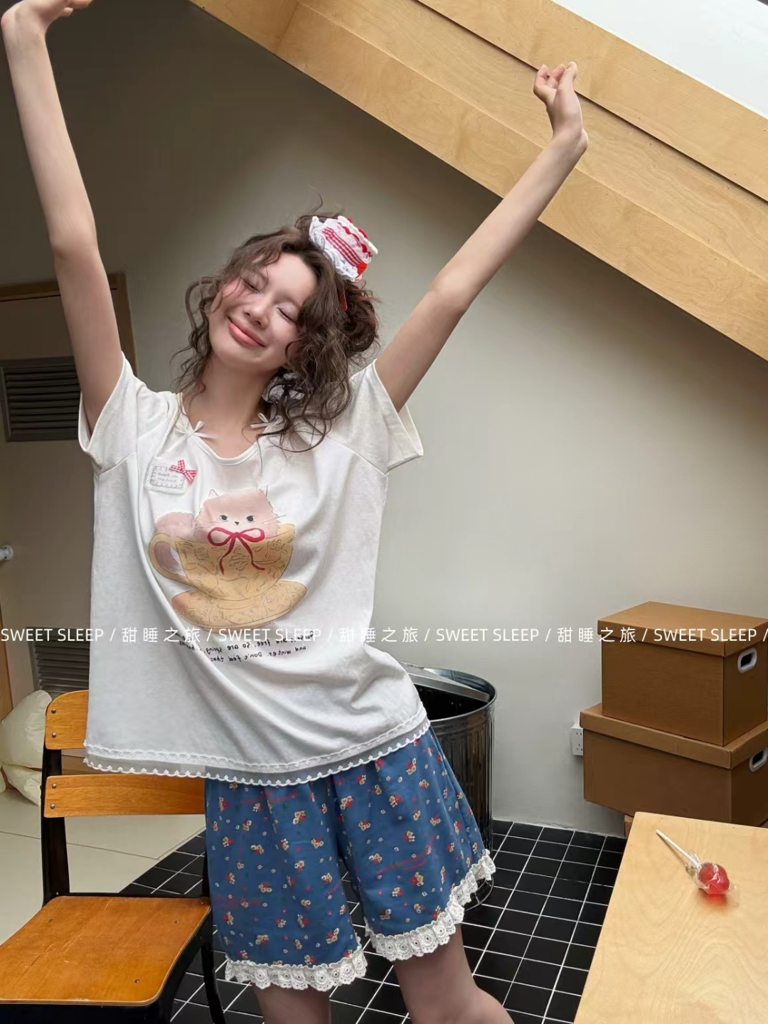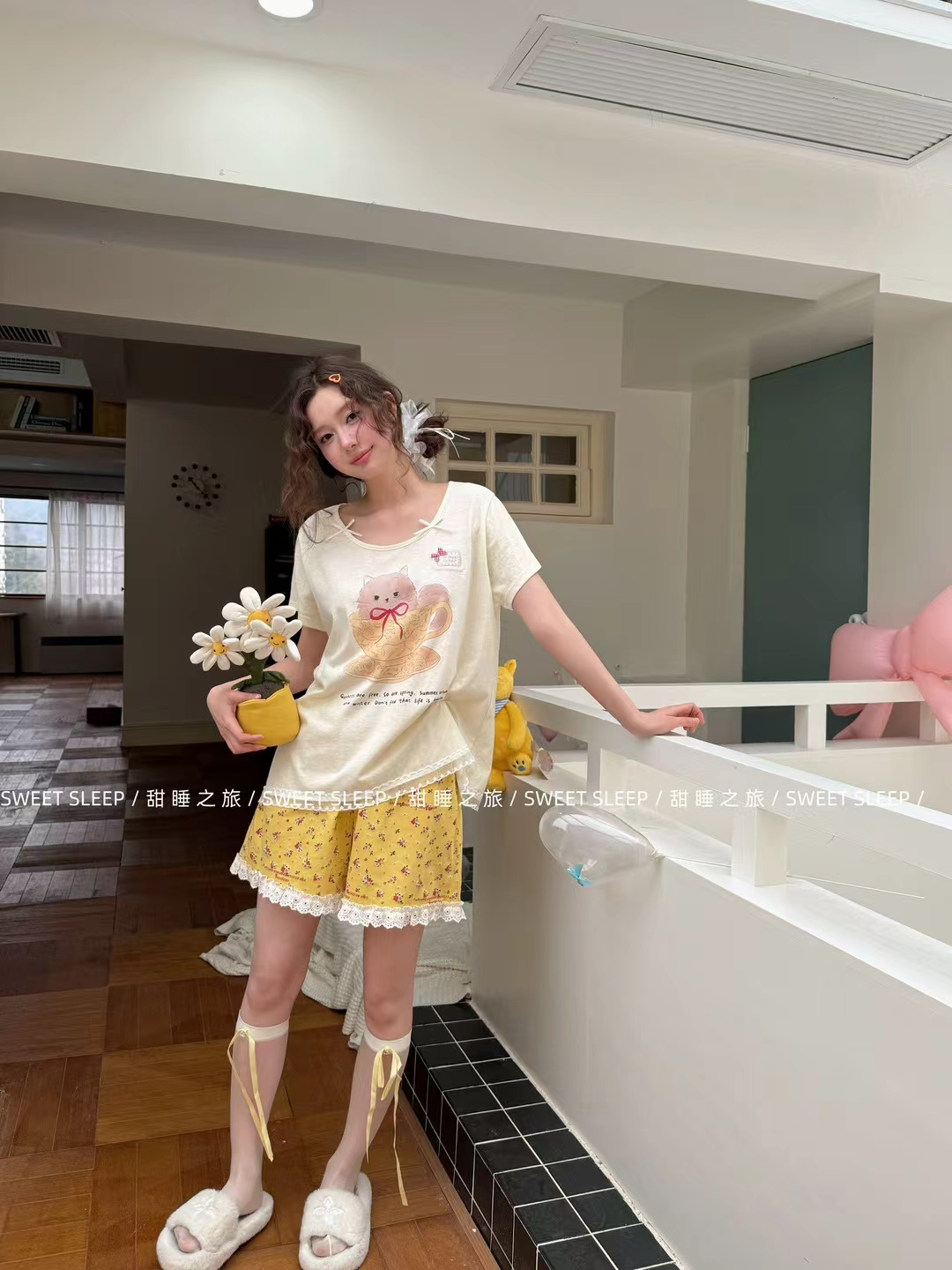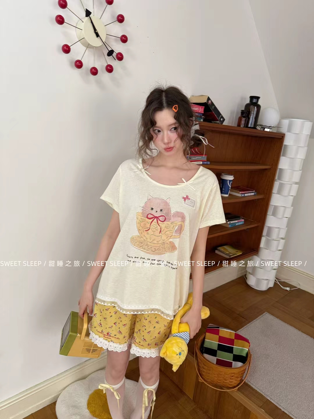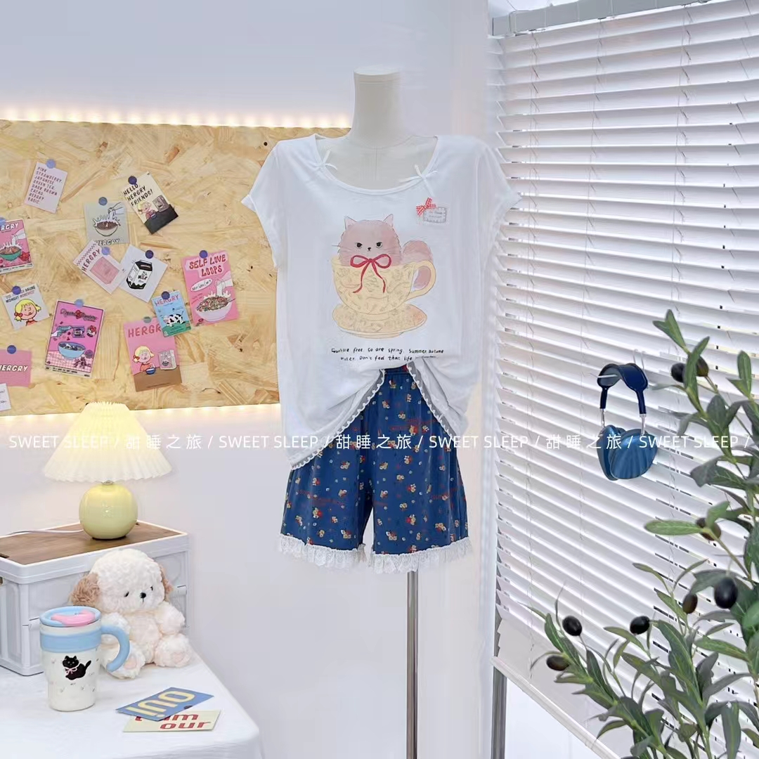 Gill Aimar小熊家睡衣女夏季可爱猫咪短袖短裤田园碎花甜睡之旅