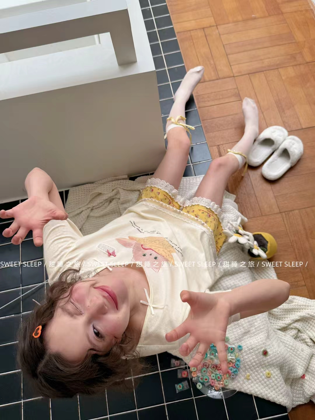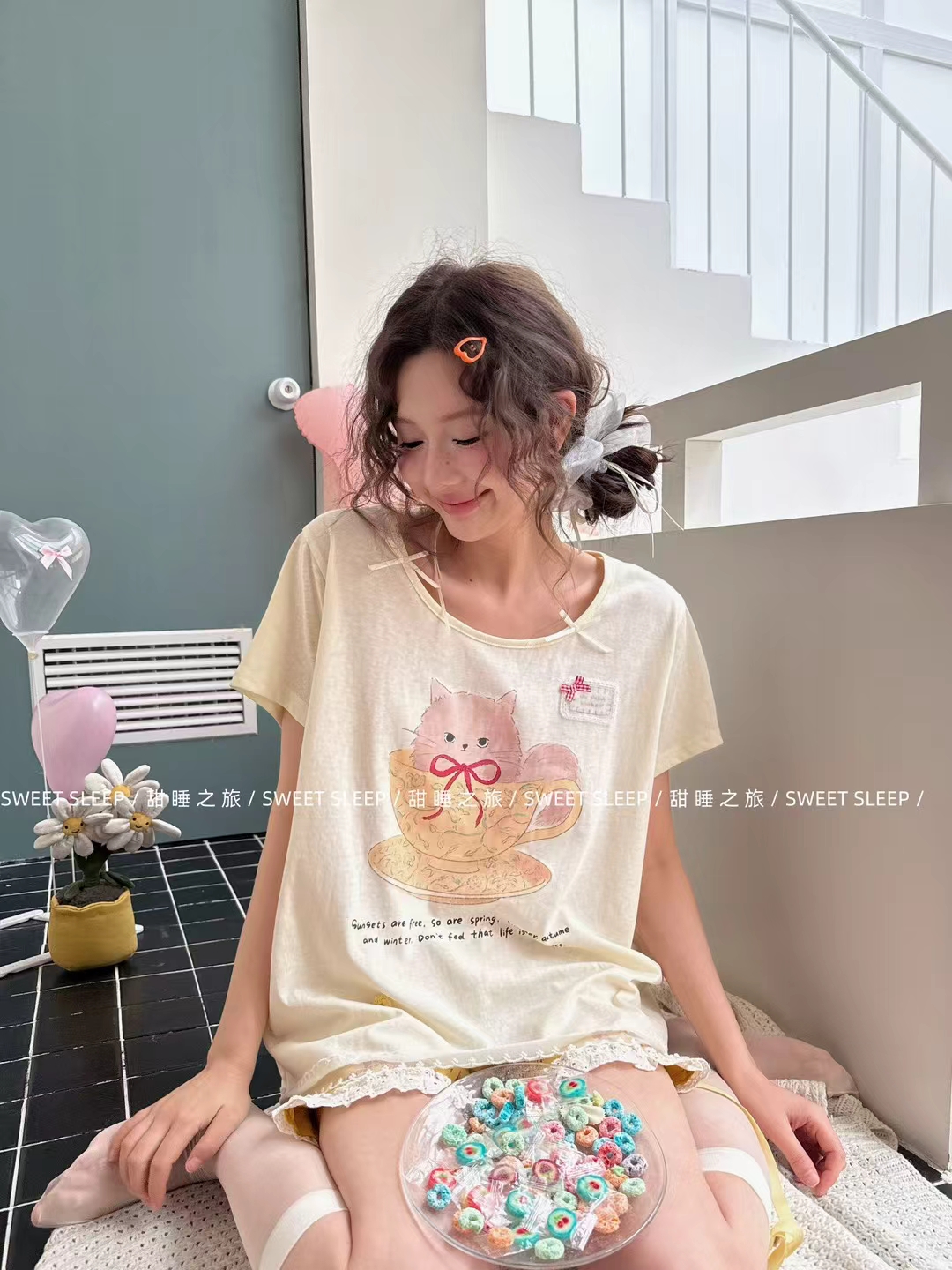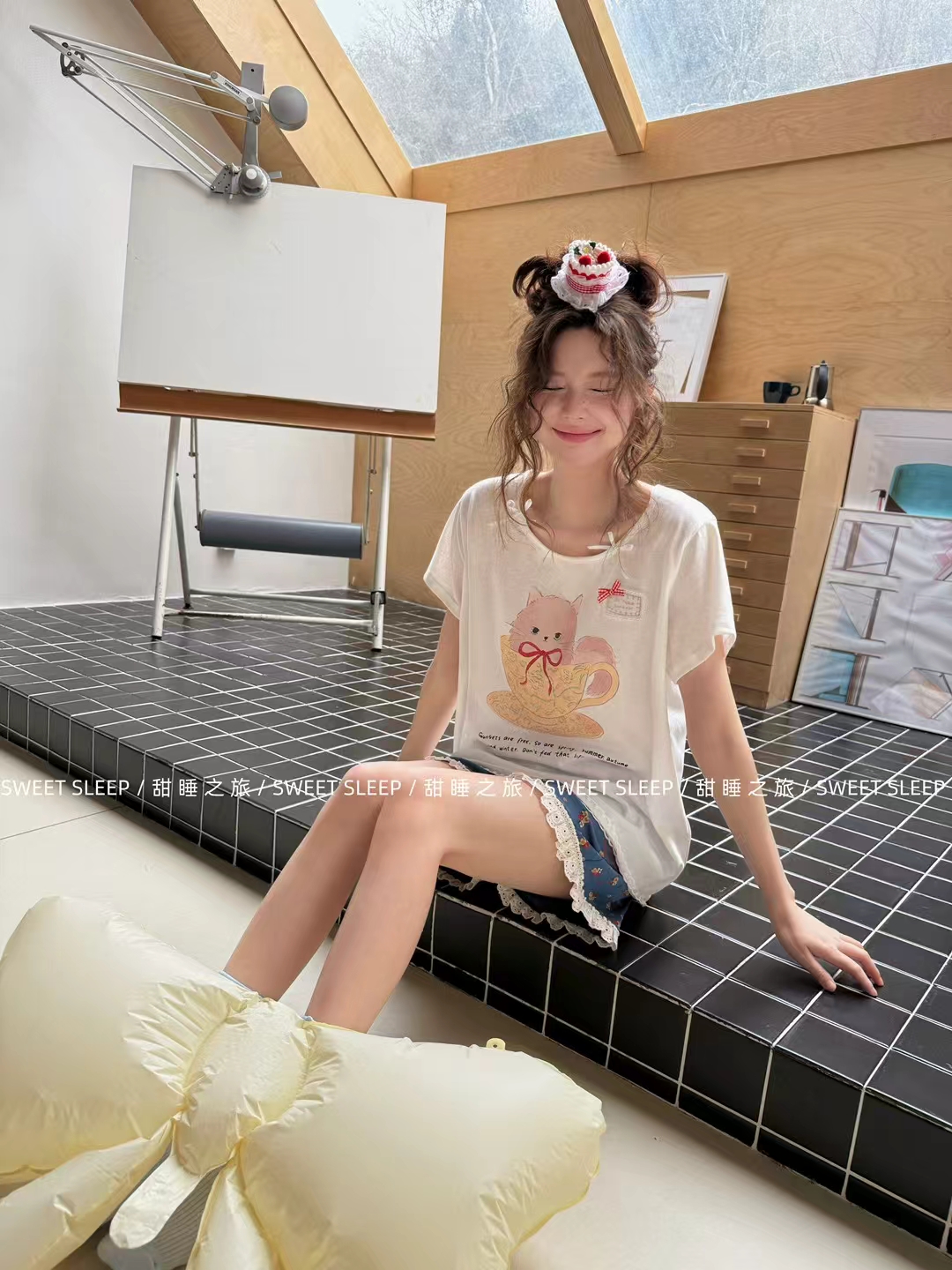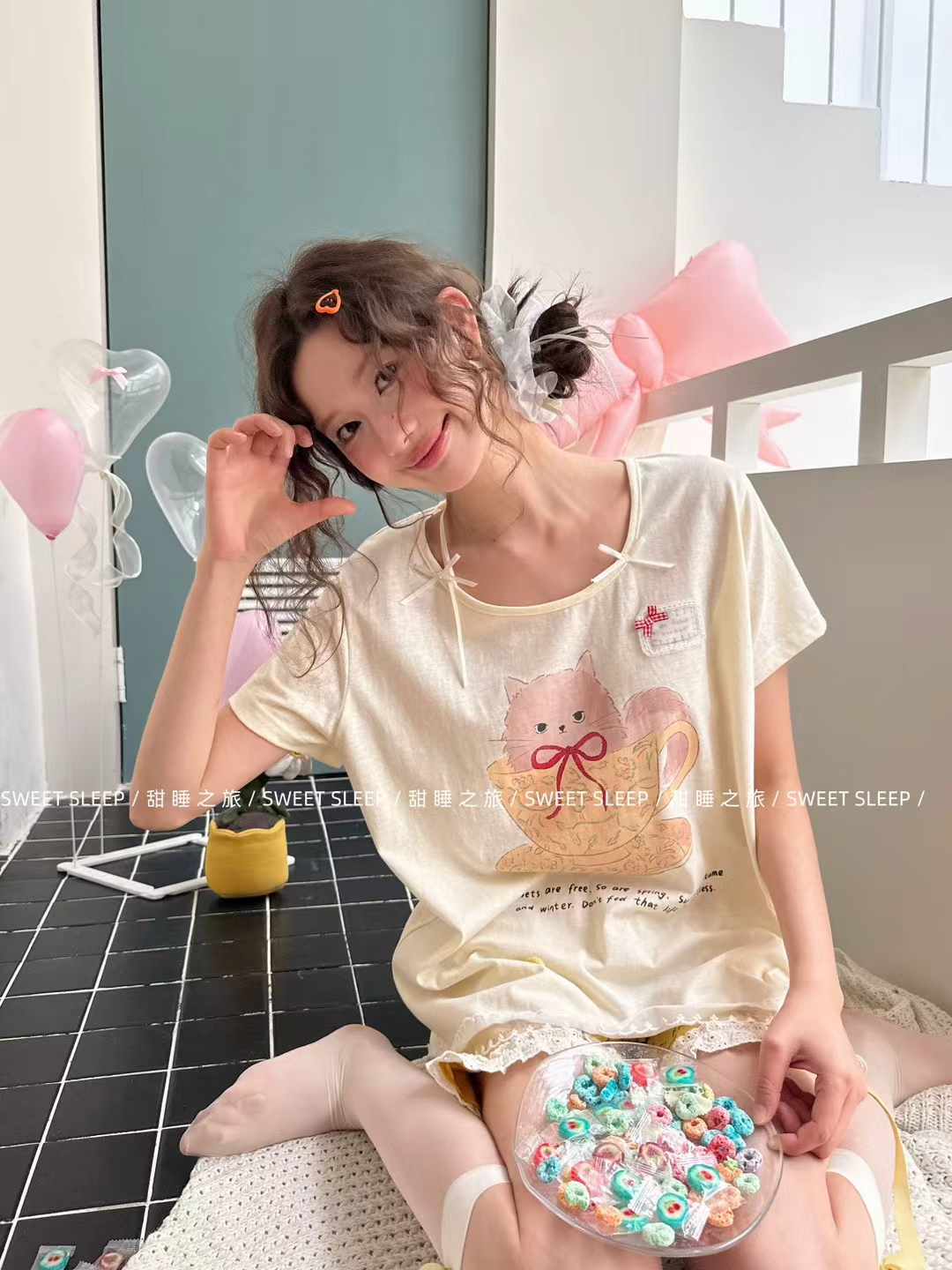 Gill Aimar小熊家睡衣女夏季可爱猫咪短袖短裤田园碎花甜睡之旅