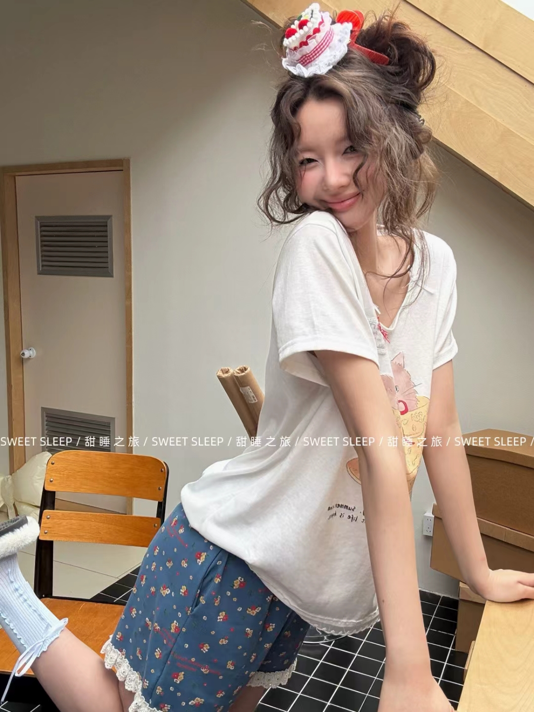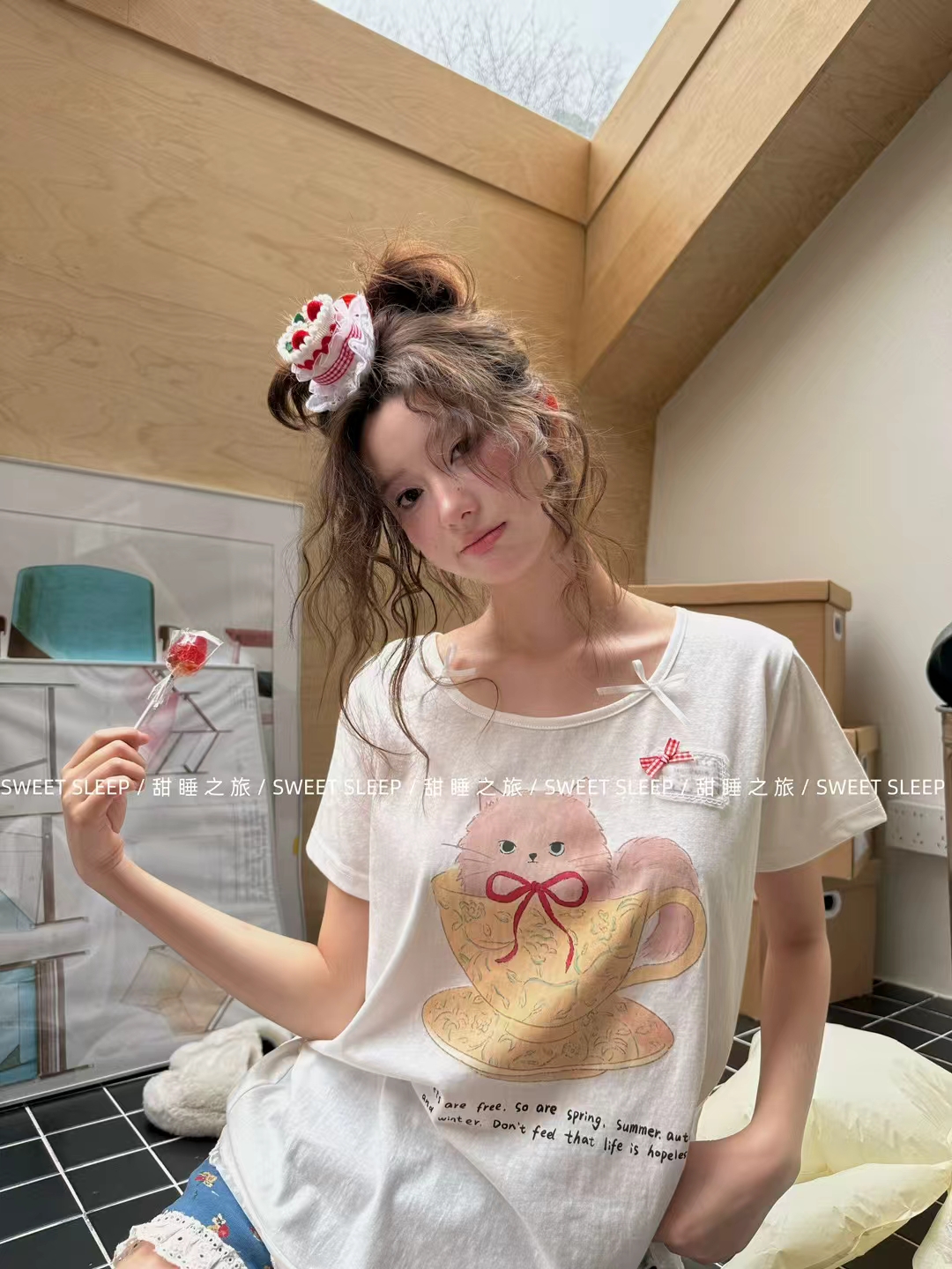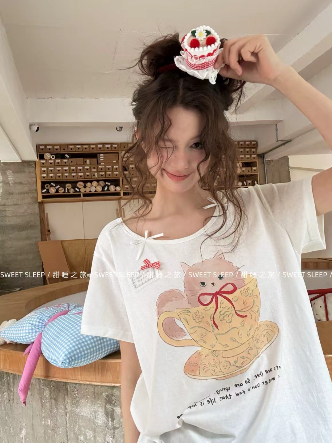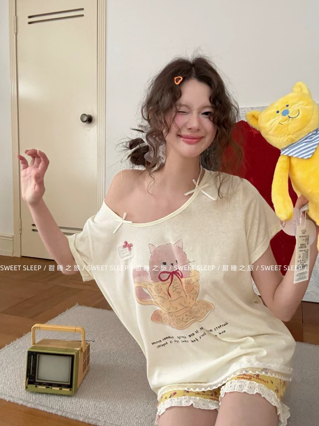 Gill Aimar小熊家睡衣女夏季可爱猫咪短袖短裤田园碎花甜睡之旅