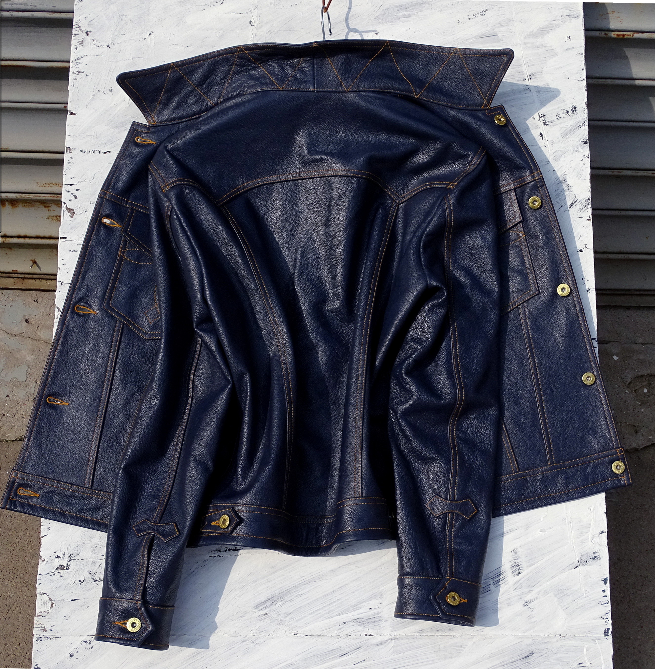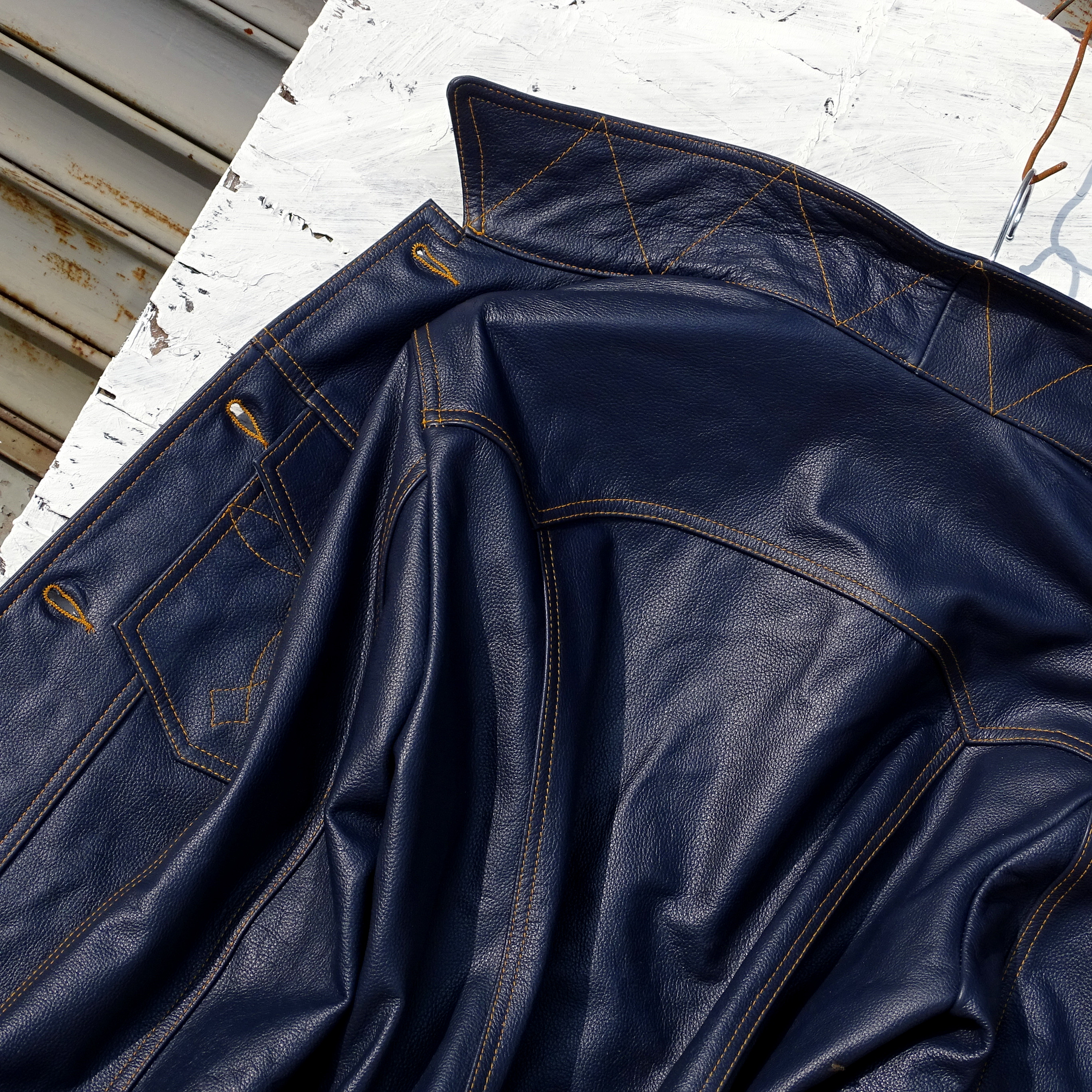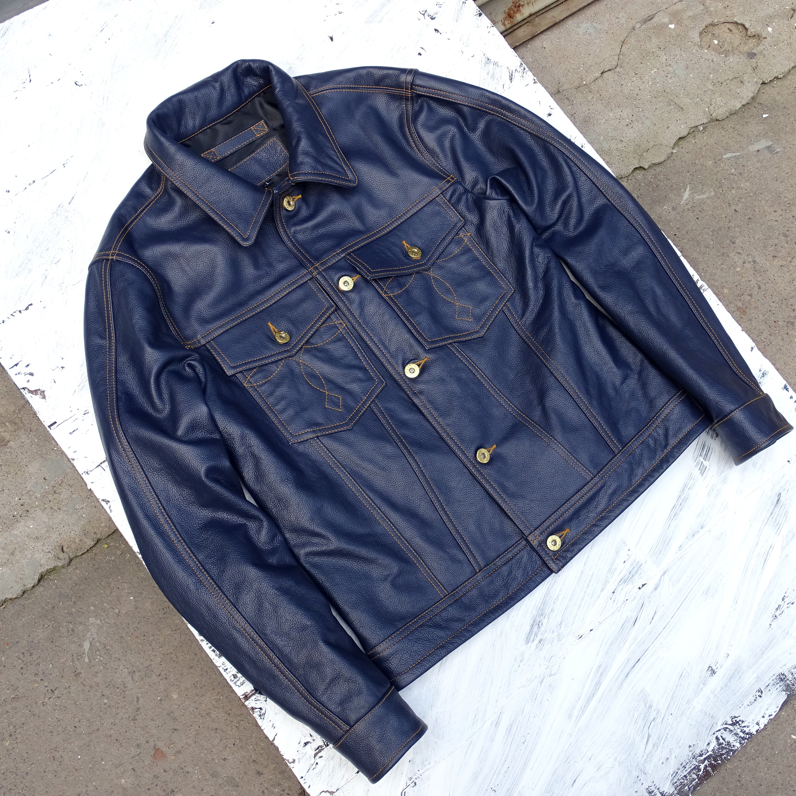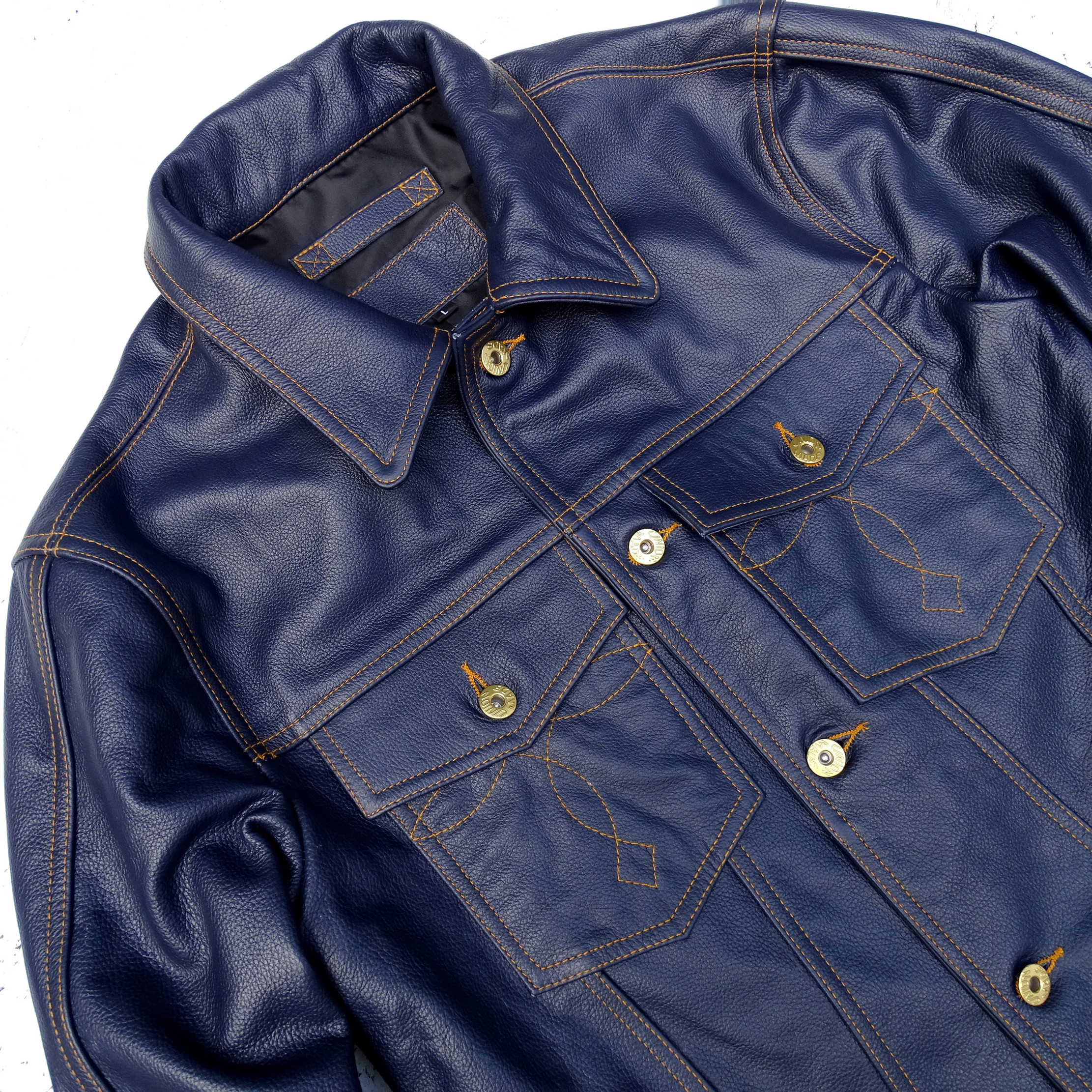 风暴骑士刺绣袋花牛仔蓝色荔枝纹头层牛皮男真皮皮衣夹克通勤外套