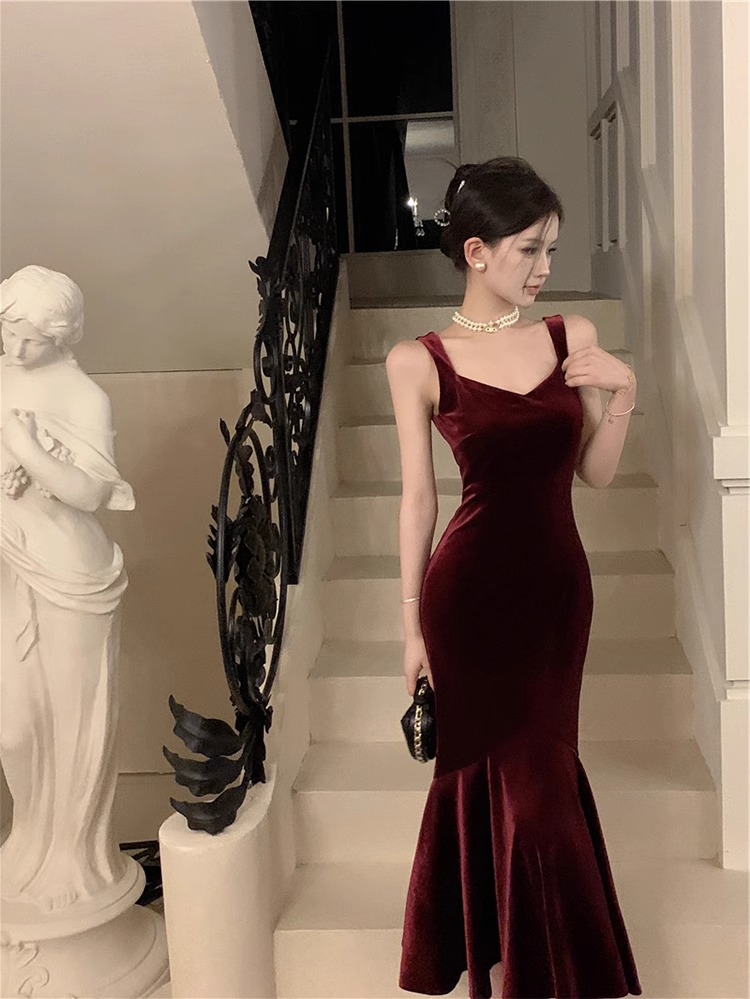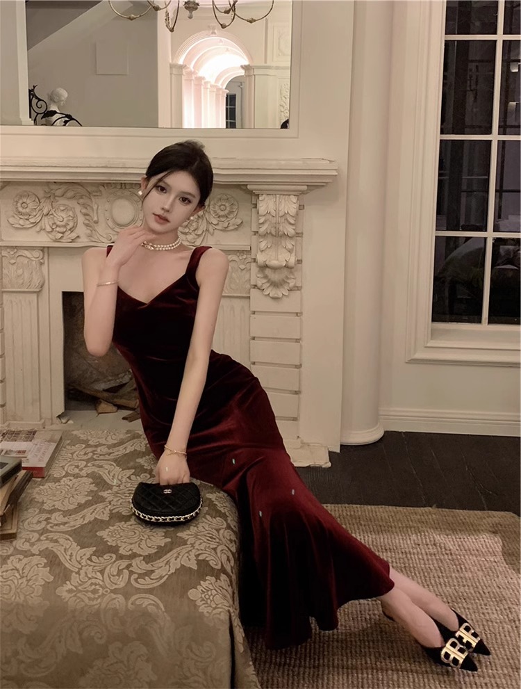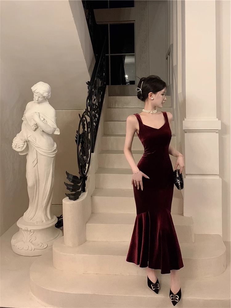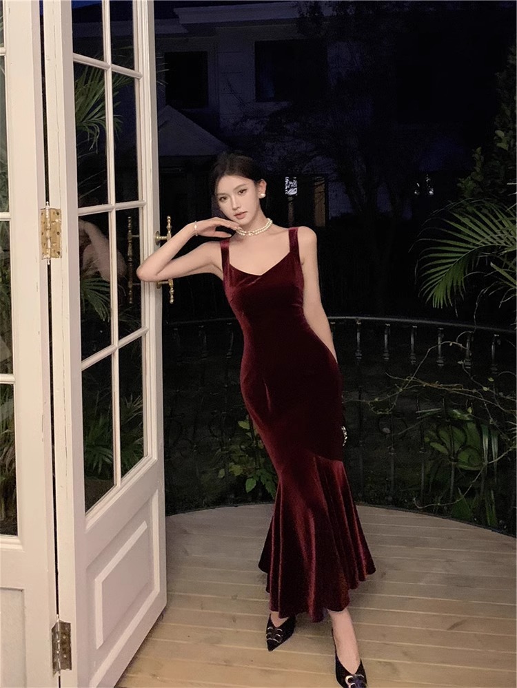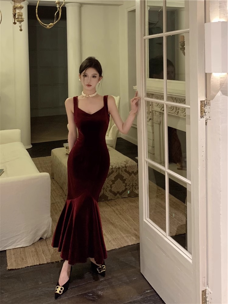 大码女装高级感法式吊带连衣裙女酒红色年会丝绒礼服裙气质鱼尾裙