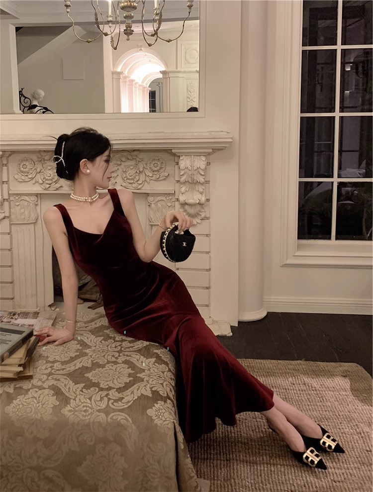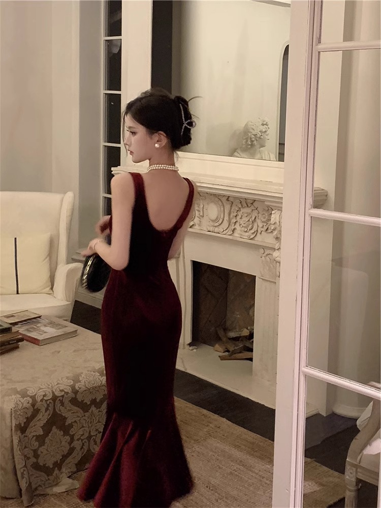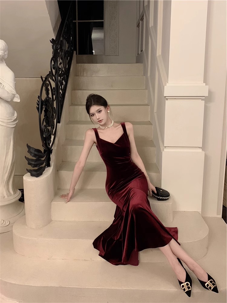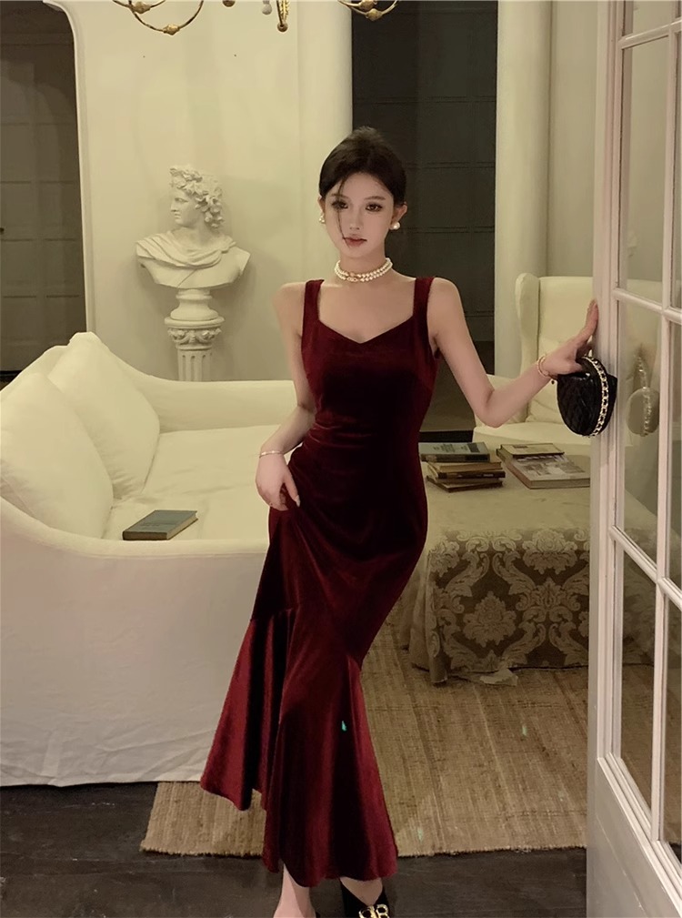 大码女装高级感法式吊带连衣裙女酒红色年会丝绒礼服裙气质鱼尾裙
