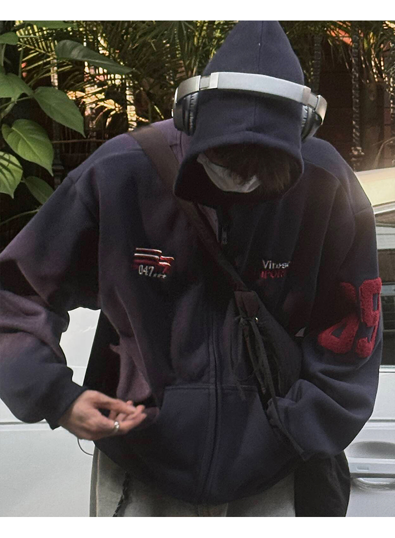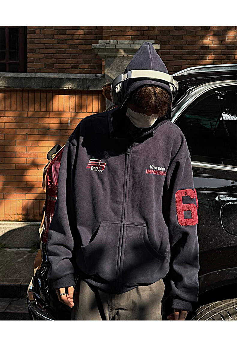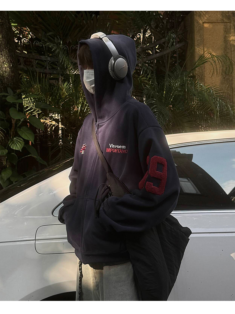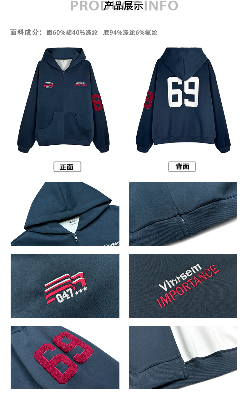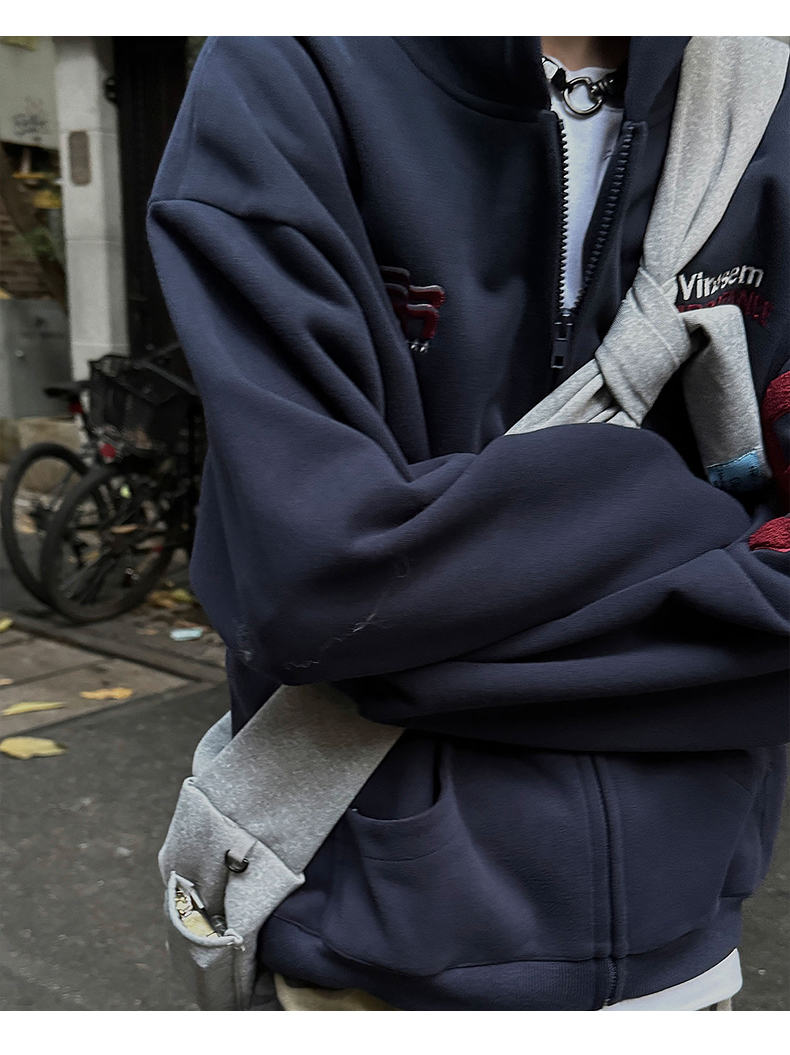 雀斑男装重磅刺绣开衫帽衫春秋季国潮牌美式复古运动连帽卫衣外套