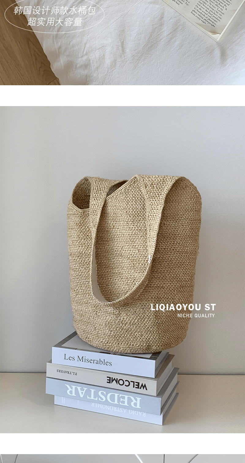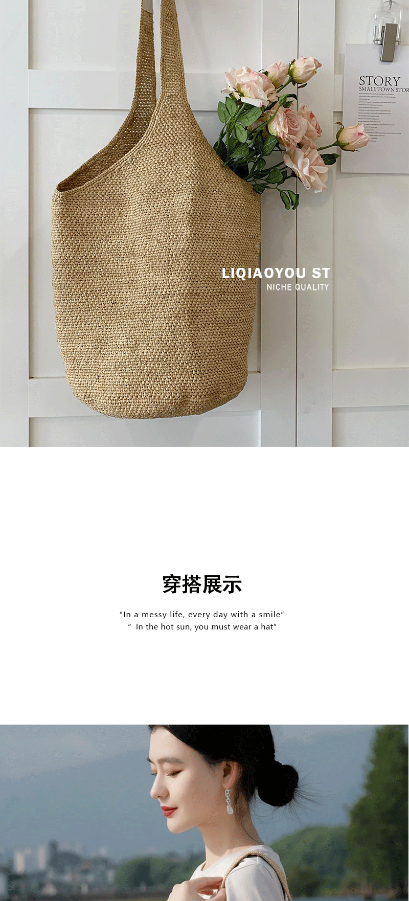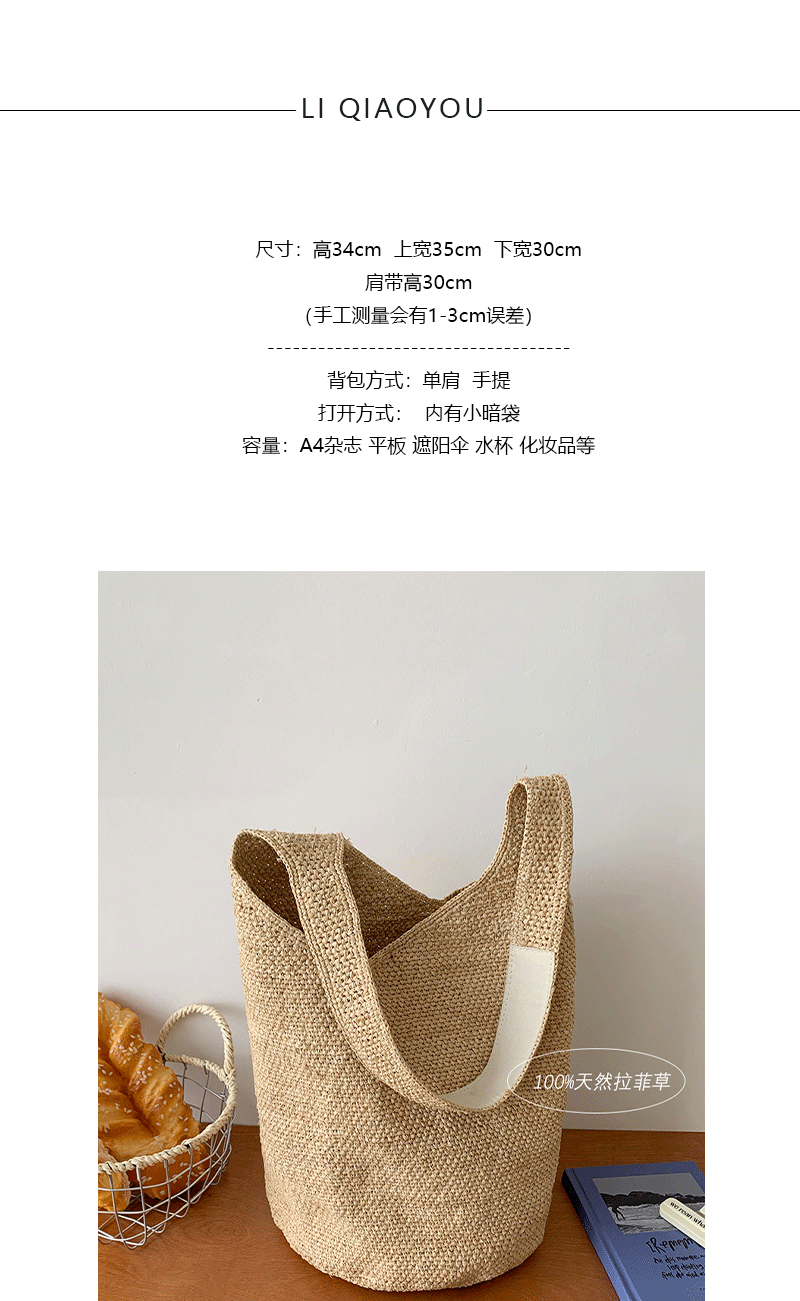 李乔优 简约高级100%拉菲草单肩水桶包大容量百搭度假沙滩编织包