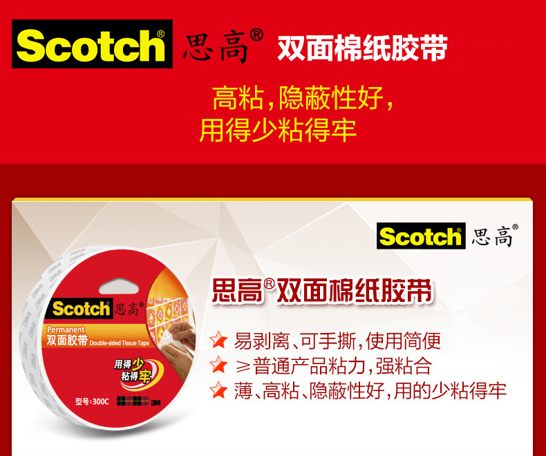 包邮3M双面胶思高双面棉纸胶带300C 18mm 24mm*9.5m粘得牢易剥离 易剥离 强粘合布基双面胶带粘性足