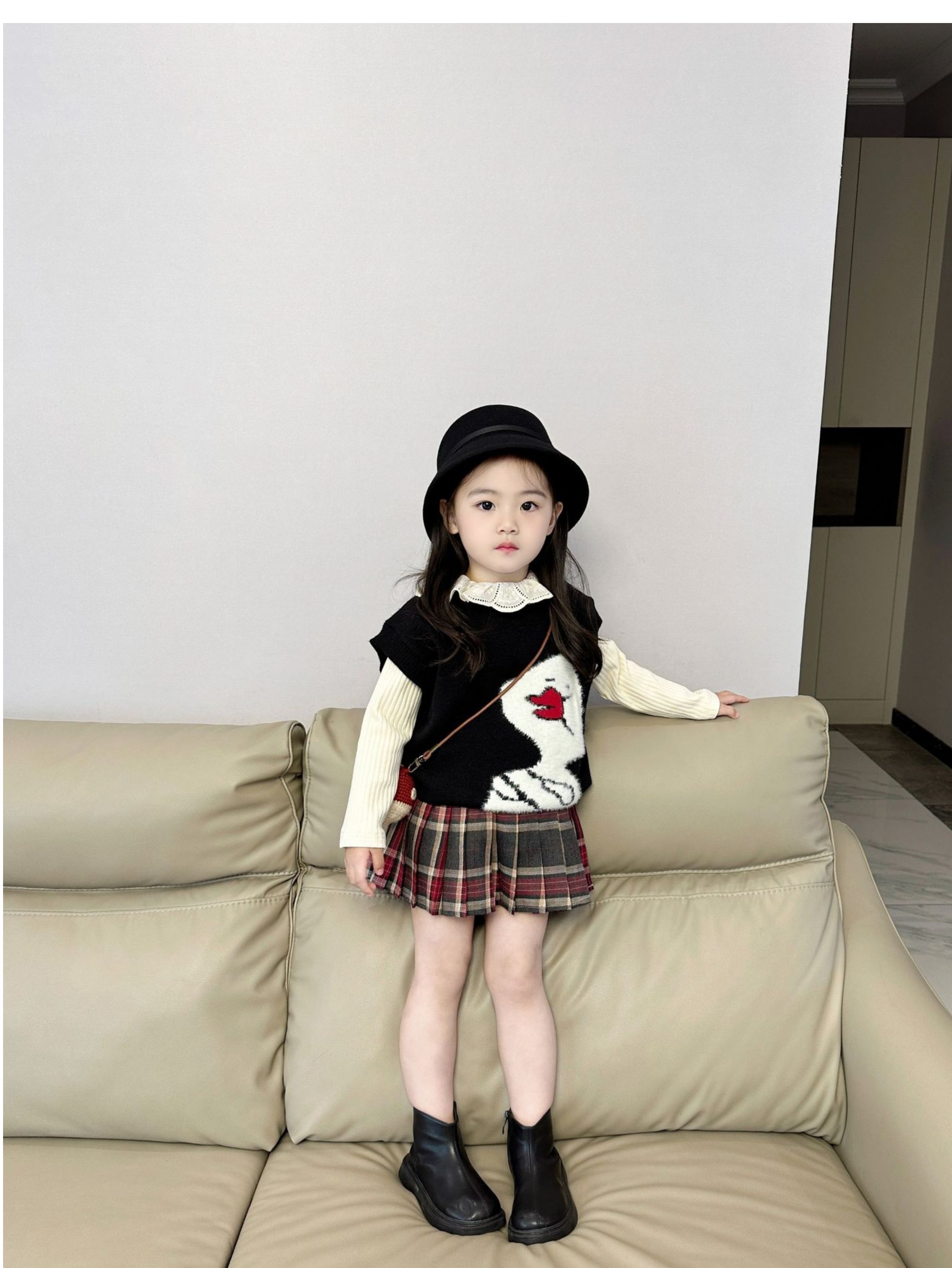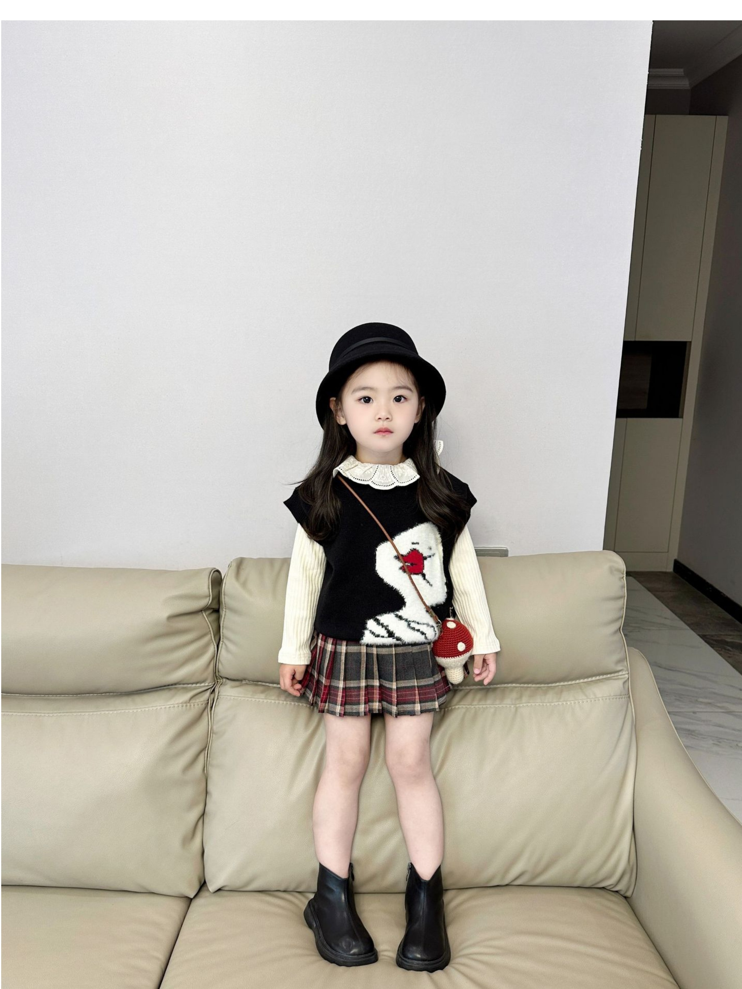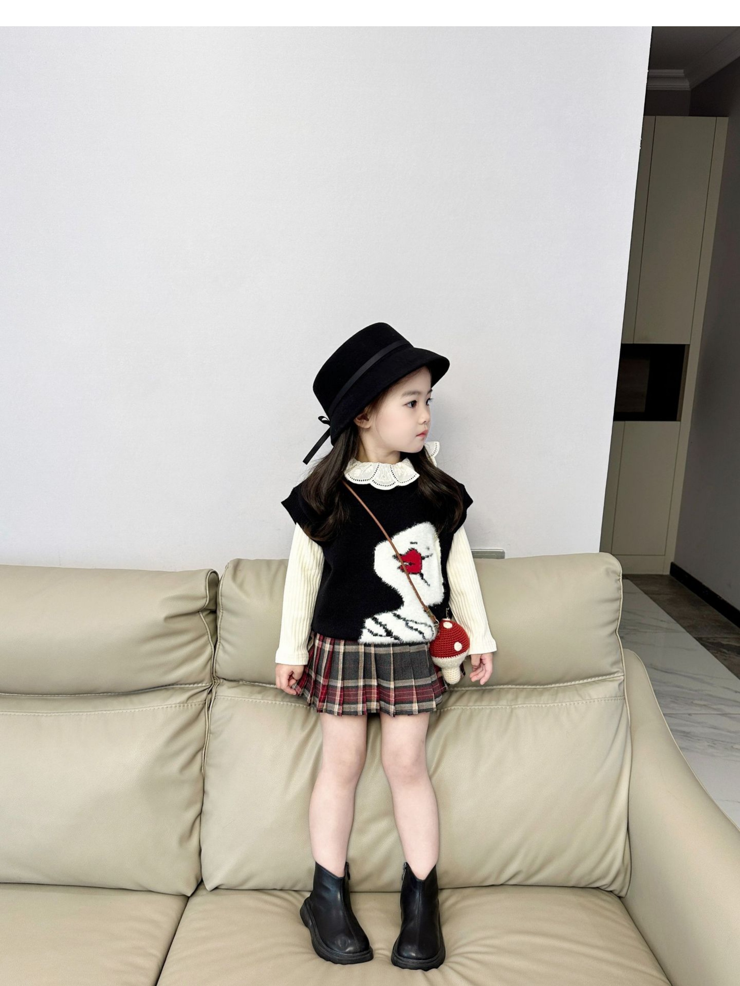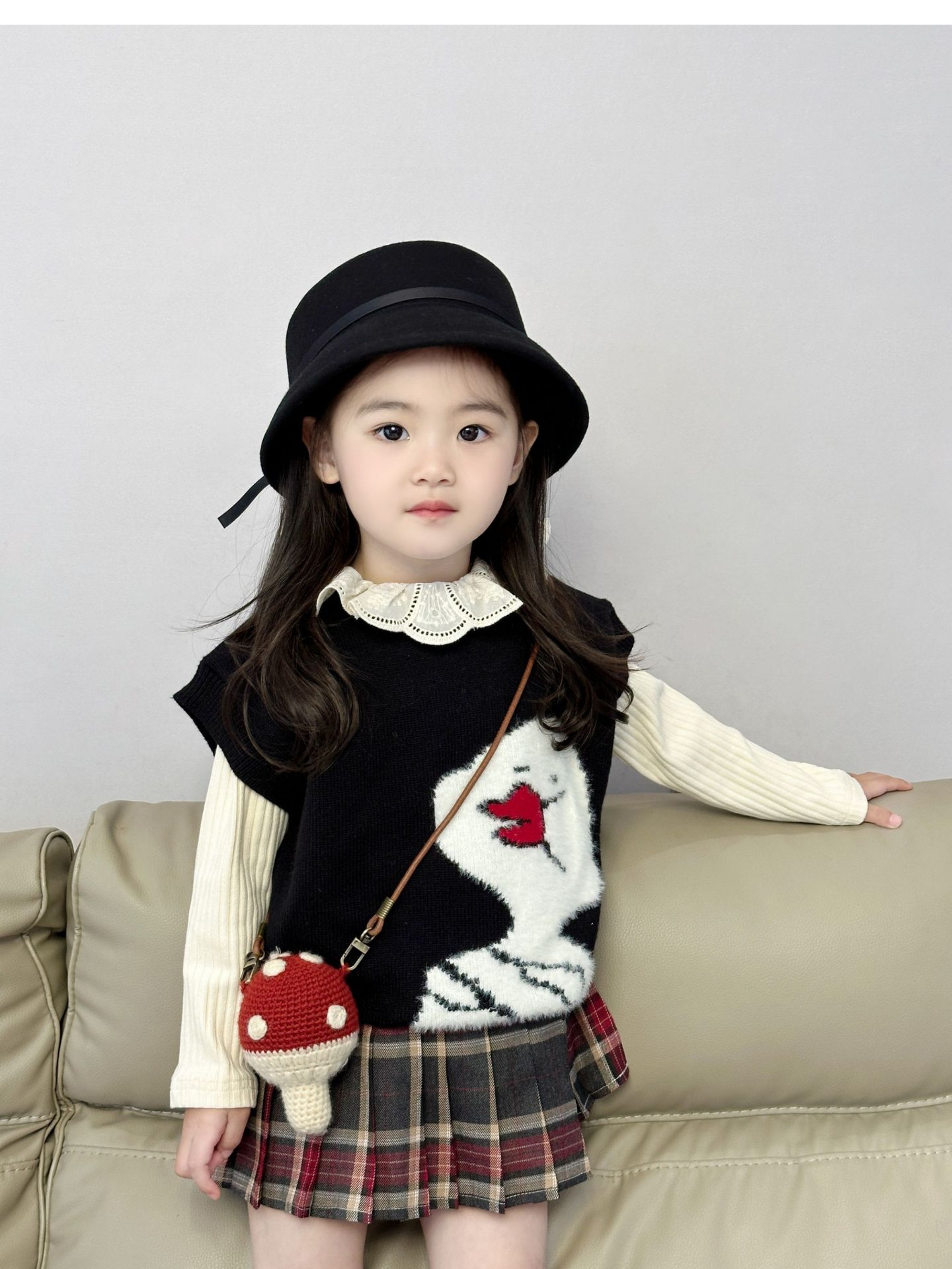 女童针织套装2024秋季韩版毛线马甲背心长袖翻领打底衫百褶裙短裙