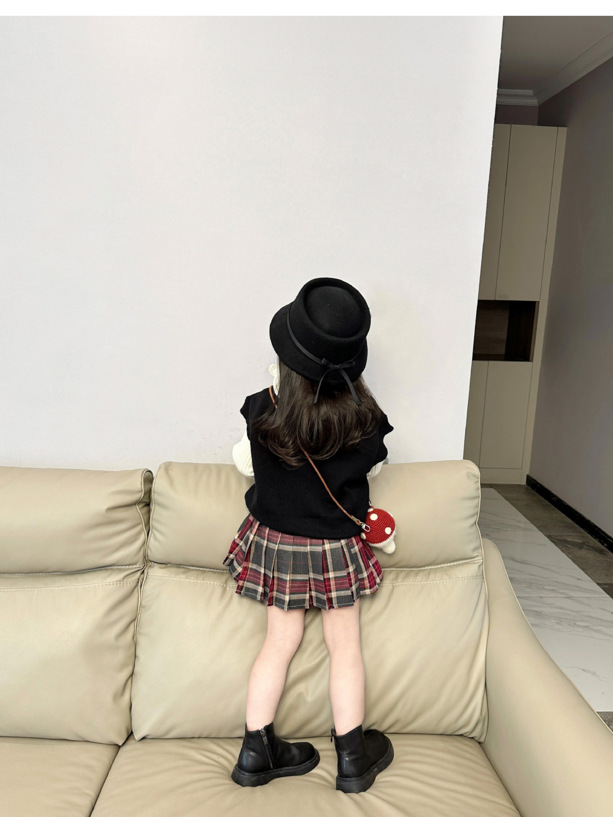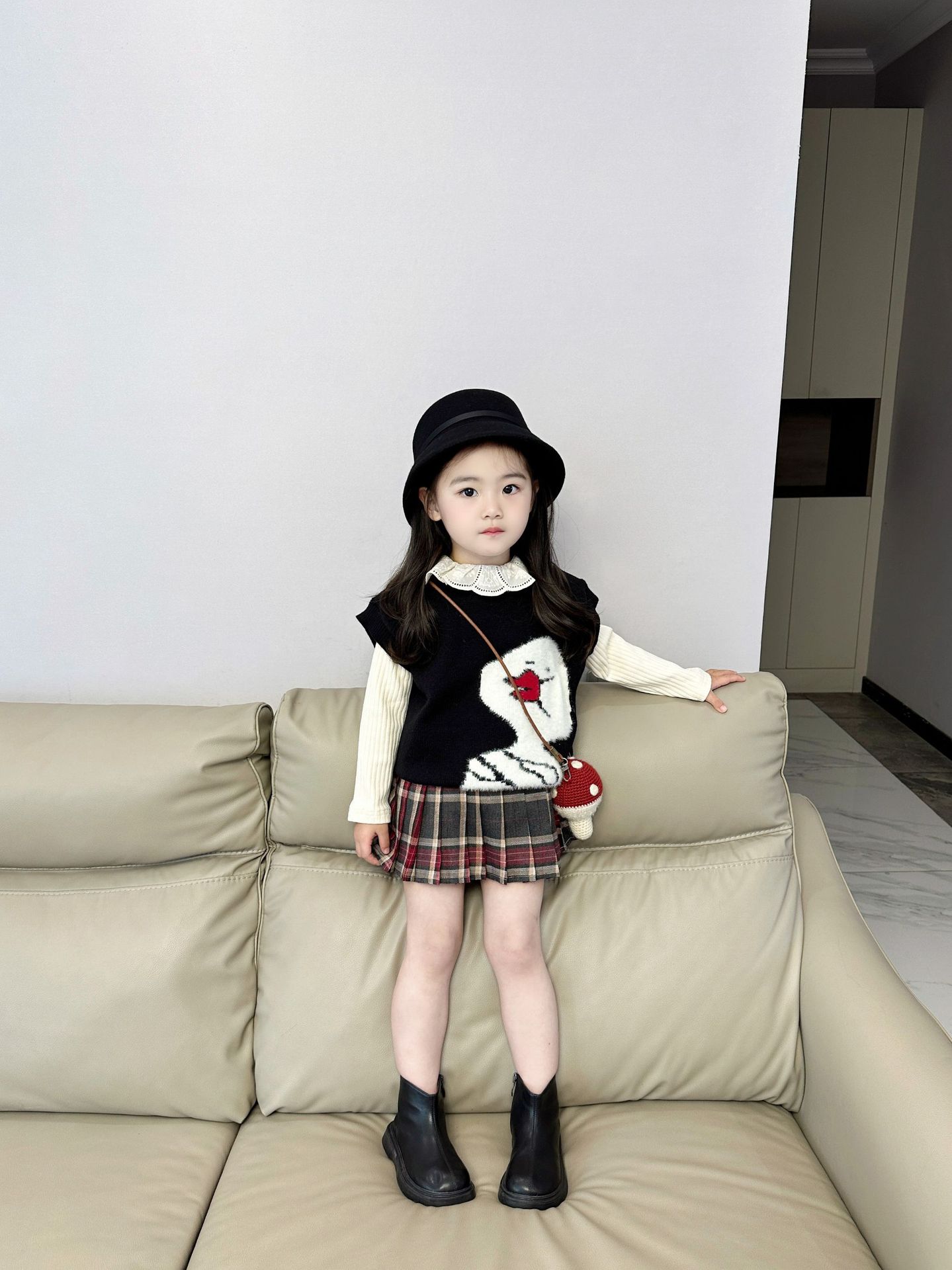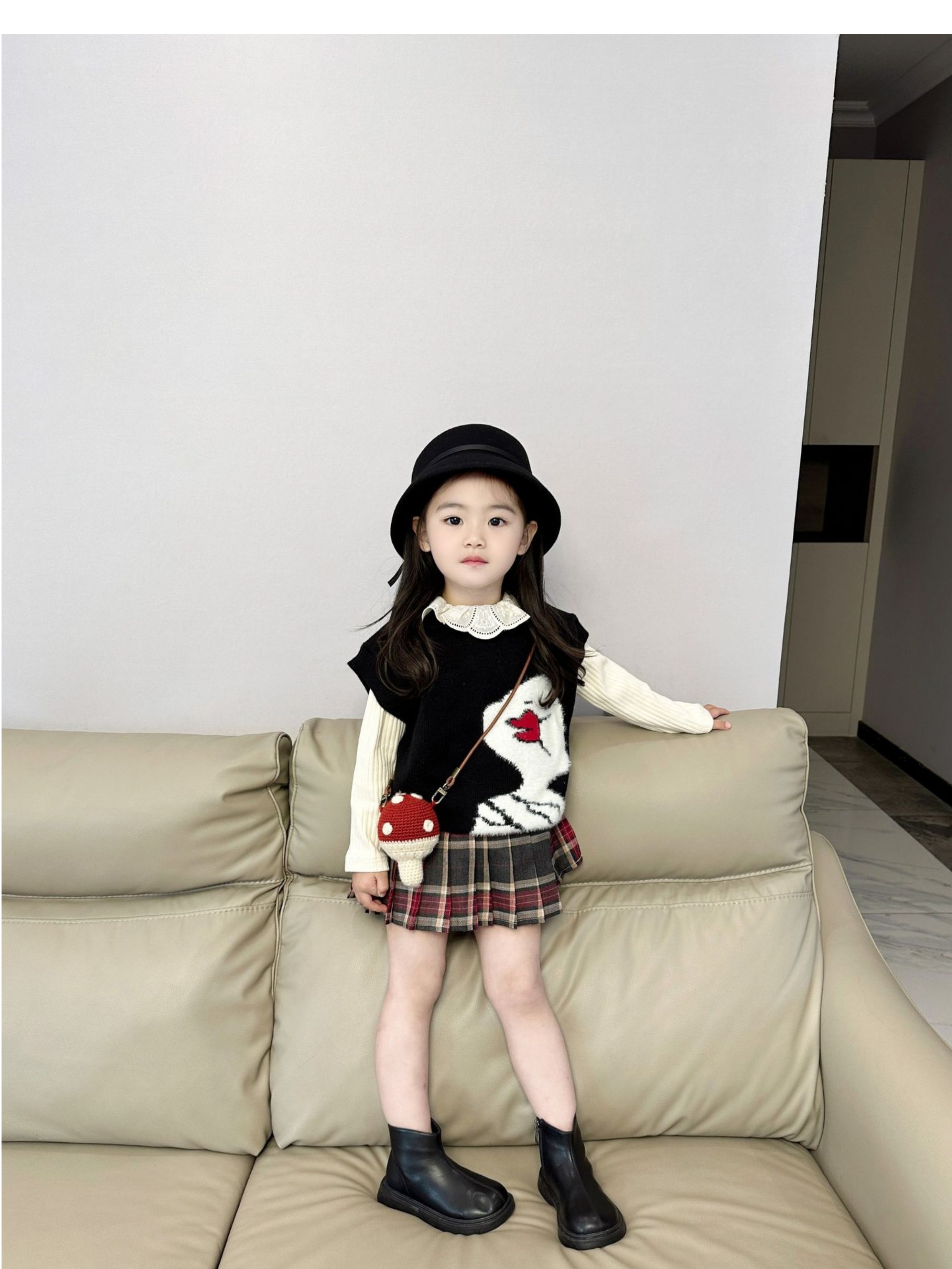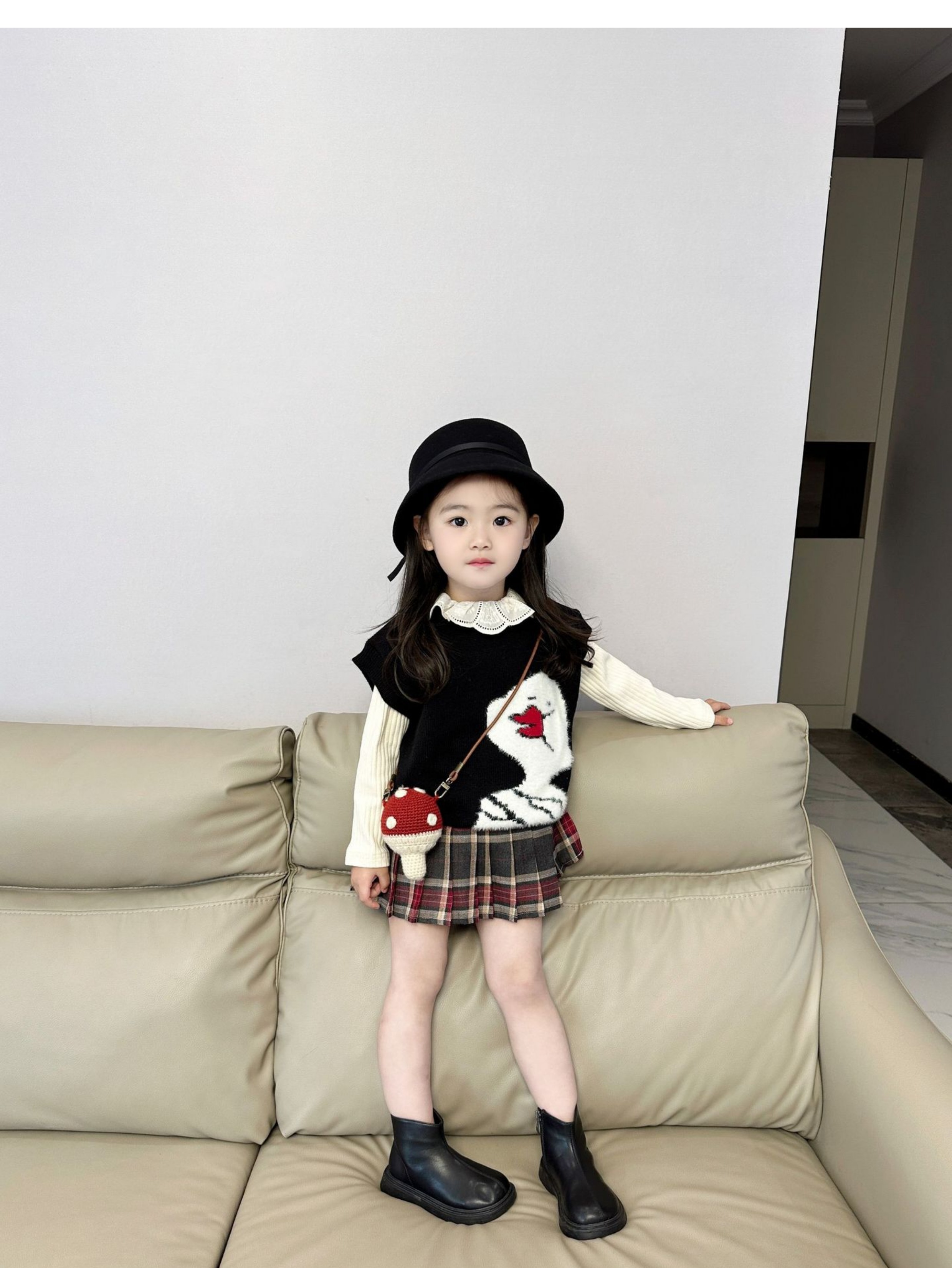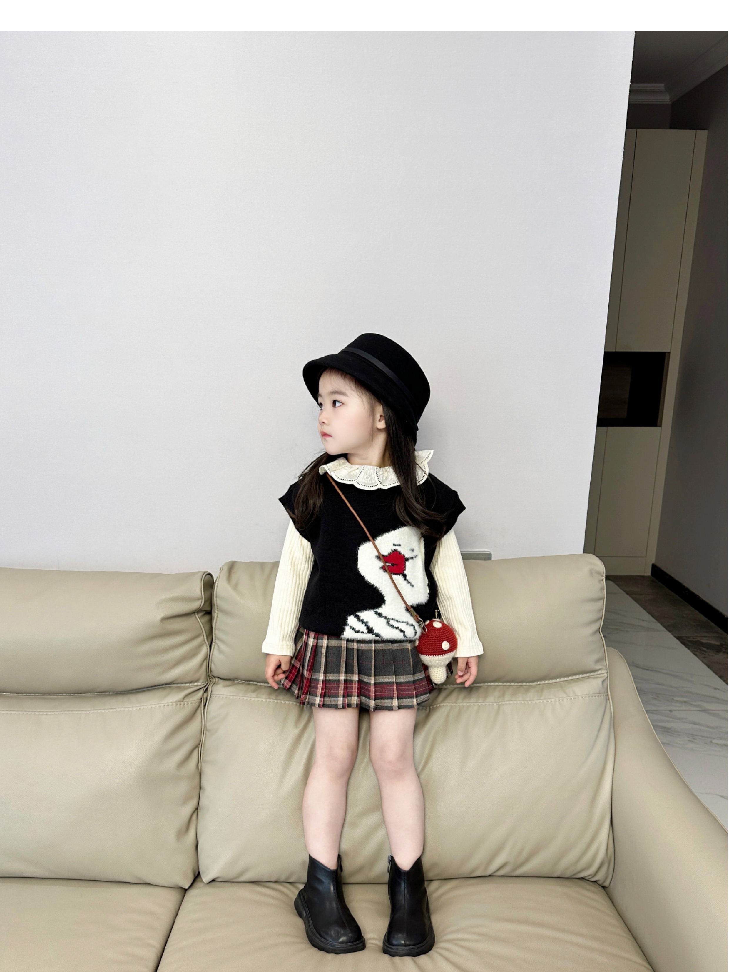 女童针织套装2024秋季韩版毛线马甲背心长袖翻领打底衫百褶裙短裙