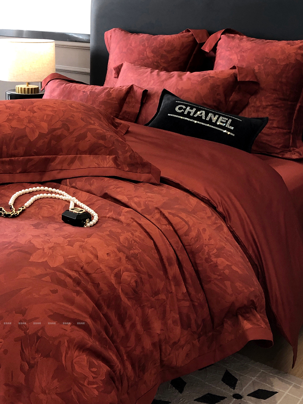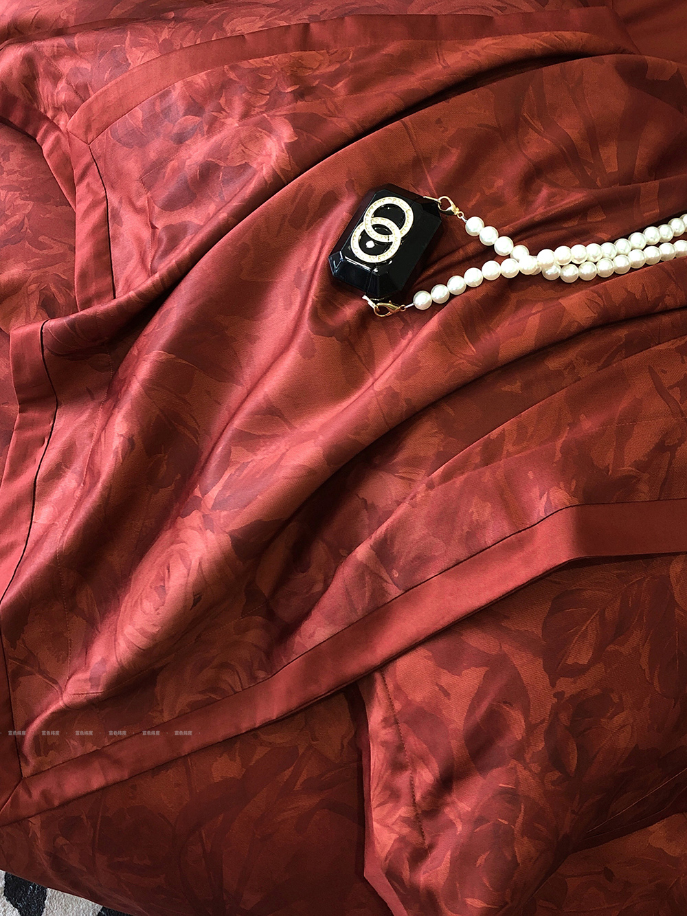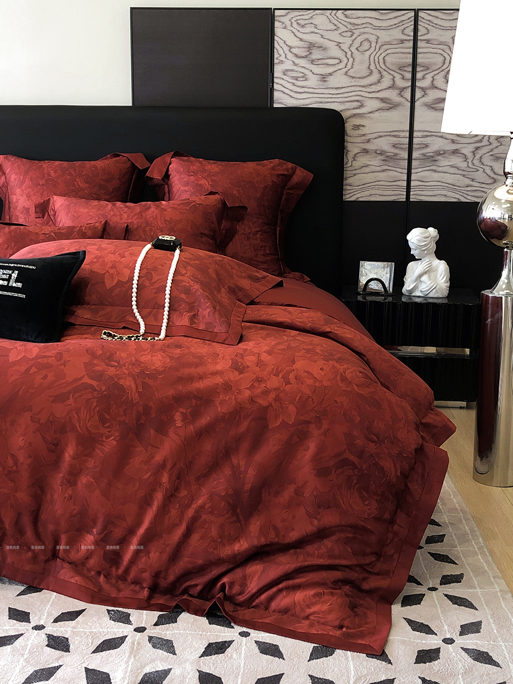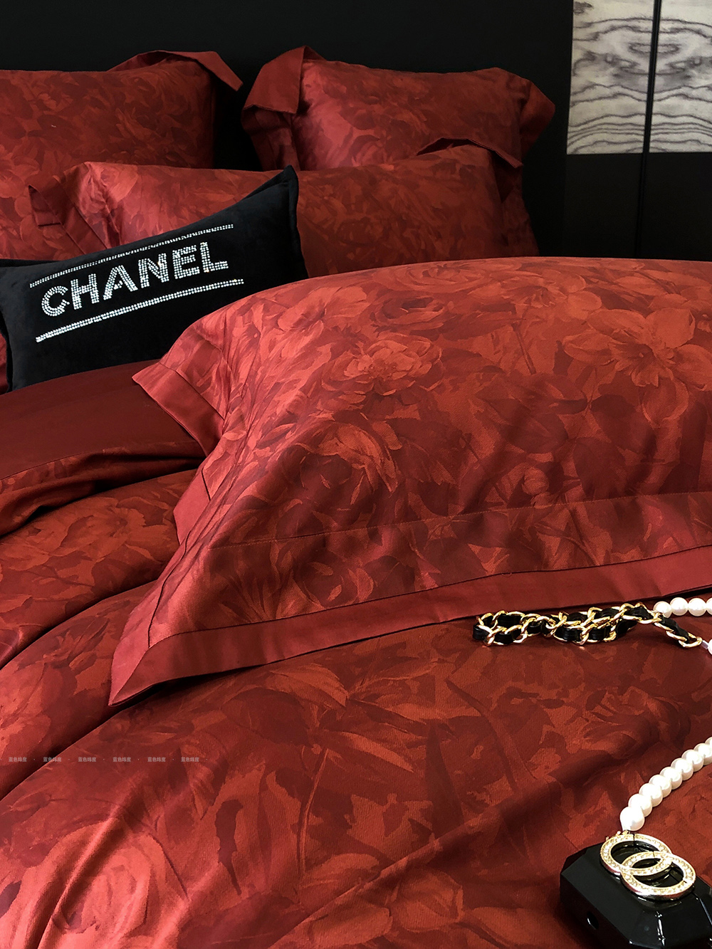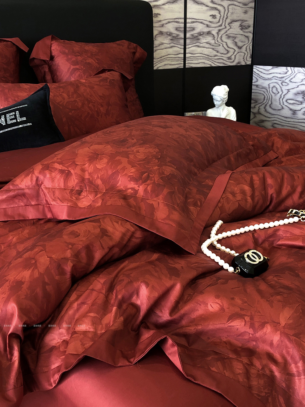 爱之蔓轻奢风数码印花婚庆四件套全棉酒红色结婚被套床单床上用品