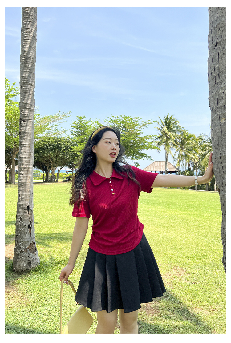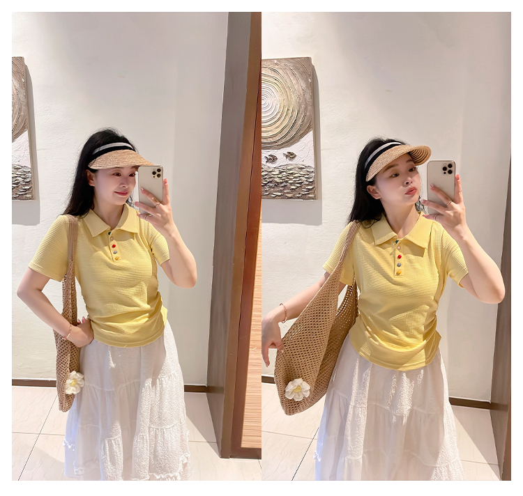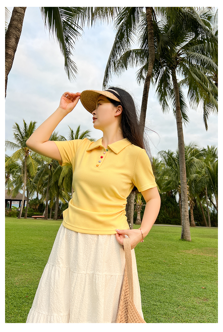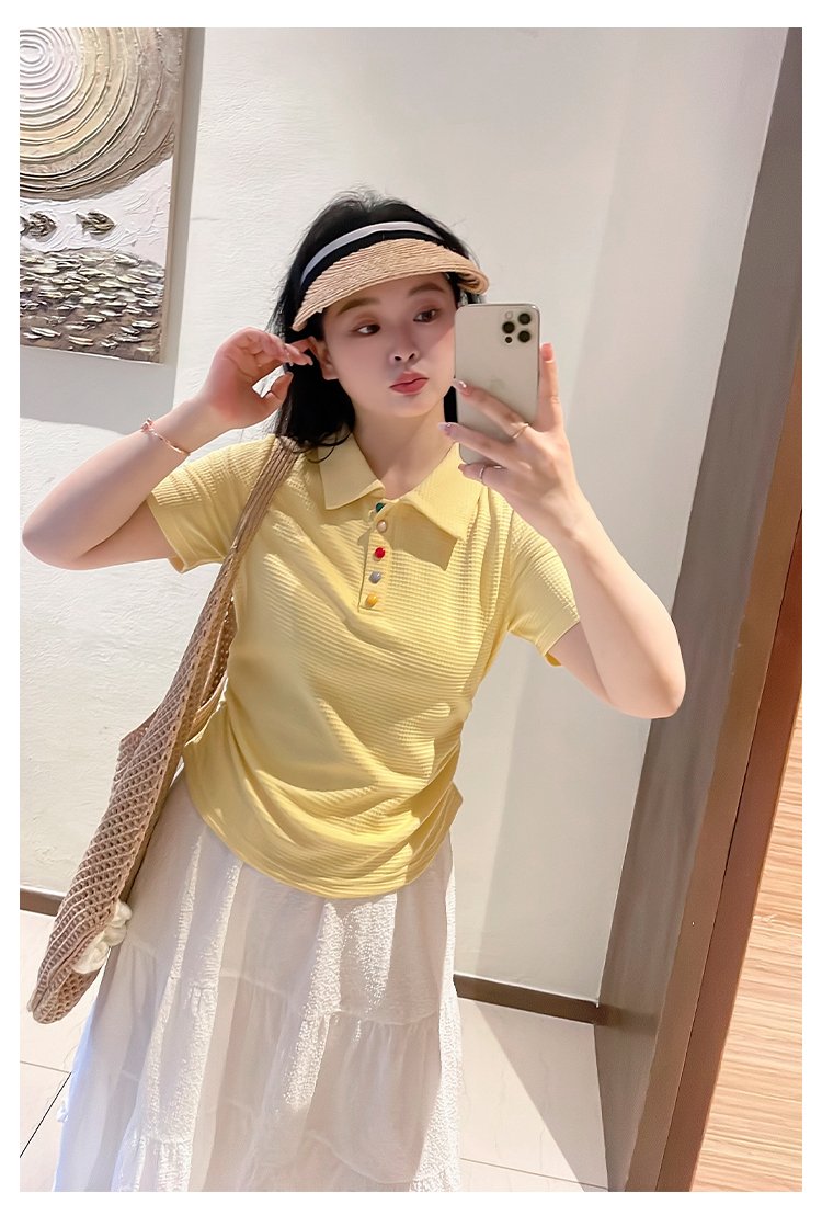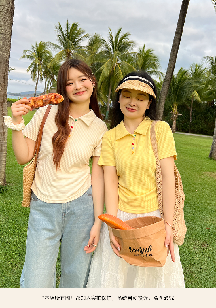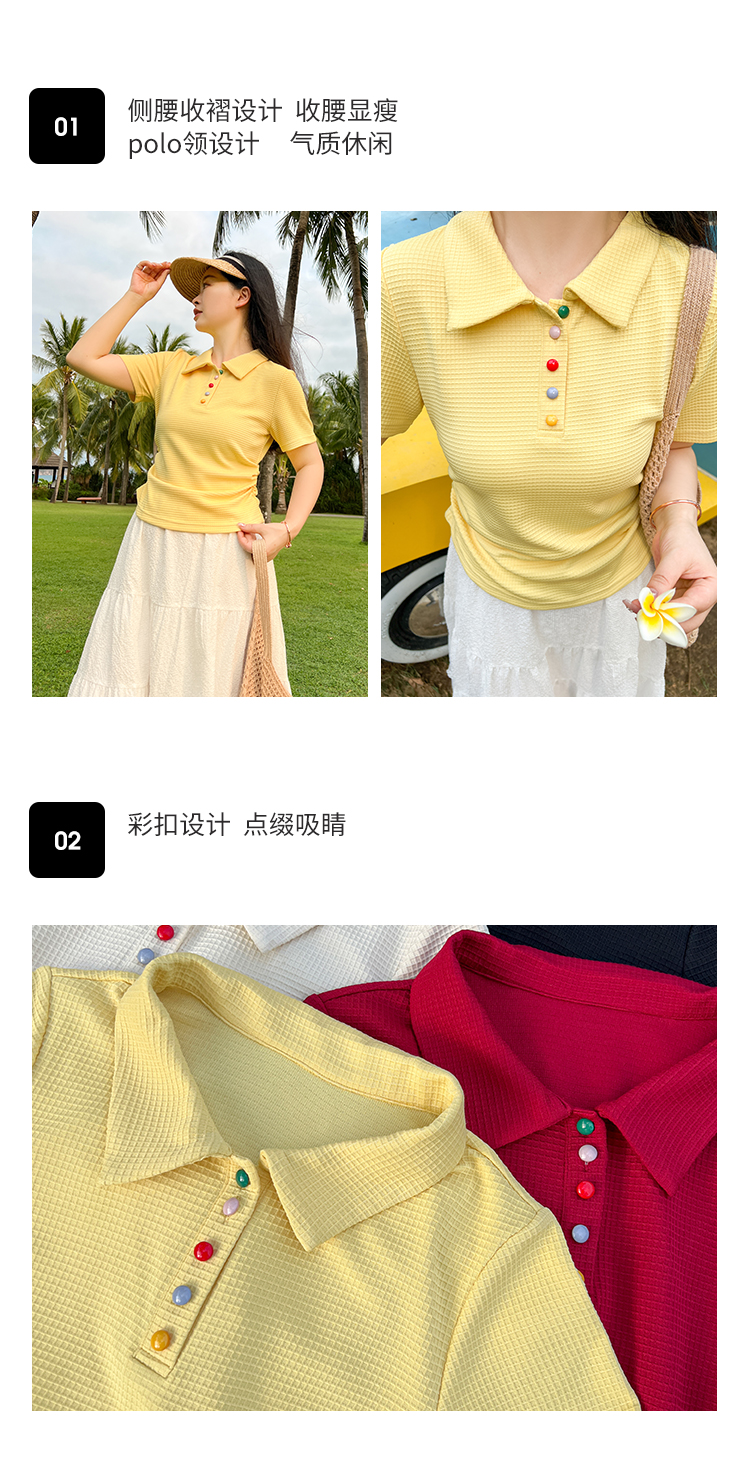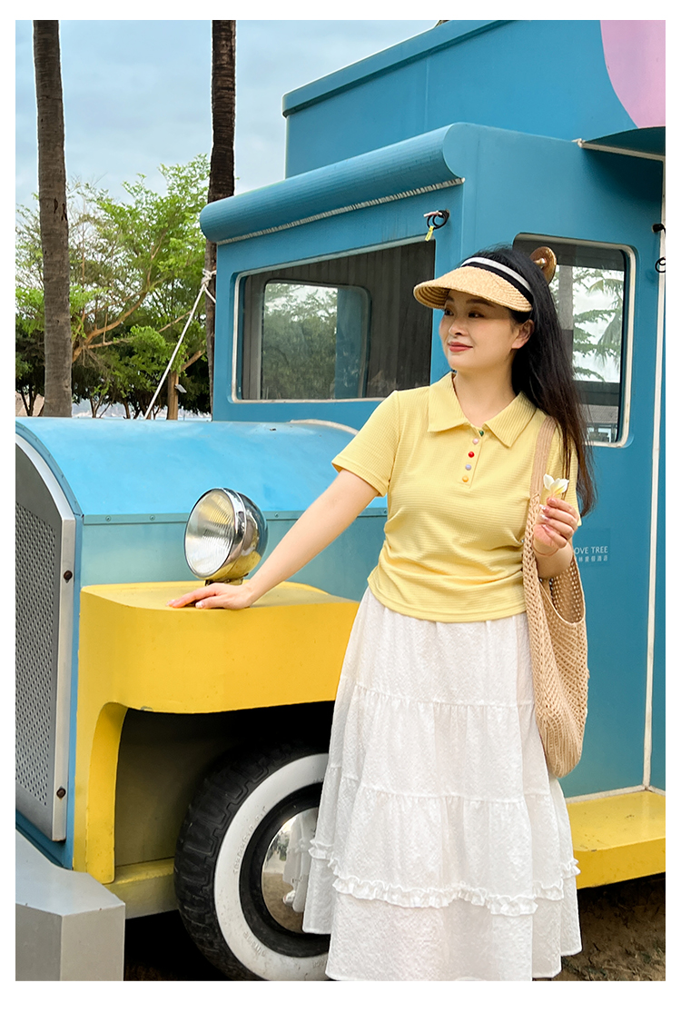 DM100大码百分百2025年夏季新款女装休闲收腰上衣华夫格polo领T恤