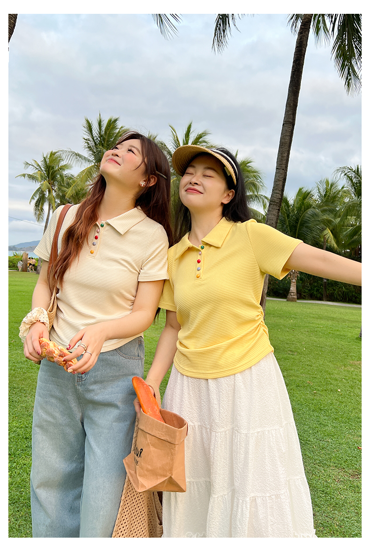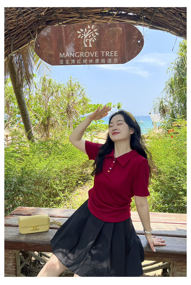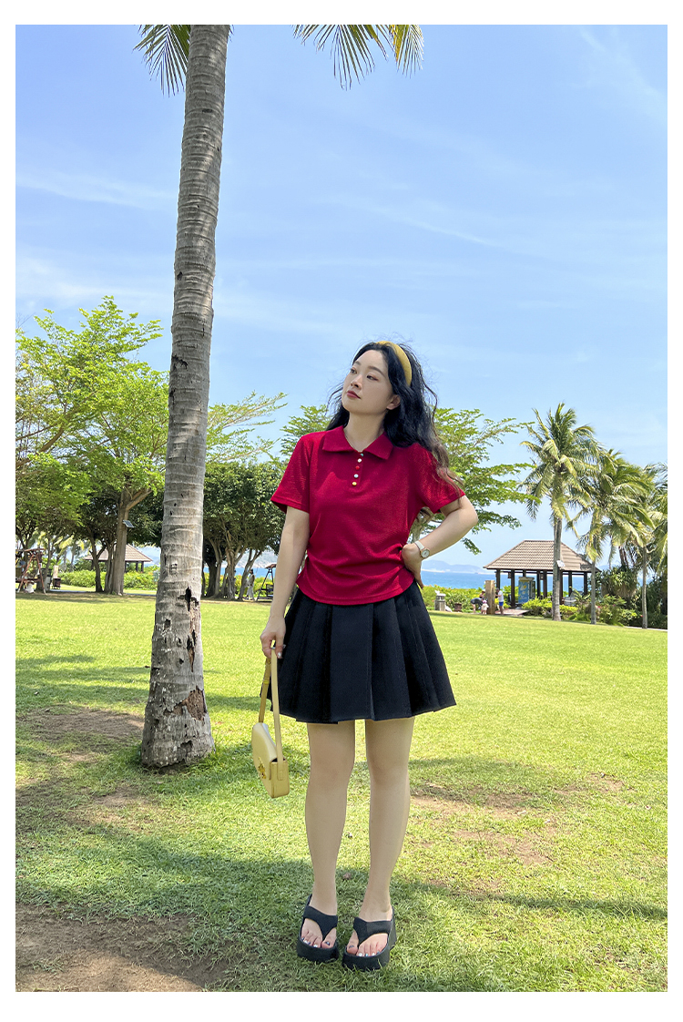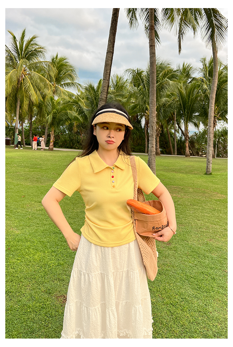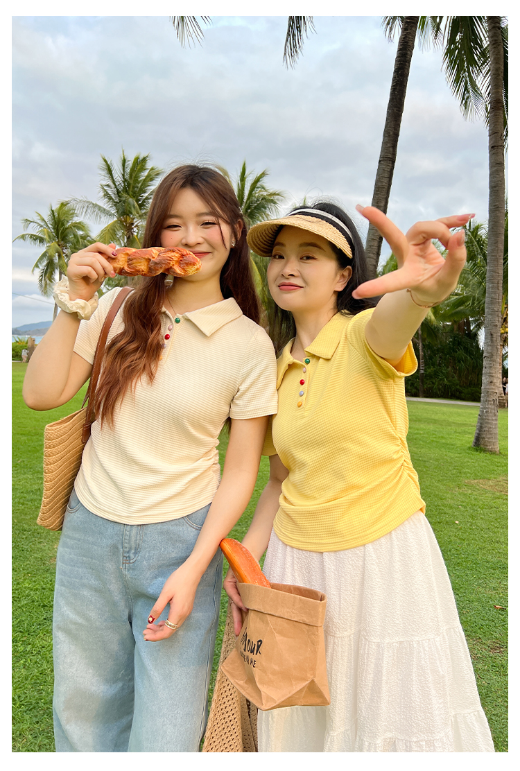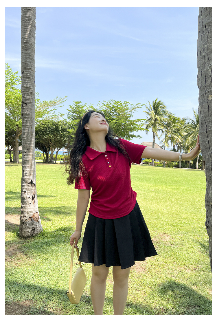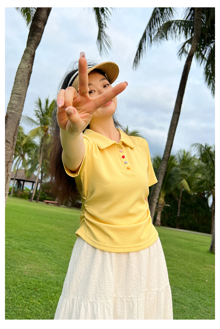 DM100大码百分百2025年夏季新款女装休闲收腰上衣华夫格polo领T恤