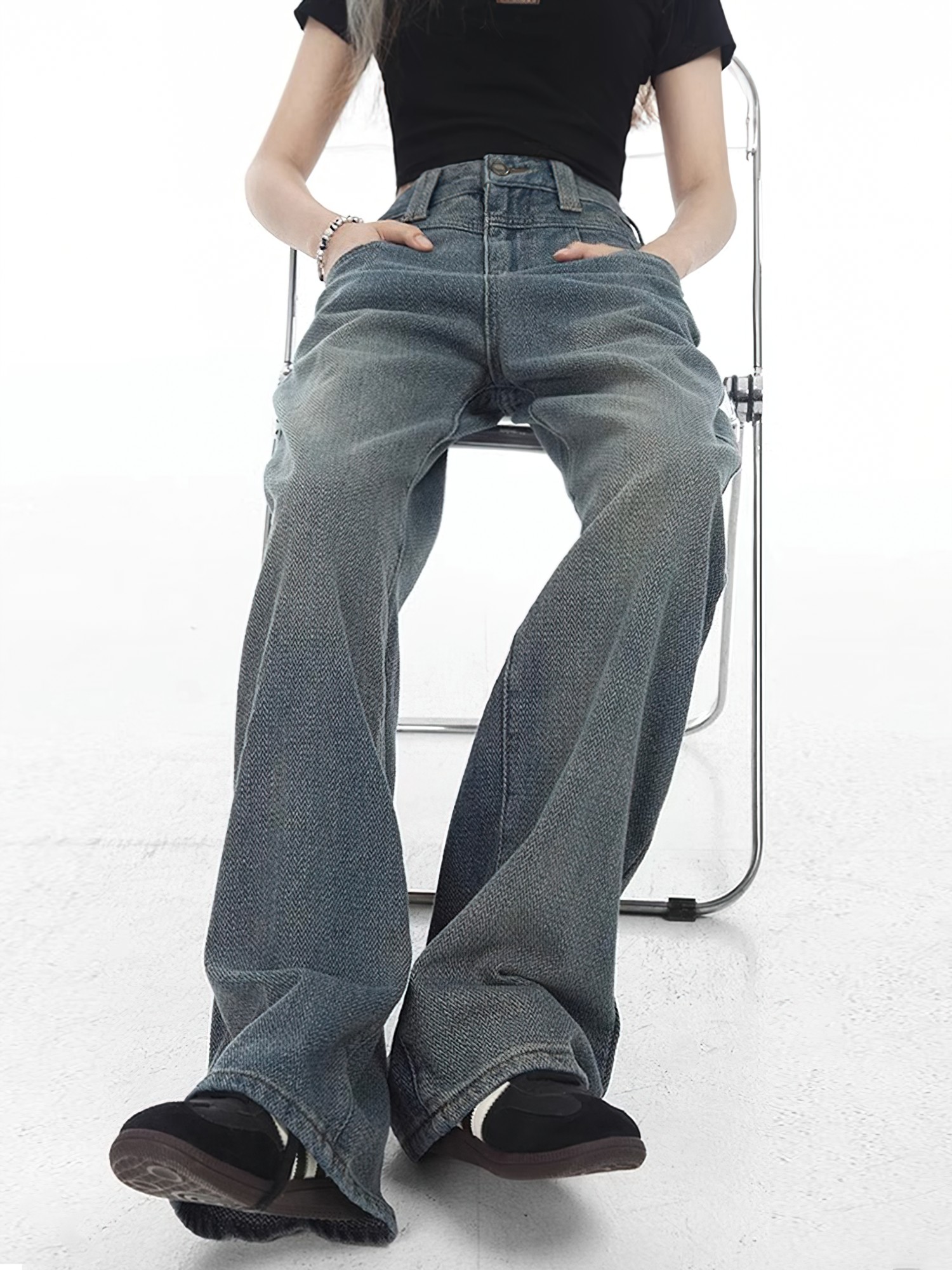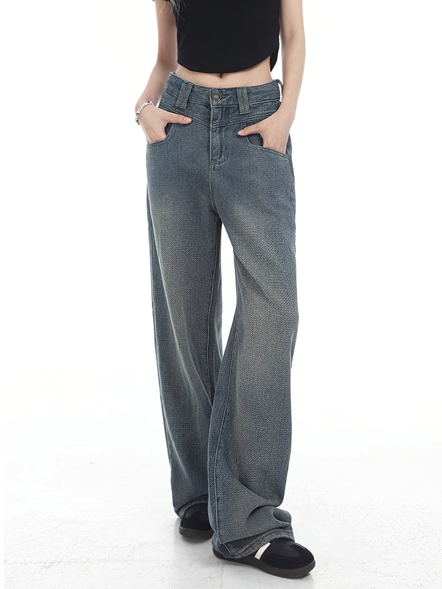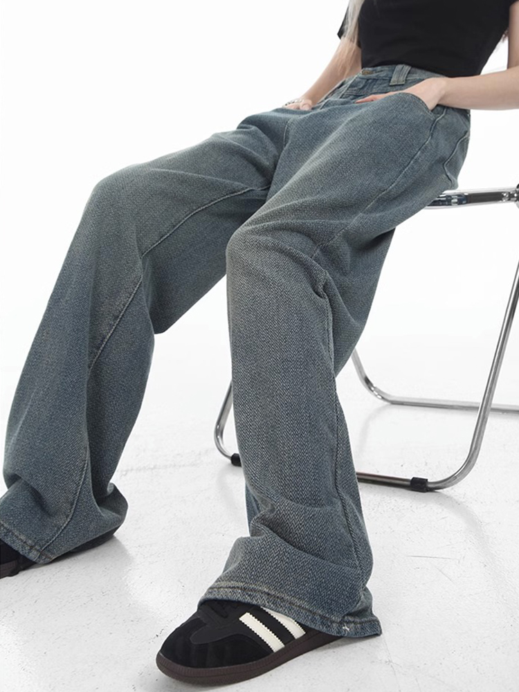 美式复古蓝直筒牛仔裤女春季新款胖妹妹mm高腰遮胯显瘦阔腿长裤子