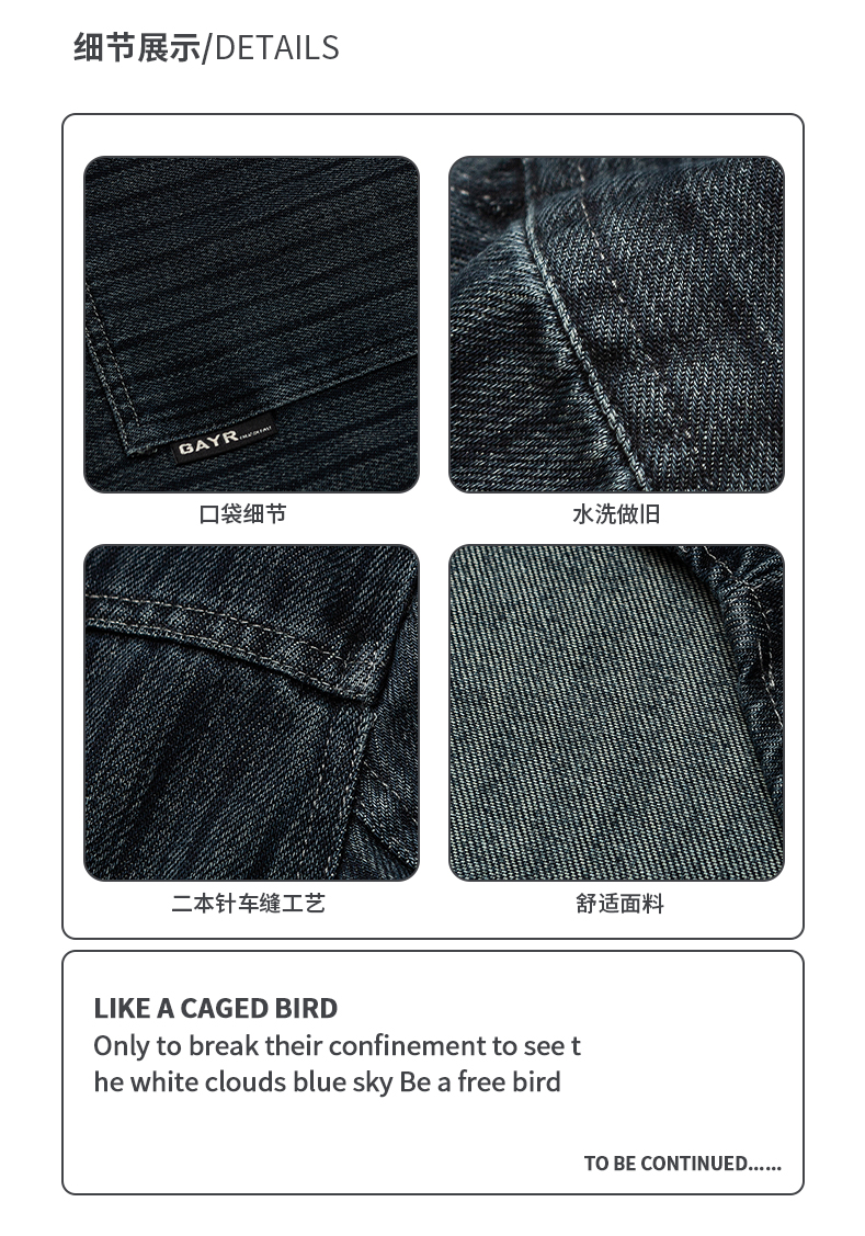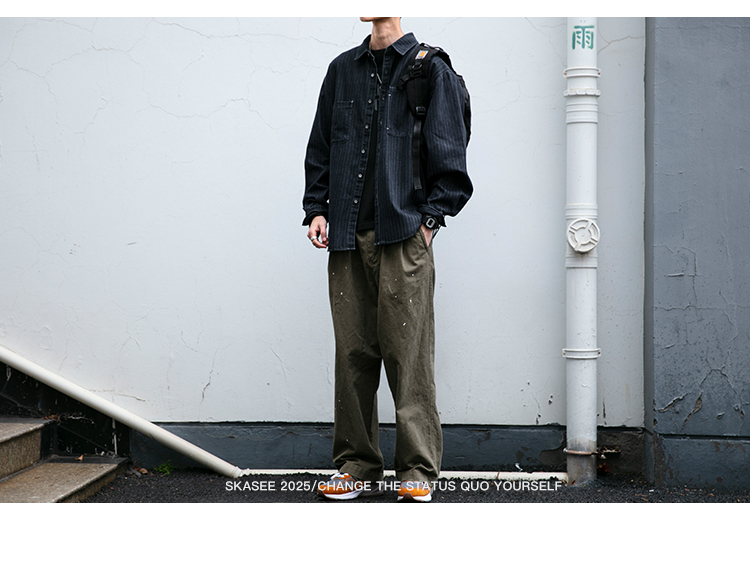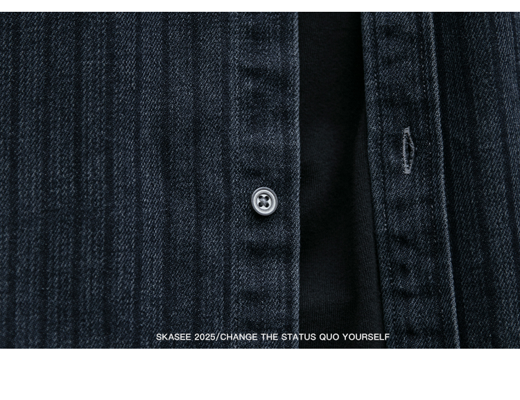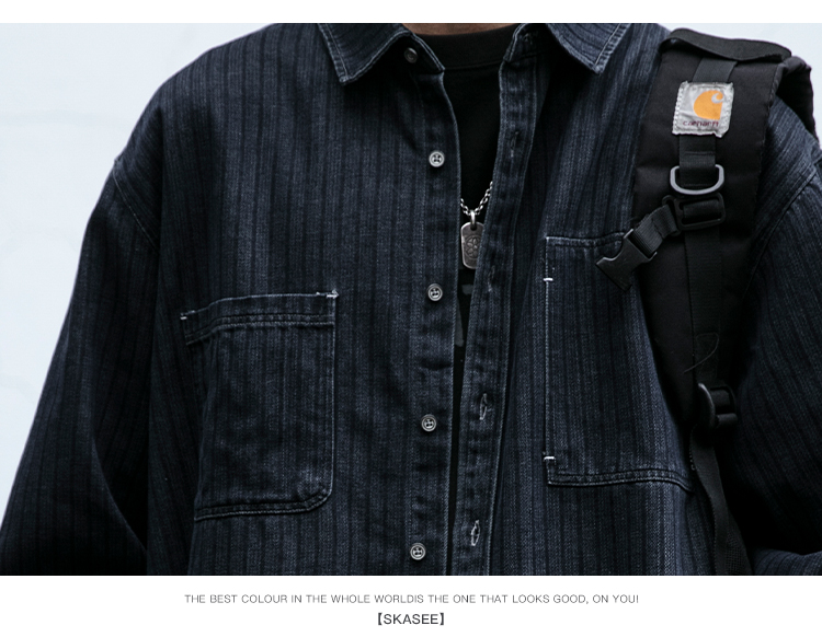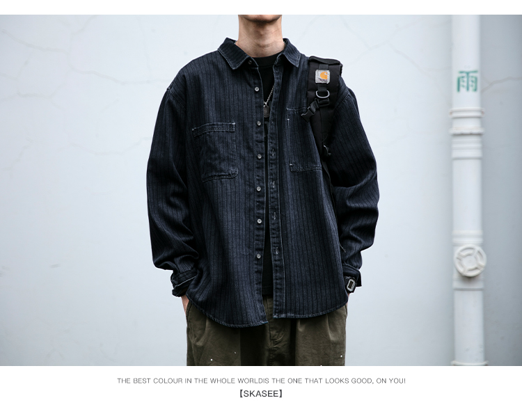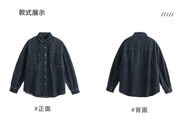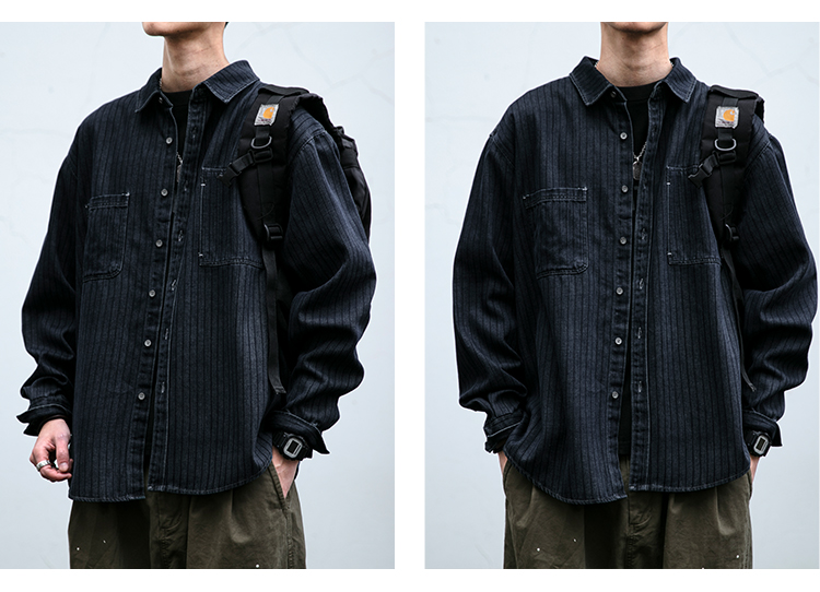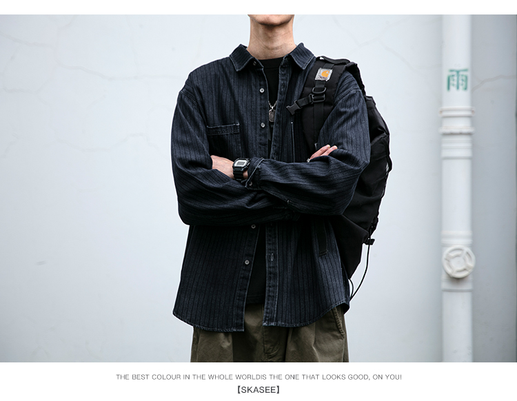 美式复古做旧水洗质感牛仔工装条纹衬衫男春秋休闲宽松长袖外套潮