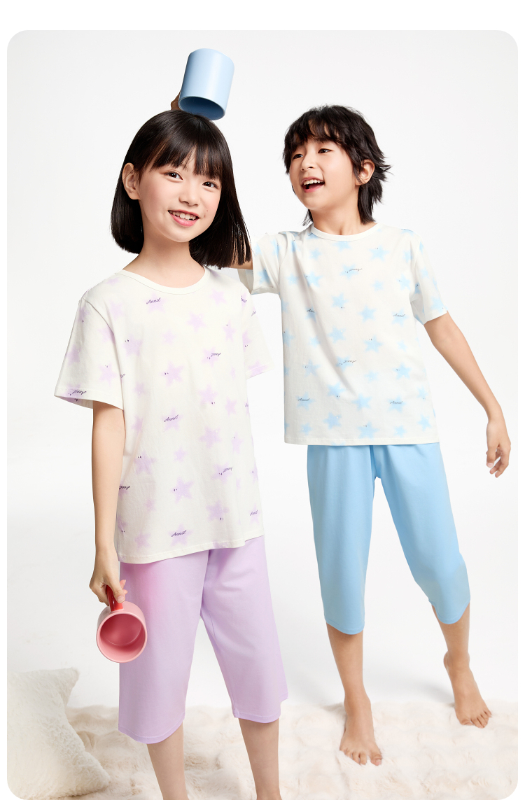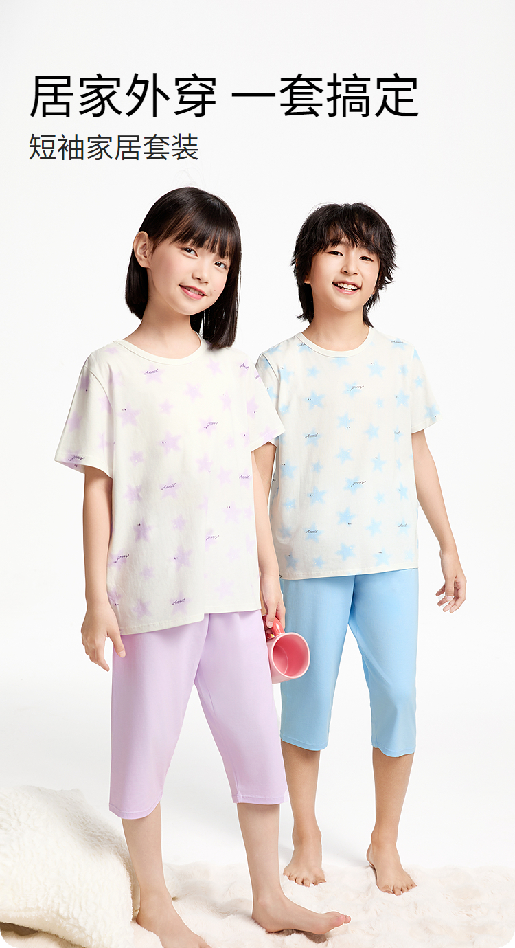 安奈儿童装男童女童短袖家居服套装2025夏新款外穿弹力宽松睡衣