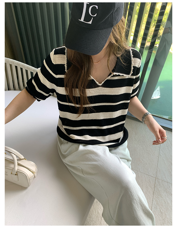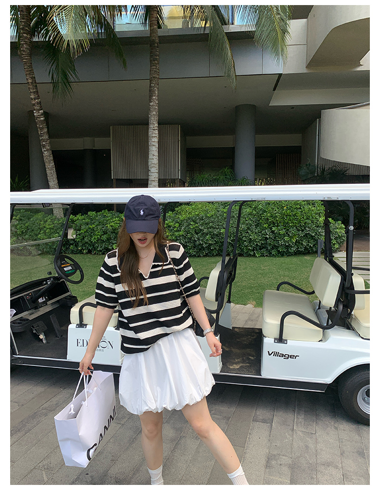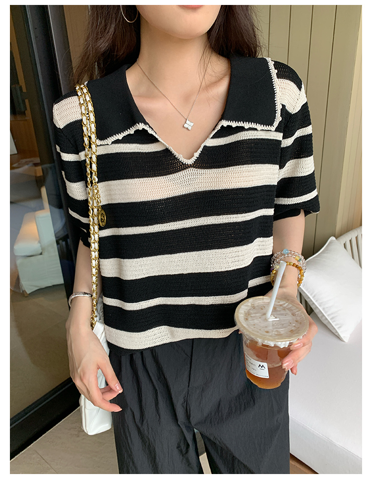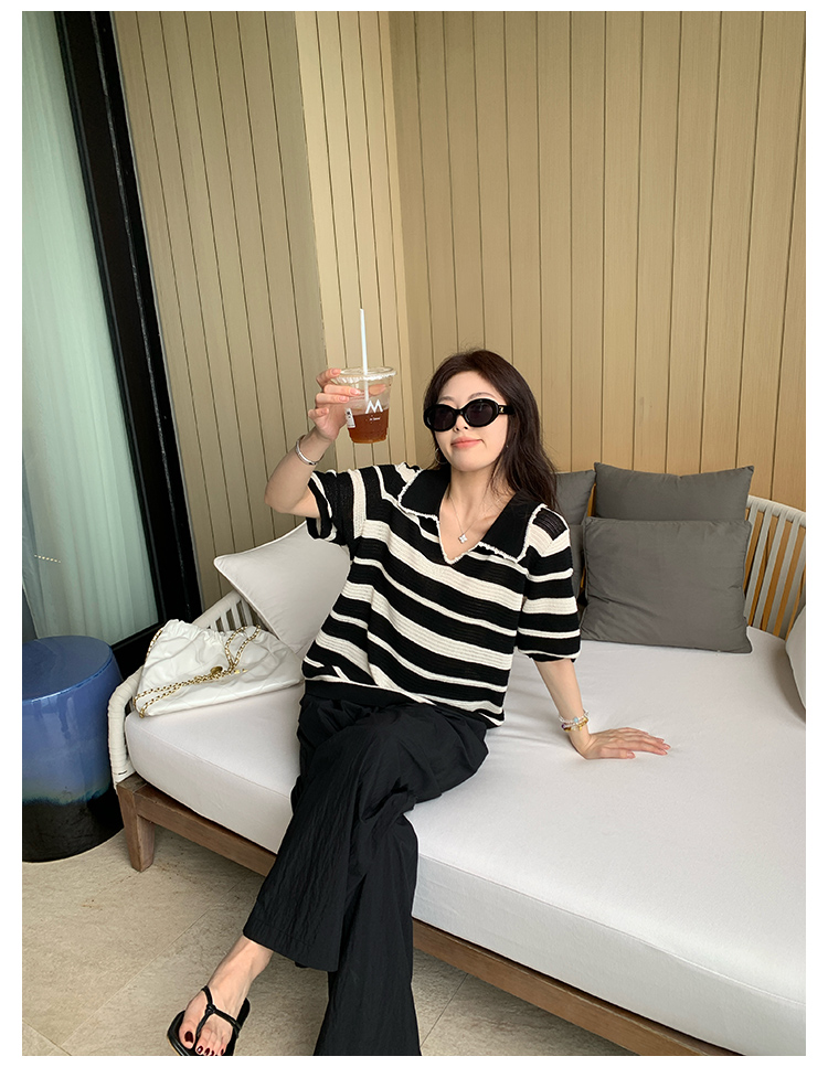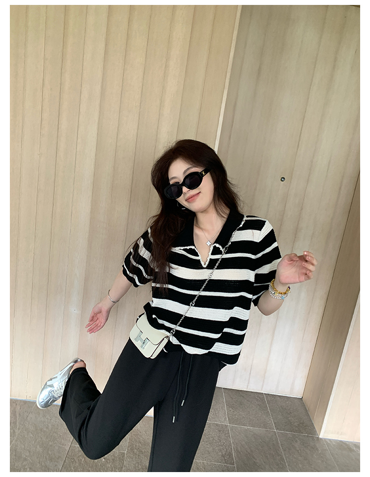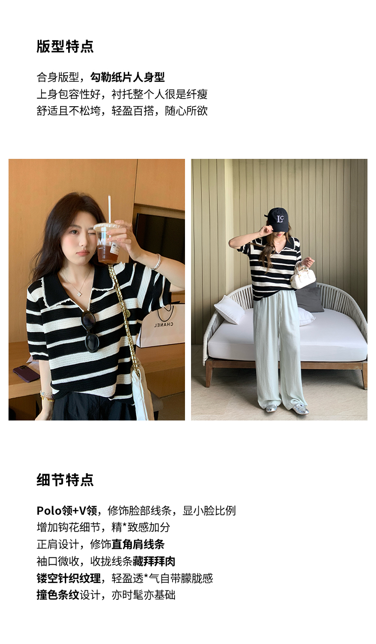 NAZ那子大码 高弹冰丝条纹Polo针织衫胖mm撞色拼接镂空短袖上衣女