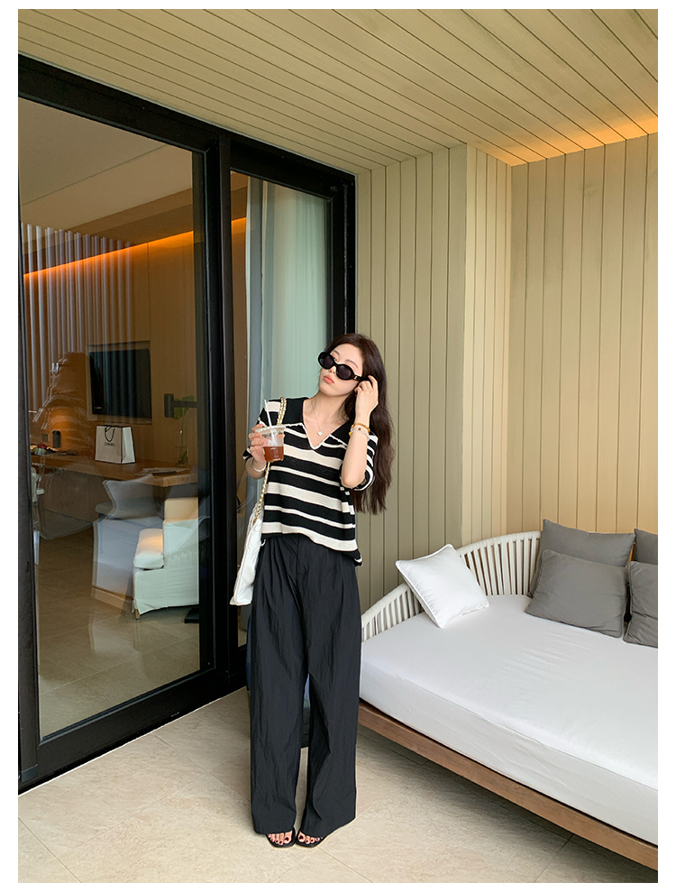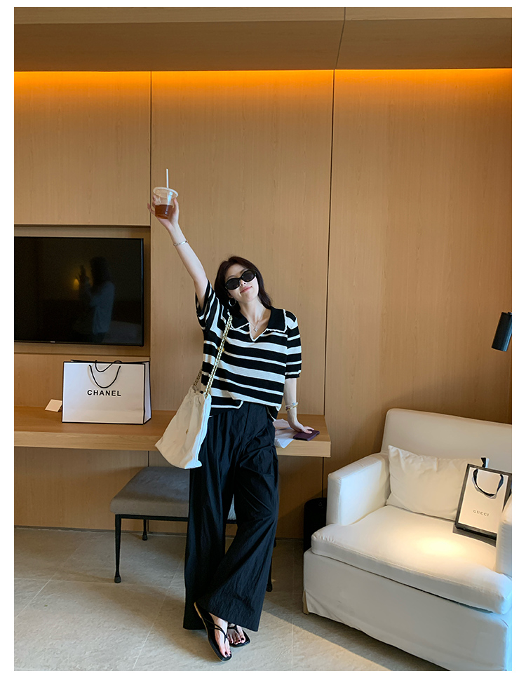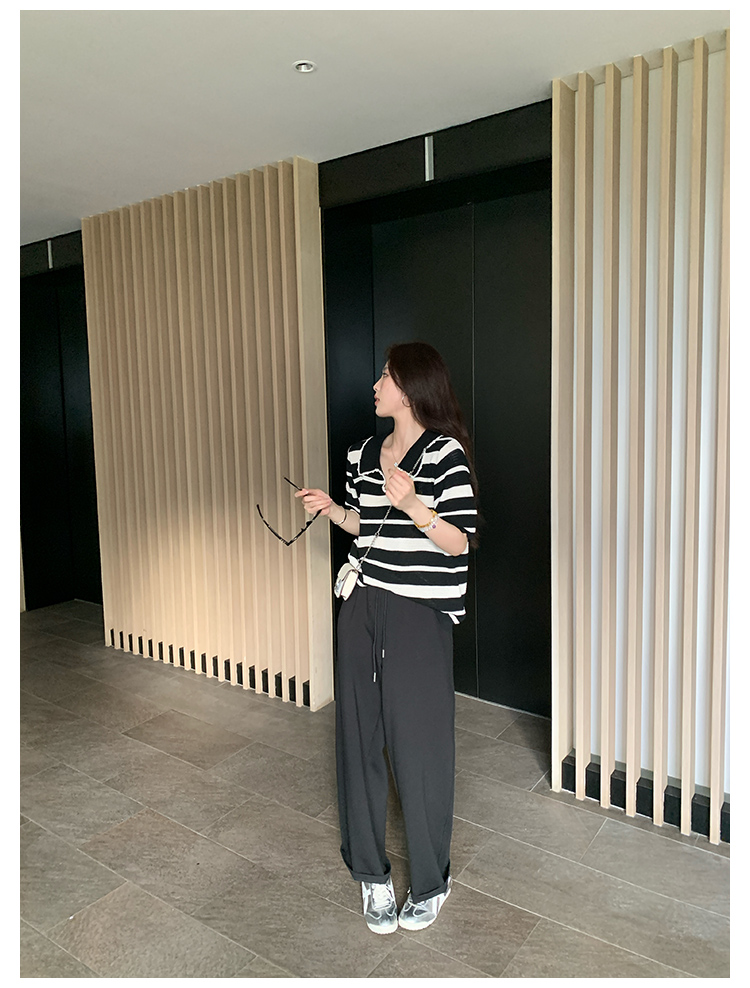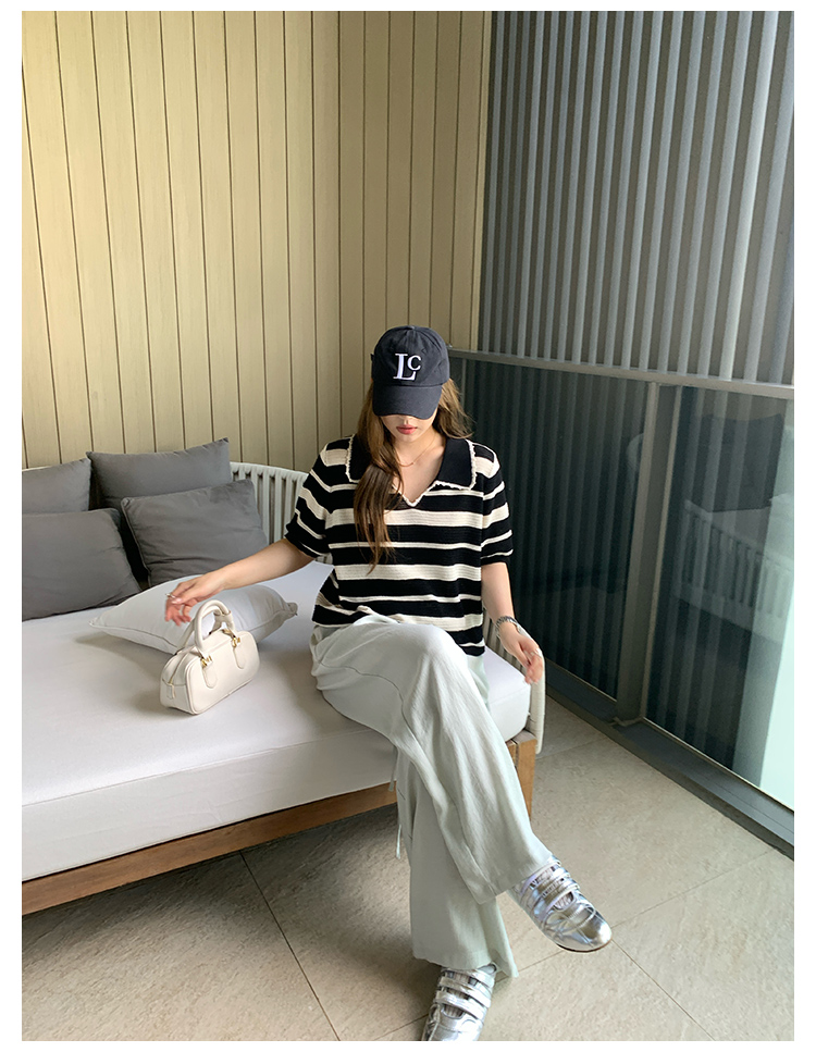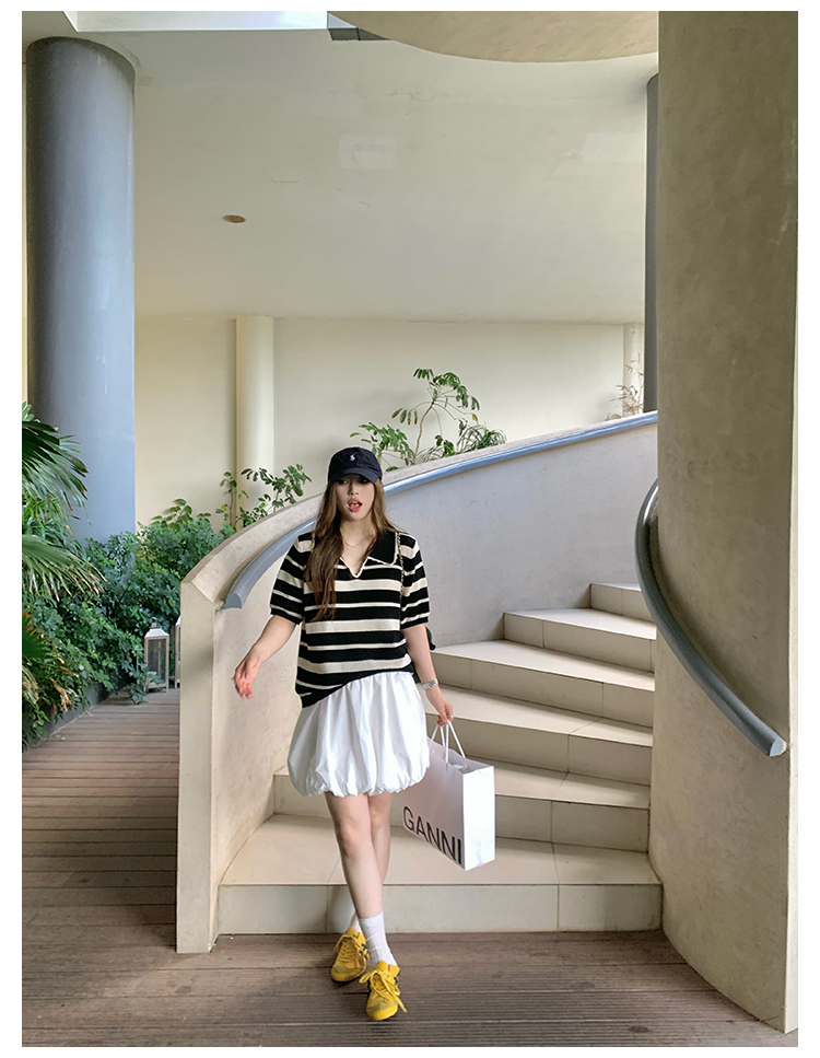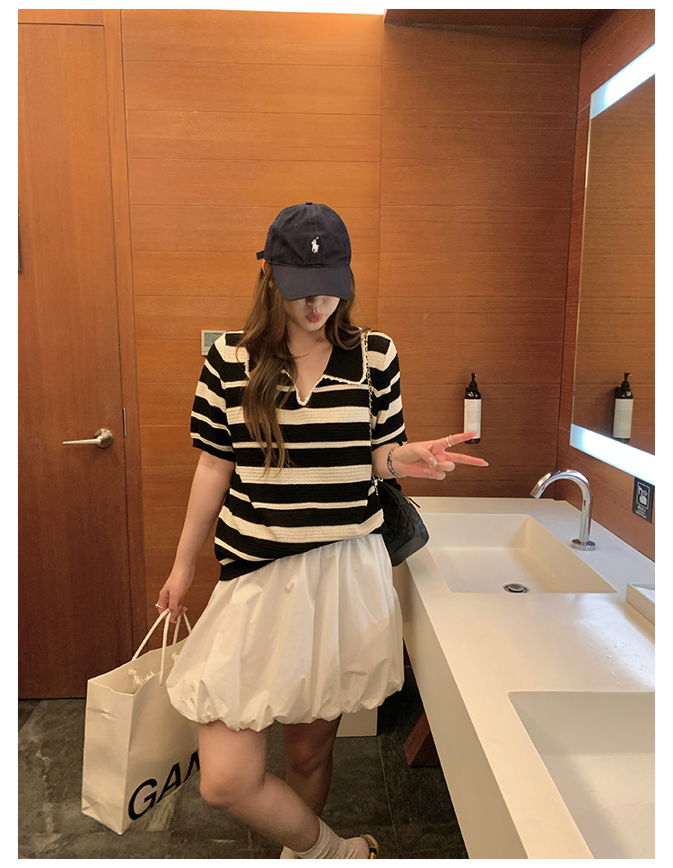 NAZ那子大码 高弹冰丝条纹Polo针织衫胖mm撞色拼接镂空短袖上衣女