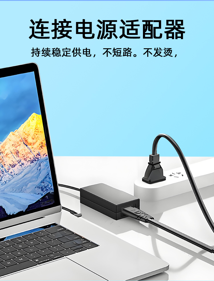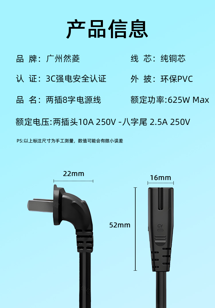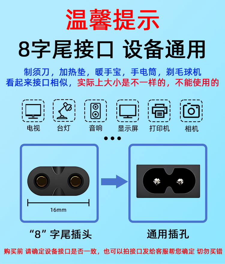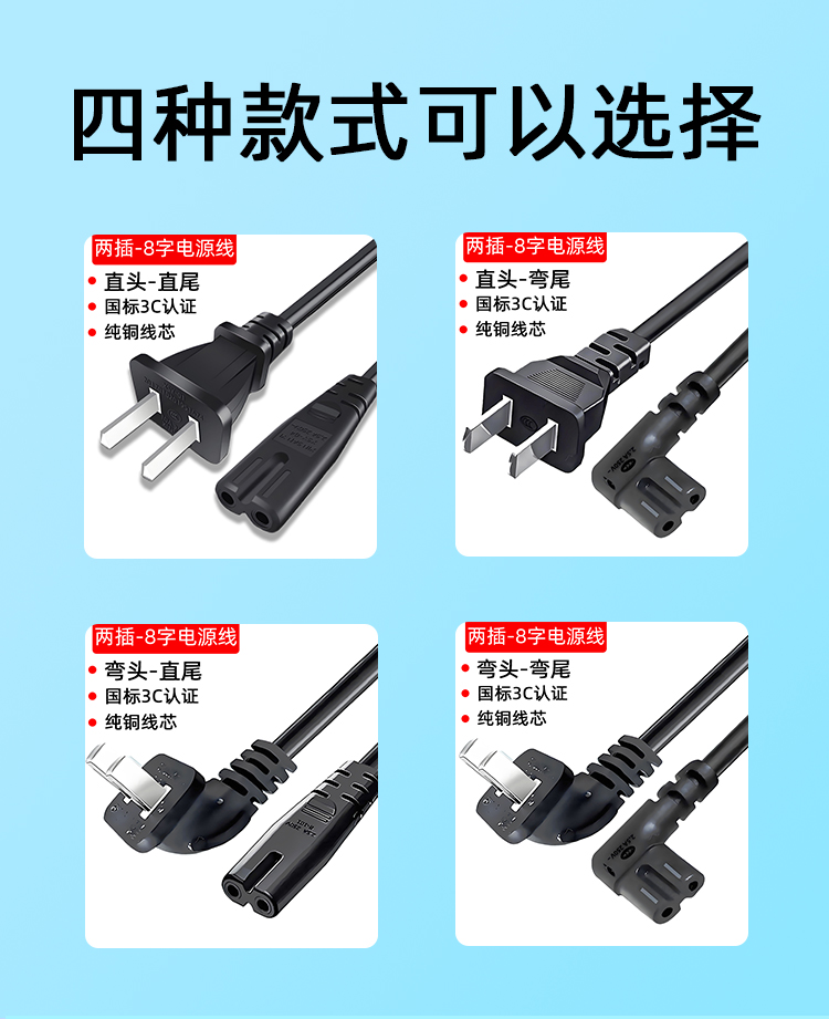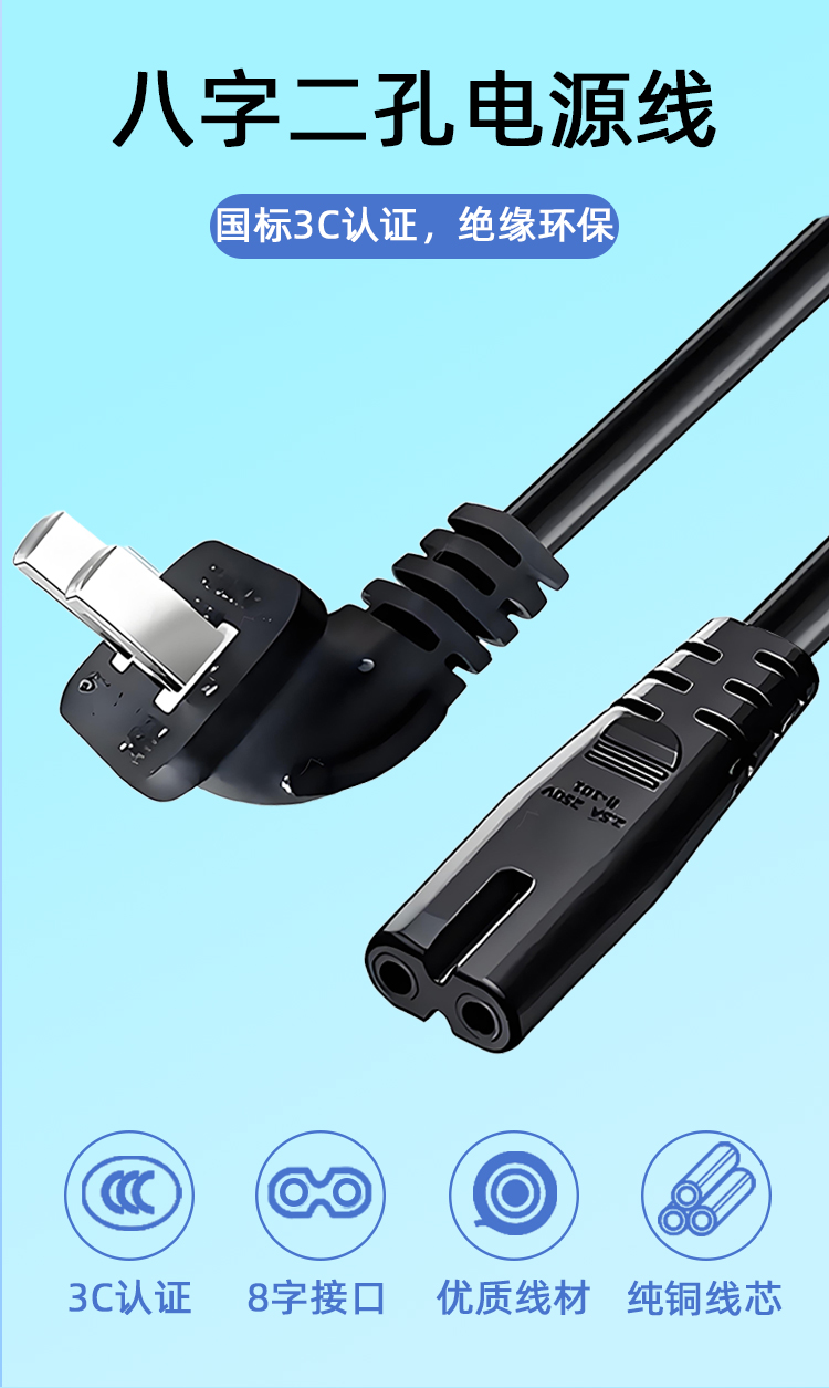 国标两插弯头8字尾电源线2芯双孔投影仪显示器携迷你小冰箱充电线