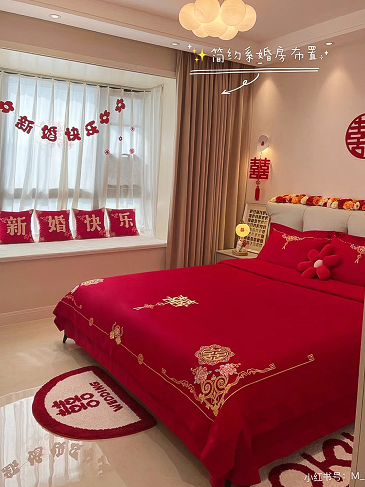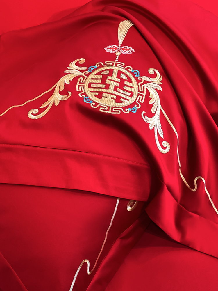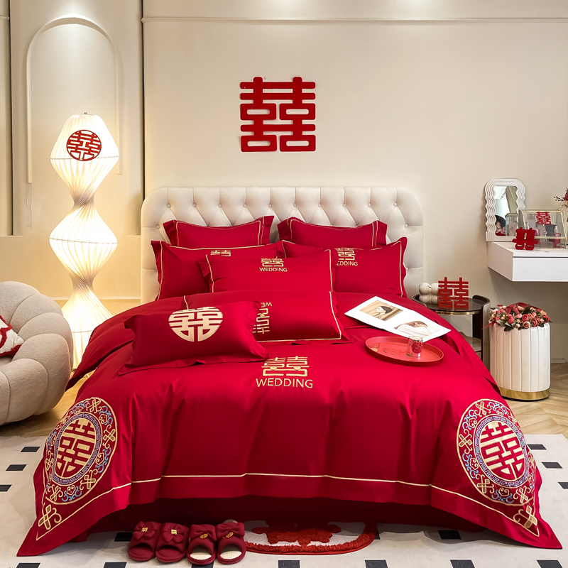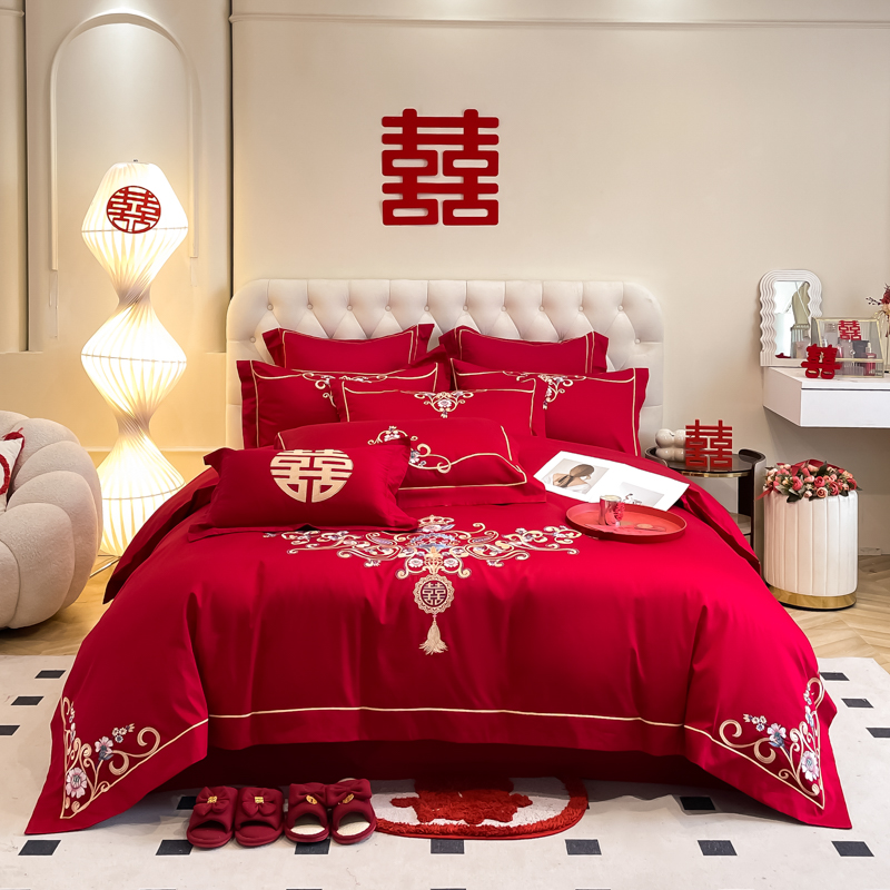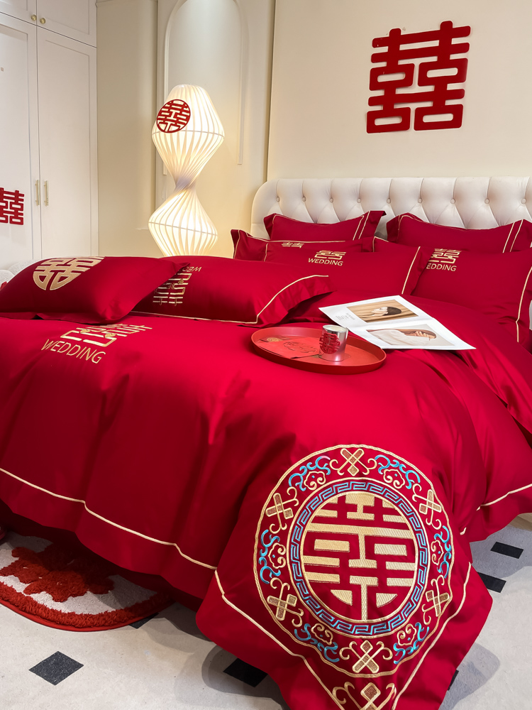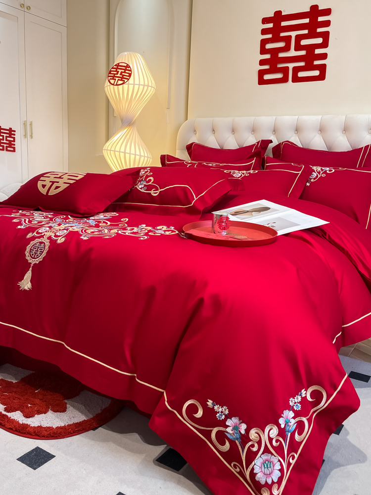 高档160支长绒棉结婚四件套纯棉陪嫁被套红色全棉床单新婚庆床品8