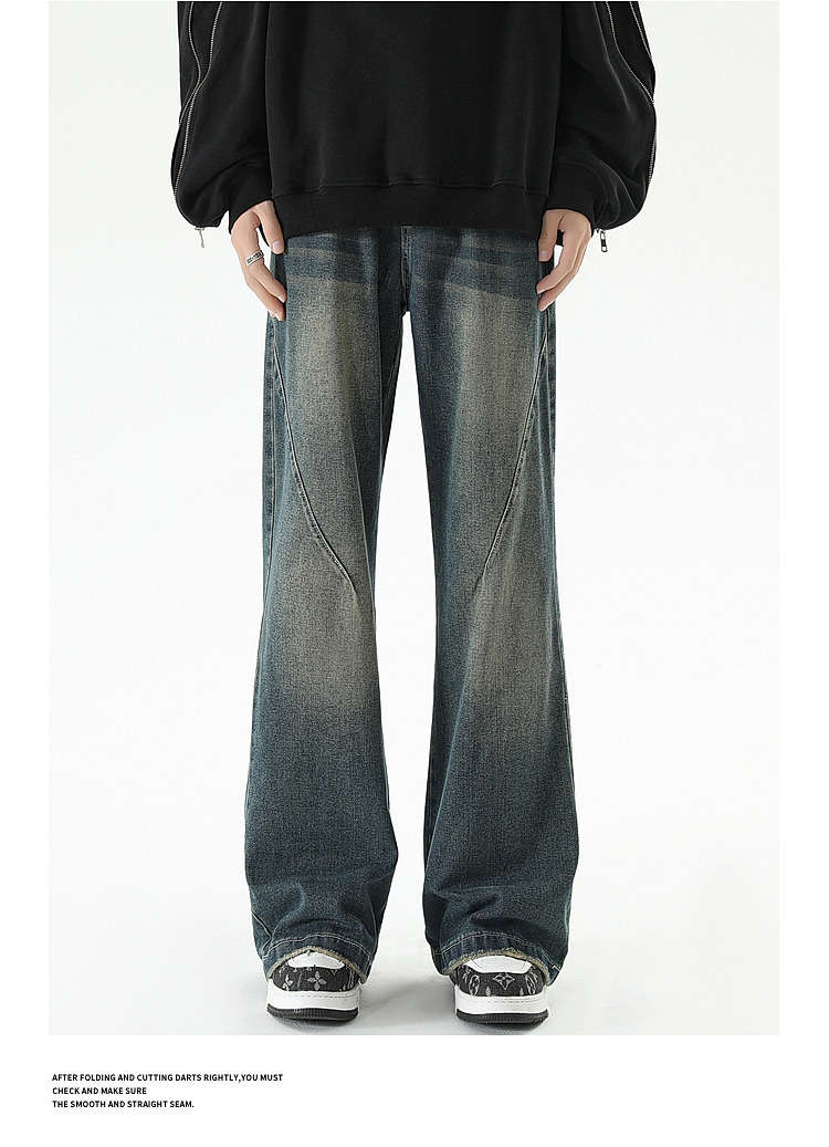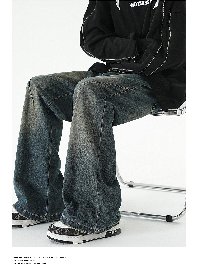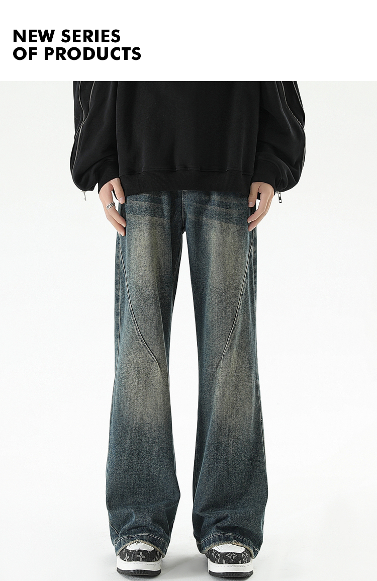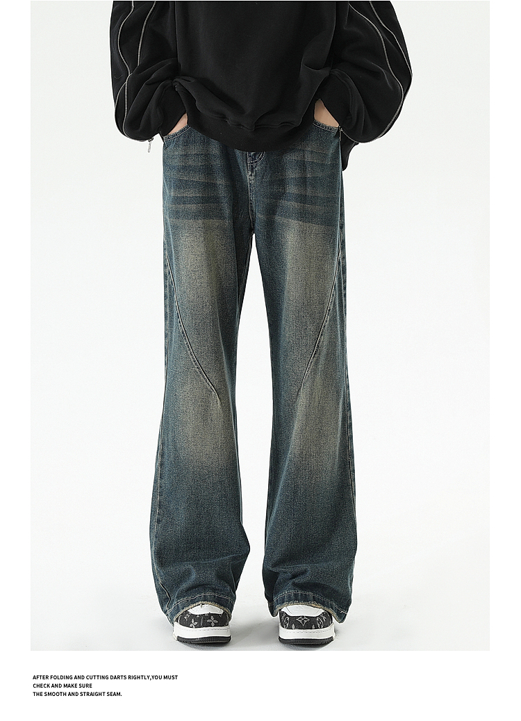 悟空有货美式复古做旧水洗微喇牛仔裤男cleanfit街头宽松直筒长裤