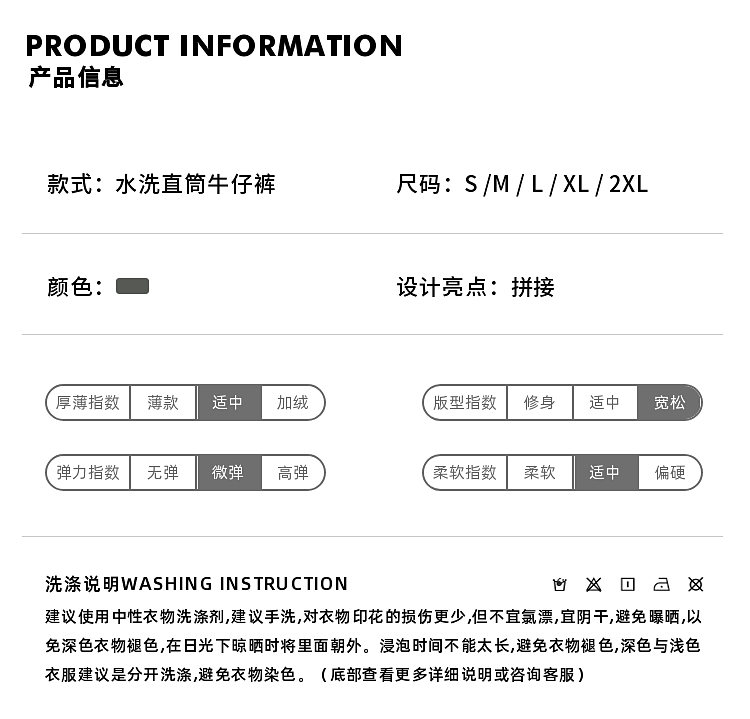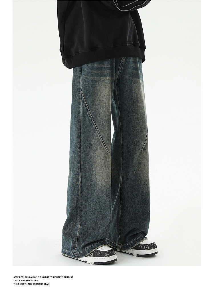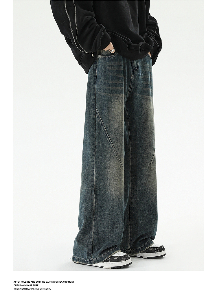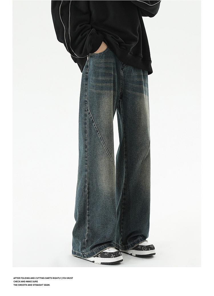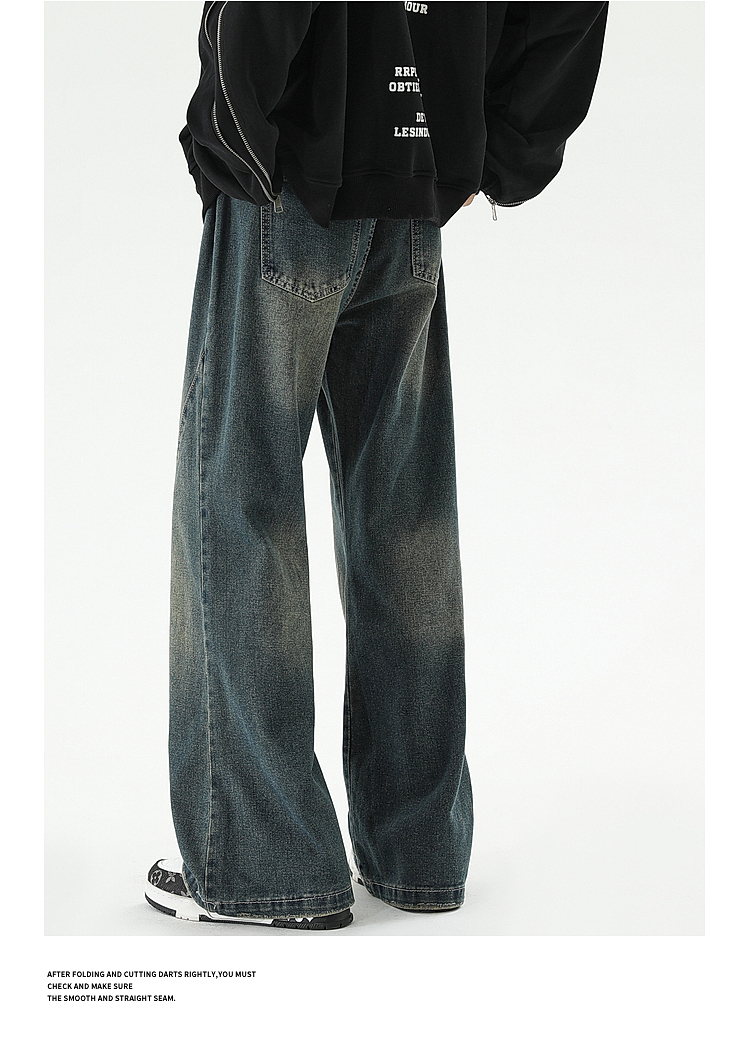 悟空有货美式复古做旧水洗微喇牛仔裤男cleanfit街头宽松直筒长裤